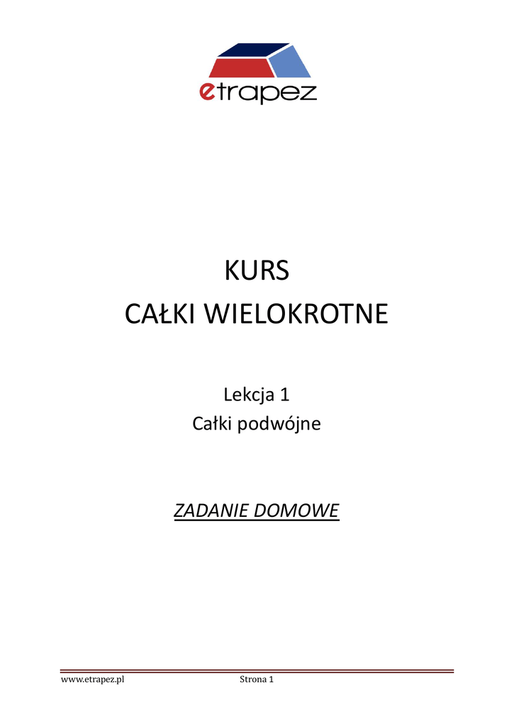 KURS CAŁKI WIELOKROTNE Lekcja 1 Całki podwójne ZADANIE DOMOWE www.etrapez.pl Strona 1 Część 1: TEST Zaznacz poprawną odpowiedź (tylko jedna jest prawdziwa). Pytanie 1 Obszarem całkowania w całce podwójnej jest: a) obszar trójwymiarowy b) obszar dwuwymiarowy c) przedział liczbowy d) funkcja dwóch zmiennych Pytanie 2 Obszar normalny to taki obszar… a) w którym funkcja ogranicza obszar tylko od dołu b) w którym funkcja ogranicza wykres tylko od góry c) w którym jedna funkcja ogranicza wykres od dołu, a druga od góry d) który jest bryłą Pytanie 3 Współrzędnych biegunowych używamy, gdy obszarem całkowania jest… a) Koło b) Bryła c) Obszar normalny d) Prostokąt www.etrapez.pl Strona 2 Pytanie 4 Obszarem całkowania całki dxdy ( x y) 3 , gdzie D ograniczone jest: x=2, x=4, y=1 i y=3 jest: D a) okrąg b) trójkąt c) hiperbola d) prostokąt Pytanie 5 Całka 1 2 y 0 y dy 0 a) b) c) d) f ( x, y )dx po zmianie kolejności całkowania ma postać: x 2 dx f ( x, y)dy dx 1 0 1 0 x2 1 0 0 x2 1 0 1 x2 dx dx dx 2 x2 f ( x, y )dy 0 1 x 2 2 0 f ( x, y )dy dx f ( x, y )dy f ( x, y )dy f ( x, y )dy 0 www.etrapez.pl Strona 3 Pytanie 6 Do obliczania pól powierzchni w przestrzeni potrzebna jest znajomość obliczania: a) pochodnych cząstkowych b) pól figur płaskich c) objętości brył d) pól brył Pytanie 7 Pole figury ograniczonej linią ( x 2 y 2 )2 2 y3 możemy obliczyć… a) Korzystając ze wzoru na objętość bryły b) Korzystając ze wzoru na pole powierzchni bryły c) Korzystając ze współrzędnych biegunowych d) Wyznaczając funkcję y z równania Pytanie 8 Całka z funkcji o wartościach nieujemnych jest na pewno: a) ujemna b) dodatnia c) nieujemna d) niedodatnia www.etrapez.pl Strona 4 Pytanie 9 Obliczanie całek podwójnych stosujemy podczas obliczania : a) pochodnych cząstkowych b) objętości brył c) długości krzywej Pytanie 10 Całkę podwójną zamieniamy możemy zamienić na całki iterowane, gdy: a) Zawsze b) Liczymy objętość bryły c) Całkujemy po obszarze normalnym www.etrapez.pl Strona 5 Część 2: ZADANIA Zad.1 Oblicz całkę podwójną po wskazanych obszarach: xy dxdy, x 0,1 , y 1,1 2 a). D b). y e dxdy, 1 x 0,1 y 2 3 x D (e c). x y 3x)dxdy, 0 x 1, 1 y 3 D d). xy sin( xy )dxdy, 0 x 2 , 0 y 2 2 D Zad.2 Oblicz całkę podwójną: (2 x a). 3 4 y)dxdy, gdzie D jest obszarem ograniczonym krzywymi y 1 x2 , y x 1 . D b). (1 x y)dxdy, gdzie D jest obszarem ograniczonym krzywymi y x , y 4 . 2 D (8x y )dxdy, gdzie D jest obszarem ograniczonym krzywymi y x 2 c). 2 3, y 1 x . D d). xy dxdy, gdzie D jest obszarem ograniczonym krzywymi y 2 3 x, x 1, x y 0 D e). ( x 2 y)dxdy, gdzie D jest obszarem x2 y 2 1 D f). ( x 2 y 2 )dxdy, gdzie D jest obszarem x 2 y 2 2 D g). x 2 y 2 dxdy, gdzie D jest obszarem ograniczonym krzywymi x 0, y 0, x y 1 D www.etrapez.pl Strona 6 h). 2 xydxdy, gdzie D jest trójkątem o wierzchołkach A (0,0), B (1,0), C (0,1) D i). (1 x y)dxdy, gdzie D jest trójkątem o wierzchołkach A (4,0), B (0, 2), C (2,0) D j). (5x 2 2 xy)dxdy, w trójkącie ograniczonym prostą x 2 y 2 i osiami współrzędnych. D Zad.3 Zmień kolejność całkowania w całce: a). b). c). d). 1 1 1 x 1 x2 0 x3 1 1 1 y 2 0 2 y dx f ( x, y)dy dx f ( x, y)dy dy f ( x, y )dx 0 1 1 1 1 x 0 x dx f ( x, y)dy dx f ( x, y)dy Zad.4 Oblicz objętość brył ograniczonych powierzchniami: a) x y z 1 i płaszczyznami układu współrzędnych b). z y 4, x 2 y 2 4, z 0 c). z 4 x y, z 0, y x 2 , y 1 d). x2 y 2 9, z 1 x, z 5 e). x2 y 2 z 2 9, x2 y 2 4 f). x2 y 2 z 2 , x 2 y 2 2 y www.etrapez.pl Strona 7 g). x y 1 z, 5 x y z 2 2 2 2 h). x 2 y z 2, x 2 y 2 0 i płaszczyznami układu współrzędnych Zad.5 Oblicz: a). 36dxdy , gdzie D jest obszarem ograniczonym krzywą x 2 y 2 16 D b). 67dxdy , gdzie D jest obszarem ograniczonym krzywą x D Zad.6 Oblicz pole obszaru ograniczonego krzywymi: a). y x, x 2, y 3x b). y x, x 4, y 2 x c). xy 9, x y 10 www.etrapez.pl Strona 8 2 y 2 81 Zad.7 Oblicz: a). pole powierzchni bryły: x 2 y 2 z 0 zawartej wewnątrz walca x 2 y 2 4 , b). pole powierzchni bryły: x 2 y 2 2 z 2 0 zawartej wewnątrz walca x 2 y 2 4 . c). pole powierzchni bryły: x 2 y 2 z 2 25 zawartej wewnątrz walca x 2 y 2 1. KONIEC www.etrapez.pl Strona 9