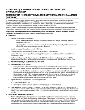 UZUPEŁNIAJĄCE POSTANOWIENIA LICENCYJNE DOTYCZĄCE OPROGRAMOWANIA SUBSKRYPCJA MICROSOFT DEVELOPER NETWORK ACADEMIC ALLIANCE (MSDN-AA) Te uzupełniające postanowienia licencyjne dotyczą określonego powyżej oprogramowania. Wraz z postanowieniami licencyjnymi Subskrypcji MSDN („Postanowienia MSDN”) niniejsze uzupełniające postanowienia licencyjne stanowią umowę pomiędzy firmą Microsoft Corporation (lub, w zależności od miejsca zamieszkania, jej podmiotami stowarzyszonymi) i Państwem, dotyczącą oprogramowania dostarczonego w ramach programu MSDN-AA. Nie mają Państwo żadnych praw wynikających z tych uzupełniających postanowień licencyjnych, jeśli nie zaakceptowali Państwo także postanowień MSDN. Jeśli występuje konflikt, znajdują zastosowanie uzupełniające postanowienia licencyjne. Przez użycie oprogramowania akceptują Państwo niniejsze postanowienia. Jeśli nie akceptują Państwo niniejszych postanowień, nie mogą Państwo używać oprogramowania. 1. DEFINICJE. • „Państwo” oznacza jedno z poniższych: o wydział instytucji edukacyjnej oferującej nauczanie w zakresie nauk ścisłych, technologii, inżynierii i matematyki (STEM) lub o organizację, która ma z takim wydziałem wspólnych studentów, kadrę lub obiekty, lub też działa na rzecz pomocy tym wydziałom w dziedzinie nauczania studentów akceptowane przez Microsoft w programie MSDN-AA; • „Studenci” to osoby uczestniczące w kursach STEM, warsztatach lub programach; • „Personel” to osoby zapewniające Państwu obsługę informatyczną lub zarządzającą Państwa uczestnictwem w programie MSDN-AA; • „Kadra” to osoby pełniące funkcję nauczycieli kursów STEM dla studentów, asystujące przy kursach STEM, warsztatach lub programach dla studentów oraz prowadzące w Państwa imieniu niekomercyjne badania STEM. 2. PRAWA WYNIKAJĄCE Z UŻYTKOWANIA MSDN-AA. a. Państwa prawa. Mogą Państwo: • zlecać personelowi wykonanie i instalację kopii oprogramowania dla dowolnej liczby serwerów, komputerów osobistych i mediów w obrębie placówki w celu ich użytkowania zgodnie z tymi postanowieniami oraz • zezwolić personelowi, kadrze i studentom na używanie tych kopii oraz wykonanie jednej dodatkowej kopii na ich własnym komputerze lub innym urządzeniu, ale tylko w celu (a) opracowywania, obsługi, przeprowadzania lub uczestnictwa w kursach STEM, warsztatach lub programach oferowanych przez Państwa; (b) prowadzenia niekomercyjnych badań STEM w Państwa imieniu lub (c) projektowania, opracowywania, testowania i demonstrowania oprogramowania przeznaczonego dla powyższych celów. a. Ograniczenia. Nie mogą Państwo używać oprogramowania: c. • w celach komercyjnych; lub • do rozwijania i obsługi własnych systemów administracyjnych lub informatycznych. Poza zakresem. Elementy zawarte w Przykładzie 1 nie są objęte programem MSDN-AA i nie mogą ich Państwo używać, jeśli nie zakupią Państwo dla nich odpowiedniej licencji komercyjnej. Dodatkowo Ustęp 2(a) (Postanowienia ogólne), 3(c)(i) (Aplikacje komputerowe) i Ustęp 17 (Przekazanie osobie trzeciej) w postanowieniach MSDN zostają usunięte. 3. DODATKOWE WYMAGANIA MSDN-AA. a. Środki zabezpieczające. Oprogramowanie na nośnikach mogą Państwo dostarczać personelowi, kadrze lub studentom tylko tymczasowo lub na zasadzie „wypożyczenia”. Cały personel, kadra i studenci, którzy otrzymają kopie oprogramowania, muszą wyrazić zgodę na jego użytkowanie zgodnie z tymi postanowieniami, niezależnie od jakichkolwiek umów licencyjnych dołączonych do oprogramowania. Należy prowadzić rejestr wszelkich pobrań oprogramowania z Państwa serwerów oraz rejestr personelu, kadry i studentów, którym udostępniają Państwo nośniki z oprogramowaniem. Pozwolą Państwo firmie Microsoft na kontrolę tych rejestrów na żądanie. Dołożą Państwo wszelkich starań w celu uniemożliwienia dostępu do oprogramowania komukolwiek poza Państwa personelem, kadrą i studentami lub uniemożliwienia stosowania oprogramowania w celach innych niż określono w tych warunkach. b. Zmiany statusu. Należy przerwać udostępnianie oprogramowania wszelkim osobom, które przestaną być członkami Państwa personelu, kadry lub studentami. Studenci mogą jednak kontynuować użytkowanie otrzymanego oprogramowania zgodnie z niniejszymi postanowieniami. c. Naruszenia. Jeśli firma Microsoft zauważy lub dowiedzą się Państwo, że ktokolwiek z personelu, kadry lub studentów narusza niniejsze postanowienia, przestaną Państwo dostarczać oprogramowanie i dołożą Państwo wszelkich starań, aby osoby te zwróciły lub udowodniły zniszczenie wszystkich posiadanych przez nie kopii oprogramowania. d. Jakość produktu. Muszą Państwo upewnić się, że każda z kopii oprogramowania wykonana przez personel jest prawidłowa i kompletna oraz zawiera wszystkie informacje dotyczące praw autorskich, znaku handlowego i inne. e. Zakaz użytkowania komercyjnego. Jeśli Państwa kadra lub studenci używają tego oprogramowania do tworzenia programów, mogą oni komercyjnie używać lub oferować takie programy tylko po zakupieniu odpowiedniej komercyjnej licencji na oprogramowanie. f. Komputerowe systemy operacyjne. Niektóre komponenty oprogramowania stanowią produkty systemów operacyjnych. Mogą Państwo pozwolić na instalację i użytkowanie takich produktów w komputerach, w których podczas instalacji naszych produktów nie było zainstalowanego systemu operacyjnego, jeśli tylko komputery są własnością Państwa i/lub studentów lub są wypożyczone przez Państwa i/lub studentów. Mogą Państwo także instalować takie produkty w środowiskach urządzeń wirtualnych (virtual machine), jeśli tylko urządzenia wirtualne (a) są używane zgodnie z niniejszymi postanowieniami i (b) działają na komputerach posiadanych lub wypożyczonych przez Państwa i/lub studentów. Wszelkie inne sytuacje wymagają wcześniejs
