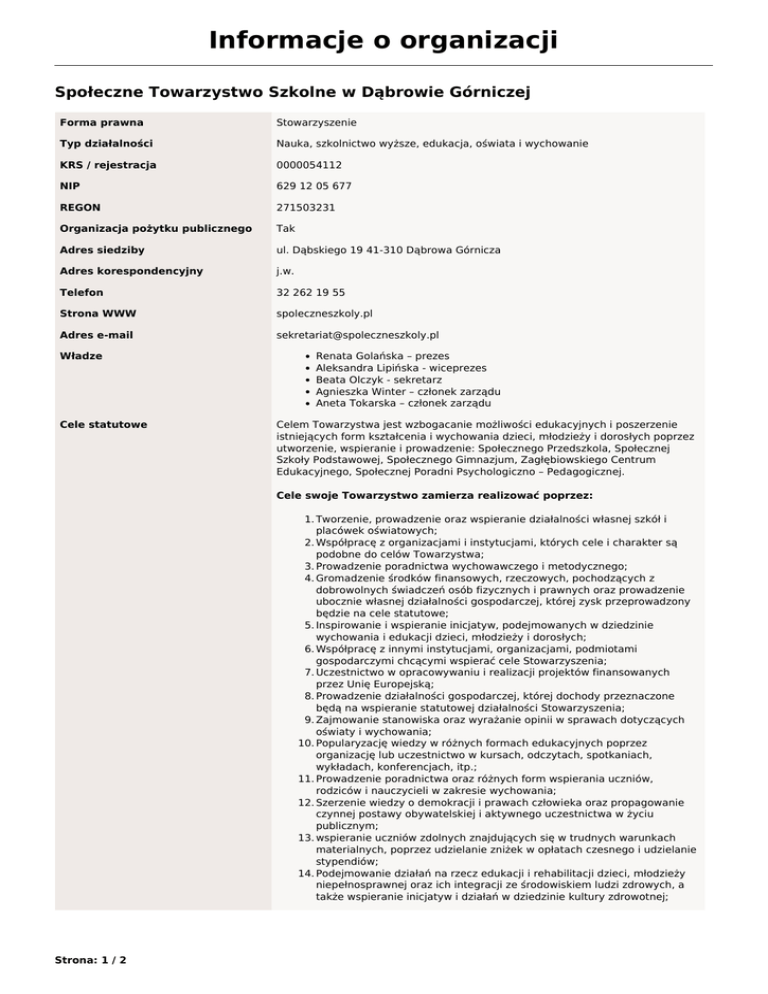 Informacje o organizacji Społeczne Towarzystwo Szkolne w Dąbrowie Górniczej Forma prawna Stowarzyszenie Typ działalności Nauka, szkolnictwo wyższe, edukacja, oświata i wychowanie KRS / rejestracja 0000054112 NIP 629 12 05 677 REGON 271503231 Organizacja pożytku publicznego Tak Adres siedziby ul. Dąbskiego 19 41-310 Dąbrowa Górnicza Adres korespondencyjny j.w. Telefon 32 262 19 55 Strona WWW spoleczneszkoly.pl Adres e-mail [email protected] Władze Cele statutowe Renata Golańska – prezes Aleksandra Lipińska - wiceprezes Beata Olczyk - sekretarz Agnieszka Winter – członek zarządu Aneta Tokarska – członek zarządu Celem Towarzystwa jest wzbogacanie możliwości edukacyjnych i poszerzenie istniejących form kształcenia i wychowania dzieci, młodzieży i dorosłych poprzez utworzenie, wspieranie i prowadzenie: Społecznego Przedszkola, Społecznej Szkoły Podstawowej, Społecznego Gimnazjum, Zagłębiowskiego Centrum Edukacyjnego, Społecznej Poradni Psychologiczno – Pedagogicznej. Cele swoje Towarzystwo zamierza realizować poprzez: 1. Tworzenie, prowadzenie oraz wspieranie działalności własnej szkół i placówek oświatowych; 2. Współpracę z organizacjami i instytucjami, których cele i charakter są podobne do celów Towarzystwa; 3. Prowadzenie poradnictwa wychowawczego i metodycznego; 4. Gromadzenie środków finansowych, rzeczowych, pochodzących z dobrowolnych świadczeń osób fizycznych i prawnych oraz prowadzenie ubocznie własnej działalności gospodarczej, której zysk przeprowadzony będzie na cele statutowe; 5. Inspirowanie i wspieranie inicjatyw, podejmowanych w dziedzinie wychowania i edukacji dzieci, młodzieży i dorosłych; 6. Współpracę z innymi instytucjami, organizacjami, podmiotami gospodarczymi chcącymi wspierać cele Stowarzyszenia; 7. Uczestnictwo w opracowywaniu i realizacji projektów finansowanych przez Unię Europejską; 8. Prowadzenie działalności gospodarczej, której dochody przeznaczone będą na wspieranie statutowej działalności Stowarzyszenia; 9. Zajmowanie stanowiska oraz wyrażanie opinii w sprawach dotyczących oświaty i wychowania; 10. Popularyzację wiedzy w różnych formach edukacyjnych poprzez organizację lub uczestnictwo w kursach, odczytach, spotkaniach, wykładach, konferencjach, itp.; 11. Prowadzenie poradnictwa oraz różnych form wspierania uczniów, rodziców i nauczycieli w zakresie wychowania; 12. Szerzenie wiedzy o demokracji i prawach człowieka oraz propagowanie czynnej postawy obywatelskiej i aktywnego uczestnictwa w życiu publicznym; 13. wspieranie uczniów zdolnych znajdujących się w trudnych warunkach materialnych, poprzez udzielanie zniżek w opłatach czesnego i udzielanie stypendiów; 14. Podejmowanie działań na rzecz edukacji i rehabilitacji dzieci, młodzieży niepełnosprawnej oraz ich integracji ze środowiskiem ludzi zdrowych, a także wspieranie inicjatyw i działań w dziedzinie kultury zdrowotnej; Strona: 1 / 2 Informacje o organizacji 15. Prowadzenie działań aktywizujących młodzież zawodowo połączone z elementami poradnictwa zawodowego; 16. Promocja i organizacja wolontariatu; 17. Organizowanie różnego rodzaju form aktywności edukacyjno – kulturalnej, w tym: koncertów, przedstawień teatralnych, widowisk, imprez sportowych, festynów, festiwali, galerii wystawienniczej; 18. Organizowanie szeregu zajęć dodatkowych i pozalekcyjnych rozwijających zdolność uczenia się, kreatywność, zdolność zarządzania informacją oraz pasję do nauki i umiejętność praktycznego wykorzystania wiedzy; 19. Promowanie szkoły w środowisku lokalnym poprzez organizację i uczestnictwo w konkursach, olimpiadach, wystawach, zawodach sportowych i innych; 20. Organizację wycieczek szkolnych i wypoczynku dla dzieci; 21. Rozwijanie innych form działalności, służących wzbogacaniu możliwości edukacyjnych; 22. Upowszechnianie kultury fizycznej i sportu wśród dzieci, młodzieży i dorosłych; 23. Realizacja programów w zakresie oświaty i wychowania dzieci i młodzieży; 24. Organizowanie turnusów rehabilitacyjnych dla dzieci, młodzieży i dorosłych Przedsięwzięcia Społeczne Towarzystwo Szkolne od 1991 roku Wzbogacanie możliwości edukacyjnych i poszerzenie istniejących form kształcenia i wychowania dzieci, młodzieży i dorosłych poprzez utworzenie, wspieranie i prowadzenie: Społecznego Przedszkola, Społecznej Szkoły Podstawowej, Społecznego Gimnazjum, Zagłębiowskiego Centrum Edukacyjnego, Społecznej Poradni Psychologiczno – Pedagogicznej Wspieranie uczniów zdolnych znajdujących się w trudnych warunkach materialnych, poprzez udzielanie zniżek w opłatach czesnego i udzielanie stypendiów Organizowanie szeregu zajęć dodatkowych i pozalekcyjnych rozwijających zdolność uczenia się, kreatywność, zdolność zarządzania informacją oraz pasję do nauki i umiejętność praktycznego wykorzystania wiedzy; Prowadzenie zajęć dla uczniów potrzebujących dodatkowego wsparcia zarówno w edukacji z poszczególnych przedmiotów oraz edukacji społecznej Inspirowanie i wspieranie inicjatyw, podejmowanych w dziedzinie wychowania i edukacji dzieci, młodzieży i dorosłych Dąbrowska Konferencja „… mały tyran, a może…jednak nie”. Dziecko z zaburzeniami ze spektrum autyzmu oraz problemami z zachowaniem o trudnościach wychowawczych w szerszej perspektywie. Obchody Światowego Dnia Wiedzy na Temat Autyzmu – Niebieskie Niebo Zagłębia Obchody Międzynarodowego Dnia Teatru Kiermasze zaduszkowe, bożonarodzeniowe i wielkanocne Podejmowanie działań na rzecz edukacji i rehabilitacji dzieci, młodzieży niepełnosprawnej oraz ich integracji ze środowiskiem ludzi zdrowych, a także wspieranie inicjatyw i działań w dziedzinie kultury zdrowotnej Promocja i organizacja wolontariatu Upowszechnianie kultury fizycznej i sportu wśród dzieci, młodzieży i dorosłych Organizacja Akcji Cała Polska Biega na terenie osiedla Mydlice Prowadzenie wyżej wym