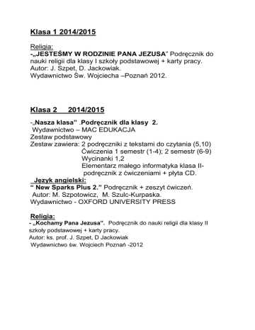Klasa 1 2014/2015 Religia: -„JESTEŚMY W RODZINIE PANA JEZUSA” Podręcznik do nauki religii dla klasy I szkoły podstawowej + karty pracy. Autor: J. Szpet, D. Jackowiak. Wydawnictwo Św. Wojciecha –Poznań 2012. Klasa 2 2014/2015 -„Nasza klasa” .Podręcznik dla klasy 2. Wydawnictwo – MAC EDUKACJA Zestaw podstawowy Zestaw zawiera: 2 podręczniki z tekstami do czytania (5,10) Ćwiczenia 1 semestr (1-4); 2 semestr (6-9) Wycinanki 1,2 Elementarz małego informatyka klasa IIpodręcznik z ćwiczeniami + płyta CD. Język angielski: “ New Sparks Plus 2.” Podręcznik + zeszyt ćwiczeń. Autor: M. Szpotowicz, M. Szulc-Kurpaska. Wydawnictwo - OXFORD UNIVERSITY PRESS Religia: - „Kochamy Pana Jezusa”. Podręcznik do nauki religii dla klasy II szkoły podstawowej + karty pracy. Autor: ks. prof. J. Szpet, D Jackowiak Wydawnictwo św. Wojciech Poznań -2012 Klasa 3 2014/2015 -„Nasza klasa”. Podręcznik dla klasy 3. Wydawnictwo – MAC EDUKACJA Zestaw podstawowy , wydanie aktualne na rok szkolny 2013/14. Zestaw zawiera: 2 podręczniki z tekstami do czytania (5,10) Ćwiczenia 1 semestr (1-4); 2 semestr (6-9) Wycinanki 1,2 Elementarz małego informatyka klasa IIIpodręcznik z ćwiczeniami + płyta CD. Język angielski: - „New Sparks Plus 3”. Podręcznik + zeszyt ćwiczeń. Autor: M. Szpotowicz, M. Szulc-Kurpaska. Wydawnictwo - OXFORD UNIVERSITY PRESS Religia: -„Przyjmujemy Pana Jezusa” Podręcznik do nauki religii dla klasy III szkoły podstawowej + karty pracy. Autor: Kubik W. Wydawnictwo WAM Kraków 2013 Klasa 4 2014/2015 Język polski: -„Czarowanie słowem”. Podręcznik dla szkoły podstawowej. Klasa 4. Część 1-5 Autorzy: Kania A., Kwak K., Majchrzak-Broda J. Wydawnictwo: WSiP S. A. Historia i społeczeństwo: - „Historia wokół nas”. Historia i społeczeństwo. Podręcznik + zeszyt ćwiczeń dla klasy czwartej szkoły podstawowej . Autorzy: . Lolo R., Pieńkowska A., Towalski R., Kalwat W. Wydawnictwo: WSiP S. A. Przyroda: - „Tajemnice przyrody”. Podręcznik klasa IV+2 zeszyty ćwiczeń. Autorzy: Marko-Worłowska M., Szlajfer F., Stawarz J. Wydawnictwo: Wydawnictwo NOWA ERA Sp. z o. o Warszawa Matematyka: - „Matematyka 4.” Podręcznik wraz z zeszytami ćwiczeń dla klasy IV, część 1-3. (Seria Matematyka z plusem) Autorzy: Dobrowolska M., Jucewicz M., Zarzycki P. Wydawnictwo: Gdańskie Wydawnictwo Oświatowe Zajęcia komputerowe: - „Informatyka Europejczyka”. Podręcznik do zajęć komputerowych dla szkoły podstawowej. Klasa 4. Edycja: Windows XP, Linux Ubuntu, MS Office 2003, OpenOffice.org.(Wydanie II). Autorzy: Danuta Kiałka, Katarzyna Kiałka Wydawnictwo: Helion. Plastyka: -„Plastyka”. Podręcznik dla klasy IV. Autorzy: Stopczyk S., Neubar t B. Wydawnictwo: WSiP S.A. Muzyka: -„ Muzyka i my”. Klasa IV. Autorzy: Smoczyńska U., K.JakóbczakDrążek Wydawnictwo: WSiP S.A. Zajęcia techniczne: -„ Jak to działa”? Podręcznik z ćwiczeniami dla klas IV-VI. Łabecki L., Łabecka M. Wydawnictwo NOWA ERA Sp. z o.o. Warszawa Religia: -„Jestem chrześcijaninem”. Podręcznik + karty pracy do religii dla klasy IV. Autor: J. Szpet, D. Jackowiak. Wydawnictwo: Święty Wojciech, Poznań 2012. Jęz. angielski: „DISCOVER ENGLISH 1”. Podręcznik + zeszyt ćwiczeń (klasa IV). I.Hearn, J. Wildman - Wyd. Pearson Central Europe sp.z o.o. Klasa 5 2014/2015 Język polski: - „Czarowanie słowem”. Język polski. Podręcznik 2 części + 2 zeszyty ćwiczeń dla klasy V szkoły podstawowej. Autorzy: Kania A., Kwak K., Majchrzak-Broda J. Wydawnictwo: WSiP Historia i społeczeństwo: -„Historia wokół nas”. Historia i społeczeństwo. Podręcznik + zeszyt ćwiczeń dla klasy V szkoły podstawowej. Autorzy: Lolo R., Pieńkowska A., Towalski R., Kalwat W. Wydawnictwo: WSiP S. A. Przyroda: „Tajemnice przyrody”. Podręcznik + 2 zeszyty ćwiczeń dla klasy V szkoły podstawowej. Autorzy: Ślósarczyk J., Kozik R., Szlajfer F. Wydawnictwo NOWA ERA Sp. z o.o. Warszawa Matematyka: - „Matematyka 5”.Nowa wersja- Podręcznik dla klasy V szkoły podstawowej z zeszytami ćwiczeń dla klasy V, część 1-3. (Seria Matematyka z plusem) . Autorzy: Dobrowolska M., Jucewicz M., Zarzycki P. Wydawnictwo: Gdańskie Wydawnictwo Oświatowe Zajęcia komputerowe: - „Informatyka Europejczyka”. Podręcznik do zajęć komputerowych dla szkoły podstawowej. Klasa 5. Edycja: Windows XP, Linux Ubuntu, MS Office 2003, OpenOffice.org.(Wydanie II). Autorzy: Danuta Kiałka, Katarzyna Kiałka Wydawnictwo: Helion. Język niemiecki: -„ Wir neu 2 „ Język niemiecki dla klasy 5 szkoły podstawowej. Podręcznik i książka ćwiczeń. Autorzy: Motta G., Księżek-Kempa E., Wieszczeczyńska E. Wydawnictwo: LektorKlett Poznań Plastyka: - Plastyka. Podręcznik dla klasy V. Autorzy: Stopczyk S., Neubart B. Wydawnictwo: WSiP S.A. Muzyka: - „Muzyka i my”. Klasa V. Autorzy: Smoczyńska U., Jakubczak-Drążek K. Wydawnictwo: WSiP S.A. Zajęcia techniczne: - „Jak to działa?” Podręcznik do zajęć technicznych dla klas IV-VI. Autor: L.Łabecki, M.Łabecka. Wydawnictwo: Nowa Era Religia: WIERZĘ W BOGA podręcznik + karty pracy do religii dla klasy V. Autor: ks.prof.J.Szpet, D.Jackowiak Wydawnictwo św. Wojciech Poznań 2012 Klasa 6 2013/2014 Język polski: -„Czarowanie słowem”. Podręcznik do kształcenia literackiego, kulturowego i językowego. Klasa VI szkoły podstawowej. Autorzy: Kania A., Kwak K., Majchrzak-Broda J. Wydawnictwo: WSiP S. A. (Wydanie 2014r.) Historia i społeczeństwo: - „Historia wokół nas”. Historia i społeczeństwo. Podręcznik dla klasy VI szkoły podstawowej. Autorzy: Lolo R., Pieńkowska A., Towalski R., Kalwat W. Wydawnictwo: WSiP S. A. (Wydanie 2014) Przyroda: „Tajemnice przyrody”. Podręcznik dla kl.VI z zeszytami ćwiczeń. Wydawnictwo: NOWA ERA Sp. z o.o. Warszawa (Wydanie 2014r.) Matematyka: -„ Matematyka 6”. Podręcznik + zeszyty ćwiczeń dla klasy szóstej szkoły podstawowej , część 1-3. (Seria Matematyka