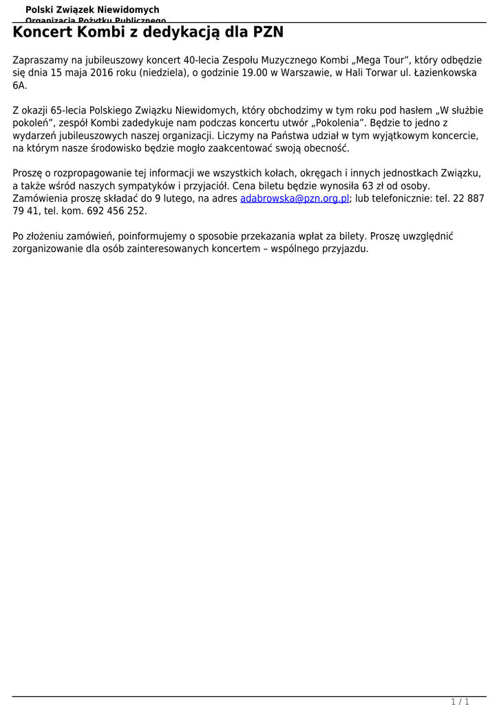 Polski Związek Niewidomych Organizacja Pożytku Publicznego http://pzn.org.pl Koncert Kombi z dedykacją dla PZN Zapraszamy na jubileuszowy koncert 40-lecia Zespołu Muzycznego Kombi „Mega Tour”, który odbędzie się dnia 15 maja 2016 roku (niedziela), o godzinie 19.00 w Warszawie, w Hali Torwar ul. Łazienkowska 6A. Z okazji 65-lecia Polskiego Związku Niewidomych, który obchodzimy w tym roku pod hasłem „W służbie pokoleń”, zespół Kombi zadedykuje nam podczas koncertu utwór „Pokolenia”. Będzie to jedno z wydarzeń jubileuszowych naszej organizacji. Liczymy na Państwa udział w tym wyjątkowym koncercie, na którym nasze środowisko będzie mogło zaakcentować swoją obecność. Proszę o rozpropagowanie tej informacji we wszystkich kołach, okręgach i innych jednostkach Związku, a także wśród naszych sympatyków i przyjaciół. Cena biletu będzie wynosiła 63 zł od osoby. Zamówienia proszę składać do 9 lutego, na adres [email protected]; lub telefonicznie: tel. 22 887 79 41, tel. kom. 692 456 252. Po złożeniu zamówień, poinformujemy o sposobie przekazania wpłat za bilety. Proszę uwzględnić zorganizowanie dla osób zainteresowanych koncertem – wspólnego przyjazdu. Powered by TCPDF (www.tcpdf.org) 1/1
