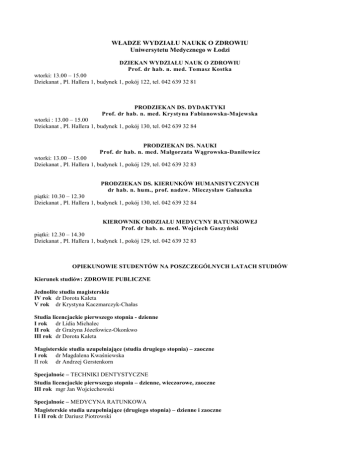 WŁADZE WYDZIAŁU NAUKK O ZDROWIU Uniwersytetu Medycznego w Łodzi DZIEKAN WYDZIAŁU NAUK O ZDROWIU Prof. dr hab. n. med. Tomasz Kostka wtorki: 13.00 – 15.00 Dziekanat , Pl. Hallera 1, budynek 1, pokój 122, tel. 042 639 32 81 PRODZIEKAN DS. DYDAKTYKI Prof. dr hab. n. med. Krystyna Fabianowska-Majewska wtorki : 13.00 – 15.00 Dziekanat , Pl. Hallera 1, budynek 1, pokój 130, tel. 042 639 32 84 PRODZIEKAN DS. NAUKI Prof. dr hab. n. med. Małgorzata Wągrowska-Danilewicz wtorki: 13.00 – 15.00 Dziekanat , Pl. Hallera 1, budynek 1, pokój 129, tel. 042 639 32 83 PRODZIEKAN DS. KIERUNKÓW HUMANISTYCZNYCH dr hab. n. hum., prof. nadzw. Mieczysław Gałuszka piątki: 10.30 – 12.30 Dziekanat , Pl. Hallera 1, budynek 1, pokój 130, tel. 042 639 32 84 KIEROWNIK ODDZIAŁU MEDYCYNY RATUNKOWEJ Prof. dr hab. n. med. Wojciech Gaszyński piątki: 12.30 – 14.30 Dziekanat , Pl. Hallera 1, budynek 1, pokój 129, tel. 042 639 32 83 OPIEKUNOWIE STUDENTÓW NA POSZCZEGÓLNYCH LATACH STUDIÓW Kierunek studiów: ZDROWIE PUBLICZNE Jednolite studia magisterskie IV rok dr Dorota Kaleta V rok dr Krystyna Kaczmarczyk-Chałas Studia licencjackie pierwszego stopnia - dzienne I rok dr Lidia Michalec II rok dr GraŜyna Józefowicz-Okonkwo III rok dr Dorota Kaleta Magisterskie studia uzupełniające (studia drugiego stopnia) – zaoczne I rok dr Magdalena Kwaśniewska II rok dr Andrzej Gerstenkorn Specjalnośc – TECHNIKI DENTYSTYCZNE Studia licencjackie pierwszego stopnia – dzienne, wieczorowe, zaoczne III rok mgr Jan Wojciechowski Specjalnośc – MEDYCYNA RATUNKOWA Magisterskie studia uzupełniające (drugiego stopnia) – dzienne i zaoczne I i II rok dr Dariusz Piotrowski Kierunek studiów: RATOWNICTWO MEDYCZNE Studia licencjackie (pierwszego stopnia) – dzienne, wieczorowe, zaoczne I rok dr Anna Samborska-Sablik II rok dr dr Krzysztof Ulbrich III rok dr Wiesława Trendak Kierunek studiów: FILOZOFIA Studia licencjackie (pierwszego stopnia) – dzienne I rok mgr Maria Ziętkowska II rok mgr Iwona Rapałło III rok mgr Mikołaj Grochulski Kierunek studiów: SOCJOLOGIA Studia licencjackie (pierwszego stopnia) – dzienne I rok mgr BoŜena Walerian II rok mgr Małgorzata Legiędź-Gałuszka Studia licencjackie (pierwszego stopnia) - zaoczne I i II rok dr Krzysztof Rosa Kierunek studiów: DIETETYKA Studia licencjackie (pierwszego stopnia) – dzienne i zaoczne I, II i III rok dr Adam Skowroński WYDZIAŁ NAUK O ZDROWIU KIERUNEK ZDROWIE PUBLICZNE Studia jednolite magisterskie IV ROK - studia dzienne Lp. 1 1 2 3 4 5 6 7 8 9 10 11 12 13 14 15 16 17 18 19 Przedmiot 2 Zdrowie publiczne Dr n. ekonom. Marek Bryła Prawo w ochronie zdrowia dr n. praw. Ewa Górska-Marciniak Informatyka medyczna Dr n. med. Radosław Zajdel Systemy informacyjne Dr n. med. Radosław Zajdel Ekonomia (podstawy mikroekonomii) Prof. dr hab. n. ekon. Jadwiga Suchecka Organizacja i zarządzanie Dr hab. n. hum. Prof. nadzw. Romuald Holly Biostatystyka Dr hab. n. med. Irena Maniecka-Bryła Epidemiologia Dr hab. n. med. Irena Maniecka-Bryła Logika Mgr ElŜbieta Gawłowska Promocja zdrowia i oświata zdrowotna Prof. dr hab. n. med. Wojciech Drygas Techniki ochrony środowiska Dr hab. n. med. Anna Głowacka Zasady prowadzenia badań naukowych Prof. dr hab. n. med. Cezary Watała Polityka społeczna i zdrowotna Dr hab. n. hum. Prof. nadzw. Romuald Holly Pedagogika Dr n. hum. Czesław Marmura Zasoby i systemy informacyjne w ochronie zdrowia Dr n. med. Krzysztof Kuszewski Psychologia Prof. dr hab. n. med. Alina Borkowska Nadzór sanitarno-epidemiologiczny Dr hab. n. med. Franciszek Szatko Marketing usług zdrowotnych Dr n. med. Krzysztof Kuszewski Język angielski (konwersacje specjalistyczne) Mgr Kinga Studzińska-Pasieka Liczba godzin Semestr VII Semestr VIII zimowy letni Rocznie godzin Zaliczenie roku Punkty ECTS Semestr VII 8 Semestr VIII 9 Wyk. Ćw. Wyk. Ćw. 3 4 5 6 7 15 15 15 15 60 egzamin 40 20 60 egzamin 30 30 zalicz 30 30 zalicz. 20 10 20 10 60 egzamin 10 20 10 20 60 egzamin 15 15 30 zalicz. 30 30 60 egzamin 15 15 15 30 zalicz. 15 30 zalicz. 30 30 zalicz. 30 10 s* 20 30 zalicz. 15 15 30 zalicz. 15 15 30 zalicz. 30 30 60 egzamin 15 15 30 zalicz. 15 15 30 zalicz. 15 15 30 zalicz. 30 60 zalicz. Wychowanie fizyczne 20 (zajęcia nadobowiązkowe) Mgr Józef Bortnik 21 Seminarium magisterskie 30 30 60 zalicz. 30 30 zalicz. Zajęcia fakultatywne w ramach konwersacji specjalistycznych z języka angielskiego Ageing of the societies – implications for 22 Public Heath Prof. dr hab. n. med. Tomasz Kostka Medical chemistry and biochemistry Prof. dr hab. n. med. 23 Krystyna Fabianowska-Majewska oraz Dr hab. n med., Prof. nadzw. ElŜbieta Hrabec 30 30 zalicz. 30 30 zalicz. * seminarium Praktyka wakacyjna – 1 miesiąc w stacji sanitarno-epidemiologicznej lub innej placówce w ochronie zdrowia WYDZIAŁ NAUK O ZDROWIU KIERUNEK ZDROWIE PUBLICZNE Studia jednolite magisterskie V ROK - studia dzienne Lp. Liczba godzin Semestr IX Semestr X zimowy letni Wyk. Ćw. Wyk. Ćw. 3 4 5 6 Przedmiot 1 2 ZagroŜenie terroryzmem 1 Prof. dr hab. n. med. Wojciech Gaszyński Ergonomia 2 Dr hab. n. med., prof. nadzw. Teresa Makowiec-Dąbrowska System ratownictwa 3 Dr n. med. Dariusz Piotrowski Farmokologia społeczna 4 Dr n. med. Mariusz Stępień Polityka zdrowotna na świecie 5 Dr n. med. Krzysztof Kuszewski Ekonomika i finansowanie w ochronie zdrowia 6 Prof. dr hab. n. ekon. Jadwiga Suchecka Medycyna zapobiegawcza 7 Prof. dr hab. n. med. Wojciech Drygas Patologie społeczne 8 Dr n. hum. Wojciech Bielecki Język obcy - angielski 9 (konwersacje specjalistyczne) Mgr Kinga Studzińska-Pasieka 10 Seminarium magisterskie 11 StaŜ przeddyplomowy Rocznie godzin 7 Zaliczenie roku Punkty ECTS Semestr IX Semestr X 8 9 30 30 zalicz. 15 15 zalicz. 30 30 zalicz. 15 15 zalicz. 30 30 zalicz. 15 30 15 30 15 30 30 30 90 60 60 90 egzamin 45 egzamin 30 zalicz. 30 egzamin 90 120 zalicz. zalicz. 30 zalicz. 30 30 zalicz. 30 30 zalicz. Zajęcia nadobowiązkowe 12 13 14 Procedury restrukturyzacyjne