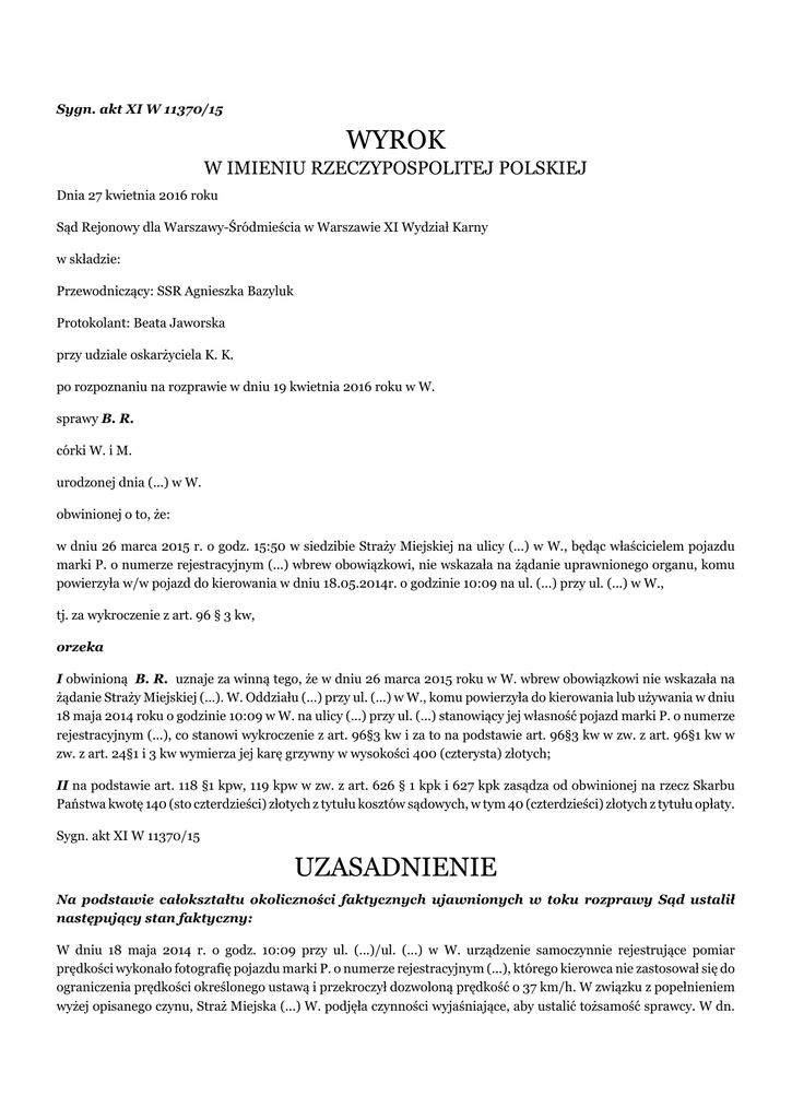 Sygn. akt XI W 11370/15 WYROK W IMIENIU RZECZYPOSPOLITEJ POLSKIEJ Dnia 27 kwietnia 2016 roku Sąd Rejonowy dla Warszawy-Śródmieścia w Warszawie XI Wydział Karny w składzie: Przewodniczący: SSR Agnieszka Bazyluk Protokolant: Beata Jaworska przy udziale oskarżyciela K. K. po rozpoznaniu na rozprawie w dniu 19 kwietnia 2016 roku w W. sprawy B. R. córki W. i M. urodzonej dnia (...) w W. obwinionej o to, że: w dniu 26 marca 2015 r. o godz. 15:50 w siedzibie Straży Miejskiej na ulicy (...) w W., będąc właścicielem pojazdu marki P. o numerze rejestracyjnym (...) wbrew obowiązkowi, nie wskazała na żądanie uprawnionego organu, komu powierzyła w/w pojazd do kierowania w dniu 18.05.2014r. o godzinie 10:09 na ul. (...) przy ul. (...) w W., tj. za wykroczenie z art. 96 § 3 kw, orzeka I obwinioną B. R. uznaje za winną tego, że w dniu 26 marca 2015 roku w W. wbrew obowiązkowi nie wskazała na żądanie Straży Miejskiej (...). W. Oddziału (...) przy ul. (...) w W., komu powierzyła do kierowania lub używania w dniu 18 maja 2014 roku o godzinie 10:09 w W. na ulicy (...) przy ul. (...) stanowiący jej własność pojazd marki P. o numerze rejestracyjnym (...), co stanowi wykroczenie z art. 96§3 kw i za to na podstawie art. 96§3 kw w zw. z art. 96§1 kw w zw. z art. 24§1 i 3 kw wymierza jej karę grzywny w wysokości 400 (czterysta) złotych; II na podstawie art. 118 §1 kpw, 119 kpw w zw. z art. 626 § 1 kpk i 627 kpk zasądza od obwinionej na rzecz Skarbu Państwa kwotę 140 (sto czterdzieści) złotych z tytułu kosztów sądowych, w tym 40 (czterdzieści) złotych z tytułu opłaty. Sygn. akt XI W 11370/15 UZASADNIENIE Na podstawie całokształtu okoliczności faktycznych ujawnionych w toku rozprawy Sąd ustalił następujący stan faktyczny: W dniu 18 maja 2014 r. o godz. 10:09 przy ul. (...)/ul. (...) w W. urządzenie samoczynnie rejestrujące pomiar prędkości wykonało fotografię pojazdu marki P. o numerze rejestracyjnym (...), którego kierowca nie zastosował się do ograniczenia prędkości określonego ustawą i przekroczył dozwoloną prędkość o 37 km/h. W związku z popełnieniem wyżej opisanego czynu, Straż Miejska (...) W. podjęła czynności wyjaśniające, aby ustalić tożsamość sprawcy. W dn. 21 maja 2014 r. na podstawie zasobów bazy Centralnej Ewidencji Pojazdów i Kierowców ustalono, iż właścicielem pojazdu jest B. R.. Do tak ustalonego właściciela zostało dwukrotnie wysłane za pośrednictwem poczty wezwanie wraz z formularzami oświadczeń do wyrażenia zgody na ukaranie mandatem karnym za popełnienie wykroczenia z art. 92a kw, do wskazania kierowcy, który prowadził pojazd w dniu popełnienia czynu oraz formularz oświadczenia do wyrażenia zgody na przyjęcie mandatu karnego w przypadku niewskazania osoby kierującej pojazdem. Poczta ta nie została podjęta. Straż Miejska wysłała zatem kolejne pismo, zawierające wezwanie do wskazania osoby kierującej lub użytkującej jej pojazd lub do wyrażenia zgody na przyjęcie mandatu karnego za niewskazanie osoby kierującej. Wezwanie to zostało odebrane w dn. 19 marca 2015 r. i B. R. zapoznała się z jego treścią. B. R. do czasu wezwania jej do siedziby Straży Miejskiej w charakterze osoby podejrzanej o popełnienie wykroczenia z art. 96 § 3 kw nie podjęła żadnej aktywności ukierunkowanej na wskazanie, komu powierzyła swój pojazd do kierowania lub używania w oznaczonym w wezwaniu czasie. Powyższy stan faktyczny Sąd ustalił w oparciu o następujące dowody: częściowo wyjaśnienia obwinionej (zapis audiowizualny przebiegu rozprawy z dn. 19 kwietnia 2016 r. 00:10:12 – 00:32:06), notatkę urzędową (k. 1-3), zdjęcie z fotoradaru (k. 4), wezwania (k. 5, 7, 9), zwrotne potwierdzenia odbioru (k. 6, 8, 10), notatka urzędowa (k. 13). Obwiniona na rozprawie w dn. 19 kwietnia 2016 r. nie potrafiła określić, czy przyznaje się do zarzuconego jej czynu. Wyjaśniała, iż od momentu popełnienia wykroczenia do momentu doręczenia jej wezwania upłynęło 10 miesięcy. Przyznała, że stawiła się do siedziby Straży Miejskiej, ponieważ nie pamiętała, co się wydarzyło w dacie wskazanej w wezwaniu i po to, aby przekonać się, co będzie widoczne na zdjęciu z fotoradaru. Według obwinionej zdjęcie przedstawiało jej samochód, lecz twarz kierowcy była zasłonięta lusterkiem i nie była ona w stanie rozpoznać, kto siedzi za kierownicą, była jednak pewna, że nie jest to ona, gdyż w tym czasie nosiła długie blond włosy. Ponadto, po sprawdzeniu, co robiła w dniu zdarzenia ustaliła, iż wówczas przebywała w S. na Szybowcowych Mistrzostwach Polski. Obwiniona wyjaśniała dalej, iż zaproponowała strażnikowi miejskiemu, że zapłaci mandat, skoro wykroczenie popełniono jej samochodem, nie może jednak przyznać się do winy ani wskazać tożsamości kierowcy, gdyż nie wie, kto nim był, a na podstawie zdjęcia nie jest w stanie tego ustalić. Zdziwiło ją postępowanie strażnika miejskiego, który miał powiedzieć, że albo może na nią nałożyć mandat za niewskazanie kierowcy, albo skierować sprawę do rozpoznania przez sąd. Przyznała, iż oferowała, że przyjmie mandat, ale jednocześnie nie przyznawała się do prowadzenia pojazdu. Według obwinionej sposób postępowania wobec niej był nieuczciwy, gdyż musiałaby uciec się do kłamstwa chcąc wypełnić ciążący na niej obowiązek: musiałaby albo przyznać się do prowadzenia samochodu lub wskazać osobę, co do której nie ma pewności. Odpowiadając na pytanie oskarżyciela obwiniona stwierdziła, iż auto mogło być prowadzone przez jedno z jej dzieci lub ich znajomych. W odpowiedzi na pytania Sądu dodała, iż kluczyki oraz dokumenty pojazdu znajdowały się w kuchni, w miejscu dostępnym i znanym domownikom. Wskazała, iż pismo zawierające wezwanie odebrał jej syn i przekazał jej przesyłkę. Obwiniona wyjaśniła nadto, że w jej poprzednim mieszkaniu, pod adresem zameldowan