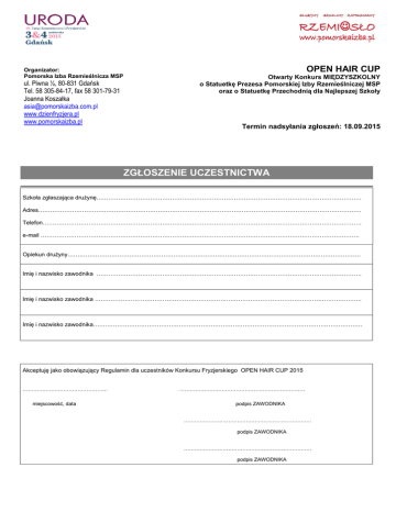 Organizator: Pomorska Izba Rzemieślnicza MSP ul. Piwna ½, 80-831 Gdańsk Tel. 58 305-84-17, fax 58 301-79-31 Joanna Koszałka [email protected] www.dzienfryzjera.pl www.pomorskaizba.pl OPEN HAIR CUP Otwarty Konkurs MIĘDZYSZKOLNY o Statuetkę Prezesa Pomorskiej Izby Rzemieślniczej MSP oraz o Statuetkę Przechodnią dla Najlepszej Szkoły Termin nadsyłania zgłoszeń: 18.09.2015 ZGŁOSZENIE UCZESTNICTWA Szkoła zgłaszająca drużynę……………………………………………………………………………………………………………………. Adres……………………………………………………………………………………………………………………………………………… Telefon……………………………………………………………………………………………………………………………………………. e-mail ……………………………………………………………………………………………………………………………………………. Opiekun drużyny………………………………………………………………………………………………………………………………… Imię i nazwisko zawodnika ……………………………………………………………………………………………………………………. Imię i nazwisko zawodnika …………………………………………………………………………………………………………………….. Imię i nazwisko zawodnika……………………………………………………………………………………………………………………… Akceptuję jako obowiązujący Regulamin dla uczestników Konkursu Fryzjerskiego OPEN HAIR CUP 2015 ………………………………………… miejscowość, data ………………………………………………………………. podpis ZAWODNIKA ……………………………………………………………… podpis ZAWODNIKA ……………………………………………………………… podpis ZAWODNIKA OŚWIADCZENIA Niniejszym oświadczam, że przysługują mi prawa autorskie do wykonanej pracy. Udzielam jednocześnie Pomorskiej Izbie Rzemieślniczej MSP (oraz osobom fizycznym lub prawnym, z którymi Pomorska Izba Rzemieślnicza MSP jest lub będzie związana umową) nieodwołanego i nieodpłatnego prawa do wykorzystywania mojego wizerunku oraz zgłoszonej pracy w celach promocyjnych dokumentacyjnych i marketingowych imprezy pod nazwą Targi Kosmetyczne i Fryzjerskie URODA, w tym GALI URODY i Konkursu Fryzjerskiego OPEN HAIR CUP w roku 2015 i w latach następnych. Zgoda obejmuje wykorzystywanie, utrwalanie i powielanie zdjęć oraz zapisów filmowych za pośrednictwem dowolnego medium w szczególności publikacje w gazetach, czasopismach, folderach, publikacjach elektronicznych, stronach www, wystawach, konkursach, bilbordach, zaproszeniach, innych materiałach promocyjno-informacyjnych, transmisjach telewizyjnych. Zgoda dotyczy zarówno zdjęć i materiałów filmowych przekazanych ze zgłoszeniem jak i wykonanych przez Pomorską Izbę Rzemieślniczą MSP. Zrzekam/my się jednocześnie wszelkich praw związanych z kontrolą i zatwierdzeniem każdorazowego wykorzystania materiałów z elementami wizerunku w/w prac (także w przypadku wykorzystywania ich w celu łączenia z innymi obrazami za pośrednictwem technik cyfrowych). ………………………………………….……………………………………………………………….. data, podpis ZAWODNIKA ………………………………………….……………………………………………………………….. data, podpis ZAWODNIKA ………………………………………….……………………………………………………………….. data, podpis ZAWODNIKA Uczestnik zobowiązany jest również do uzyskania Oświadczenia od modela/modelki udzielającego Pomorskiej Izbie Rzemieślniczej MSP prawa do wykorzystywania wizerunku modela/modelki – wzór oświadczenia w załączeniu, Oryginał Zgłoszenia Uczestnictwa wraz ze stosownymi oświadczeniami należy przysłać do siedziby Pomorskie Izby Rzemieślniczej Małych i Średnich Przedsiębiorstw 80 – 831 Gdańsk, ul. Piwna 1/2, z dopiskiem OPEN HAIR CUP oraz elektronicznie na adres: [email protected], fax 58 301-79-31 Data i Miejsce Konkursu: 4 października 2015r. (niedziela) AMBEREXPO, ul. Żaglowa 11, 80-560 Gdańsk vis a vis PGE Arena