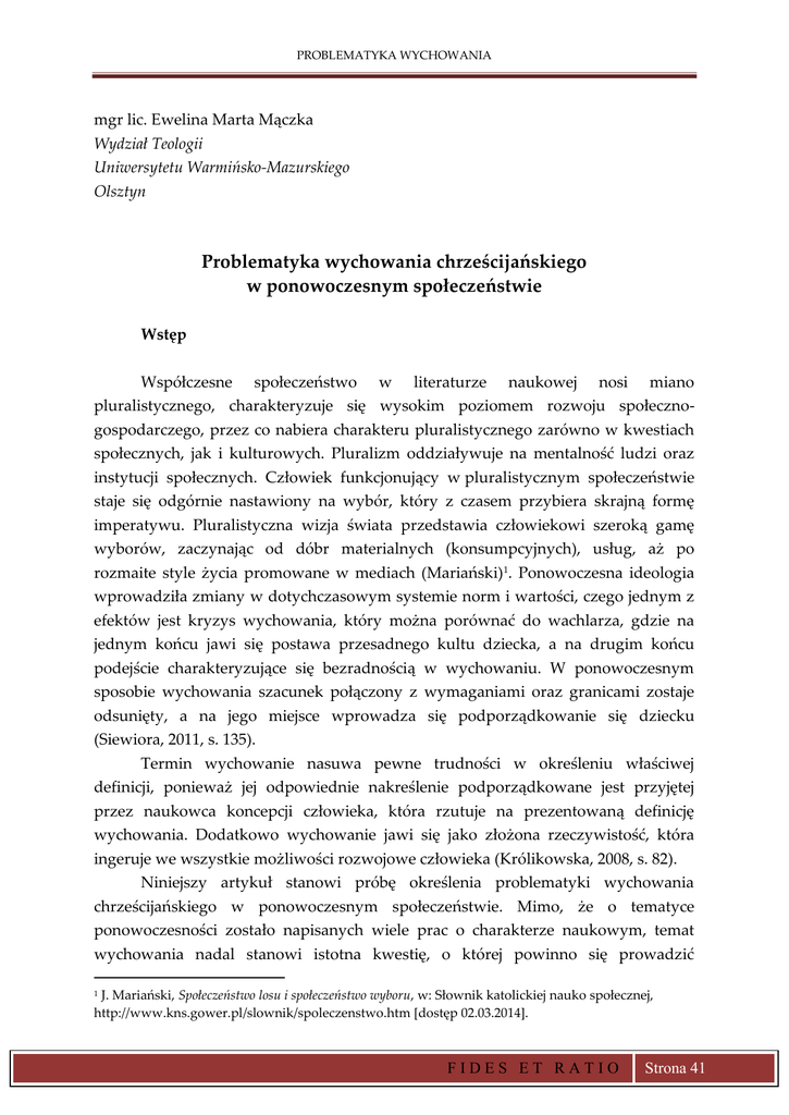 PROBLEMATYKA WYCHOWANIA mgr lic. Ewelina Marta Mączka Wydział Teologii Uniwersytetu Warmińsko-Mazurskiego Olsztyn Problematyka wychowania chrześcijańskiego w ponowoczesnym społeczeństwie Wstęp Współczesne społeczeństwo w literaturze naukowej nosi miano pluralistycznego, charakteryzuje się wysokim poziomem rozwoju społecznogospodarczego, przez co nabiera charakteru pluralistycznego zarówno w kwestiach społecznych, jak i kulturowych. Pluralizm oddziaływuje na mentalność ludzi oraz instytucji społecznych. Człowiek funkcjonujący w pluralistycznym społeczeństwie staje się odgórnie nastawiony na wybór, który z czasem przybiera skrajną formę imperatywu. Pluralistyczna wizja świata przedstawia człowiekowi szeroką gamę wyborów, zaczynając od dóbr materialnych (konsumpcyjnych), usług, aż po rozmaite style życia promowane w mediach (Mariański)1. Ponowoczesna ideologia wprowadziła zmiany w dotychczasowym systemie norm i wartości, czego jednym z efektów jest kryzys wychowania, który można porównać do wachlarza, gdzie na jednym końcu jawi się postawa przesadnego kultu dziecka, a na drugim końcu podejście charakteryzujące się bezradnością w wychowaniu. W ponowoczesnym sposobie wychowania szacunek połączony z wymaganiami oraz granicami zostaje odsunięty, a na jego miejsce wprowadza się podporządkowanie się dziecku (Siewiora, 2011, s. 135). Termin wychowanie nasuwa pewne trudności w określeniu właściwej definicji, ponieważ jej odpowiednie nakreślenie podporządkowane jest przyjętej przez naukowca koncepcji człowieka, która rzutuje na prezentowaną definicję wychowania. Dodatkowo wychowanie jawi się jako złożona rzeczywistość, która ingeruje we wszystkie możliwości rozwojowe człowieka (Królikowska, 2008, s. 82). Niniejszy artykuł stanowi próbę określenia problematyki wychowania chrześcijańskiego w ponowoczesnym społeczeństwie. Mimo, że o tematyce ponowoczesności zostało napisanych wiele prac o charakterze naukowym, temat wychowania nadal stanowi istotna kwestię, o której powinno się prowadzić J. Mariański, Społeczeństwo losu i społeczeństwo wyboru, w: Słownik katolickiej nauko społecznej, http://www.kns.gower.pl/slownik/spoleczenstwo.htm [dostęp 02.03.2014]. 1 FIDES ET RATIO Strona 41 dyskusje. W pierwszej części artykułu przedstawiona została ogólna charakterystyka ponowoczesnej koncepcji rzeczywistości. W części drugiej autorka stara się w sposób syntetyczny opisać wychowanie chrześcijański. W części trzeciej została podjęta próba przedstawienia problematyki wychowania chrześcijańskiego w ponowoczesnym społeczeństwie. Zamysłem autorki jest zaakcentowanie trudności i zagrożeń oraz ukazanie pozytywnych aspektów wychowania chrześcijańskiego. 1. Ponowoczesne społeczeństwo U progu XXI wieku stworzona została całkiem nowa osłona kulturową, w której ważne miejsce zajmują procesy takie jak: globalizacja, przemiany socjokulturowe oraz aksjologiczne, sekularyzacja, laicyzacja, a także pluralizm religijny. Rozwój technologii, komunikacji oraz migracja umożliwiły ludziom, prócz łączności, także zetknięcie się, doświadczenie różnych kultur i tradycji religijnych. (Bronk, 2000, s. 605). Relatywizm stanowi jedno z czołowych haseł ponowoczesnej kultury, która posiada dwa oblicza, mianowicie z jednej strony akcentuje wolność człowieka, ale z drugiej promuje aborcję i eutanazję. Jak widać, głoszona wolność oraz świadomość jest tylko pozorna i złudna, ponieważ człowiek w ponowoczesności jest przytłaczany przez masową ilość postaw, które powinien zaakceptować i według których powinien kierować swoim życiem, ponieważ relatywizm opowiada się za wielością prawd, nie ma jednej stałej i ostatecznej wartości, gdyż wszystko jest względne. Ponowoczesny relatywizm kwestionuje istnienie uniwersalnych kryteriów racjonalności i obiektywności, głosi, że każda religia jest prawdziwa dla jej wyznawców (tamże, s. 605). Ponadto w nowoczesności wszelkie kryteria dobra i zła, prawdy i fałszu, zdrowia i choroby, normalności i zaburzeń zależą wyłącznie od obowiązującej w danym momencie »poprawności« politycznej, od »sytuacji« czy od subiektywnych przekonań danej osoby (Dziewiecki)2. Relatywizm tworzy nową formę antropologii, która jawi się jako koncepcja ograniczona oraz naiwna, ponieważ zbyt mocno akcentuje możliwości człowieka, a spycha na drugi plan wszelkie zagrożenia oraz ograniczenia, będące nieodłączną częścią życia (tamże). Relatywizm umożliwił w ponowoczesności uformowanie się hipermarketu z ofertą nowej religijności bądź duchowości, gdzie człowiek może do koszyka wrzucać najróżniejsze postawy i światopoglądy, czasem nawet sprzeczne ze sobą. Ponowoczesna kultura stanowi pewien twór, składający się z różnych warstw (cech), M. Dziewiecki, Ewangelizacja w ponowoczesności, w: http://cywilizacja.ien.pl/?id=623, [dostęp: 12.02.2015]. 2 ISSN 2082-7067 1(21)2015 KWARTALNIK NAUKOWY PROBLEMATYKA WYCHOWANIA często sprzecznych, ale jednocześnie oddziaływują na siebie, tworząc społeczeństwo tylko na pozór spójne i szczęśliwe. Inną cechą ponowoczesności jest nihilizm, który kieruje człowieka w stronę obojętności we wszystkich sferach działalności człowieka. Nihilizm jest poglądem filozoficznym, w którym postuluje się odejście od Boga. Człowiek-nihilista traci sens życia, staje się zagubiony i podatny na wszelkie nowości, ponieważ wszystko ma sens i zarazem go nie ma. Nihilizm prowadzi do tego, że człowiek przestaje się czymkolwiek interesować, cokolwiek przeżywać – stając się duchową i intelektualną pustynią. Dla nihilisty ważna jest jedynie teraźniejszość pojmowana jako tymczasowość, gdzie człowiek za wszelką cenę pragnie odnieść sukces niezależnie od kosztów. Wszelkie trudności, a zwłaszcza porażki, uznawane są za życiową trag