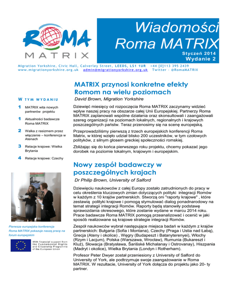 Wiadomości Roma MATRIX Styczeń 2014 Wydanie 2 M i g r a t i o n Y o r k s h i r e , C i v i c H a l l , C a l v e r l e y S t r e e t , LE E D S , L S 1 1 U R + 4 4 [ 0 ] 1 1 3 3 9 5 2 4 3 9 www.migrationyorkshire.org.uk [email protected] Twitter - @RomaMATRIX MATRIX przynosi konkretne efekty Romom na wielu poziomach W 1 1 2 3 4 TYM WYDANIU MATRIX wita nowych partnerów projektu Aktualności badawcze Roma MATRIX David Brown, Migration Yorkshire Dziewięć miesięcy od rozpoczęcia Roma MATRIX zaczynamy widzieć wpływ naszej pracy na obszarze całej Unii Europejskiej. Partnerzy Roma MATRIX zaplanowali wspólne działania oraz skonsultowali i zaangażowali szereg organizacji na poziomach lokalnych, regionalnych i krajowych poszczególnych państw. Teraz przenosimy się na scenę europejską. Walka z rasizmem przez włączenie – konferencja w Atenach Przeprowadziliśmy pierwszą z trzech europejskich konferencji Roma Matrix, w której wzięło udział blisko 200 uczestników, w tym czołowych polityków, z silnym głosem greckiej społeczności romskiej. Relacje krajowe: Wielka Brytania Zbliżając się do końca pierwszego roku projektu, chcemy pokazać jego dorobek na poziomie lokalnym, krajowym i europejskim. Relacje krajowe: Czechy Nowy zespół badawczy w poszczególnych krajach Dr Philip Brown, University of Salford Dziewięciu naukowców z całej Europy zostało zatrudnionych do pracy w celu określenia kluczowych zmian dotyczących polityki integracji Romów w każdym z 10 krajów partnerskich. Stworzą oni "raporty krajowe" , które zestawią polityki krajowe i pomogą stymulować dialog ponadnarodowy na temat strategii integracji Romów. Raporty będą stanowiły podstawę sprawozdania okresowego, które zostanie wydane w marcu 2014 roku. Prace badawcze Roma MATRIX pomogą przeanalizować i ocenić w jaki sposób realizowane są krajowe strategie integracji Romów. Pierwsza europejska konferencja Roma MATRIX pokazuje naszą pracę na forum europejskim Zespół naukowców wybrał następujące miejsca badań w każdym z krajów partnerskich: Bułgaria (Sofia i Montana), Czechy (Praga i Ustia nad Łabą), Grecja (Ateny i okolice) , Węgry (Budapeszt i Batanyterenyei), Włochy (Rzym i Lacjum), Polska (Warszawa, Wrocław), Rumunia (Bukareszt i Kluż), Słowacja (Bratysława, Šarišské Michalanay i Ostrovanay), Hiszpania (Madryt i okolice), Wielka Brytania (Londyn i Rotherham). Profesor Peter Dwyer został przeniesiony z University of Salford do University of York, ale podtrzymuje swoje zaangażowanie w Roma MATRIX. W rezultacie, University of York dołącza do projektu jako 20- ty partner. Strona 2 Wiadomości Roma MATRIX Ateny – Konferencja „Walka z rasizmem przez włączenie” John Donegan, Migration Yorkshire “… Romowie nie powinni pozostać niewidoczni w dziejach historii Europy, ponieważ już od wieków są Europejczykami ...” Trzydniowe spotkanie w ramach projektu w Atenach w listopadzie 2013 zawierało pierwszą z trzech konferencji europejskich Roma MATRIX. Konferencja - Walka z rasizmem poprzez włączenie - zgromadziła ponad 150 osób, w tym Romów, agencje, polityków i urzędników z całej Grecji i Europy i dała im możliwość wyrażenia swoich poglądów na temat walki z rasizmem względem Romów. Wśród głównych prelegentów byli: Lina Papamichalopolou, szef polityki przeciw dyskryminacji i koordynacji romskiej w KE - Departament Sprawiedliwości, Ioannis Dimitrakopoulos, szef Komisji ds. Równości w Europejskiej Agencji Praw Podstawowych UE oraz radny Rady Miasta Rotherham (UK) Roger Stone, który jest sprawozdawcą ds. strategii integracji Romów przy Komisji Regionów Unii Europejskiej . Konferencja dotyczyła prac partnerów projektu Roma MATRIX, zwalczania rasizmu i wspierania integracji w swoich krajach. Prelegenci omówili również postępy poczynione w strategii integracji Romów i problem ciągłej dyskryminacji Romów w mediach. Było również odniesienie do niedawnej akcji "Blonde Angel” w Grecji i protestów przeciwko deportacji Romów we Francji. Ważnym elementem jest poprawa sposobu pracy państw członkowskich i organizacji w celu rozwiązania problemu integracji Romów. Grupy warsztatowe skoncentrowały się na temacie pracy, zdrowia i dzieci, zgromadziły one specjalistów i członków społeczności romskiej w celu zbadania postępów w integracji Romów w różnych państwach członkowskich i dzielenia się swoimi doświadczeniami. Konferencję zakończyły dyskusje panelowe, dając publiczności możliwość zapytania prelegentów. Warsztaty poświęcone problemom dzieci w czasie konferencji w Atenach Pytania zawierały wyzwanie dla UE, aby znaleźć sposoby na wspólną strategię integracji, istotną dla życia zwykłych Romów, których problemy są często bardzo odizolowane. Była również sugestia, że Romowie nie powinni być nie zauważani w treści głównego nurtu historii europejskiej, ponieważ są oni Europejczykami od wieków . Inne pytania dotyczyły "tyranii większości", która może utrudniać politykom podjęcie skutecznych działań na rzecz integracji Romów w obawie o alienację nie- Romów, którzy stanowią większość ich wyborców. Następna konferencja Roma MATRIX na temat zadośćuczynienia i wsparcia odbędzie się w Budapeszcie 25 czerwca 2014 roku. Partnerzy projektu Roma MATRIX Lider: Migration Yorkshire, Urząd Miasta Leeds, UK. Bułgaria: Narodowe Stowarzyszenie Mediatorów Zdrowia, Stowarzyszenie Młodych Psychologów w Bułgarii, Administracja Regionu Varna. Czechy: Stowarzyszenie IQ Roma Service. Grecja: Action Synergy SA. Węgry: Stowarzyszenie na Rzecz Dzieci Adoptowanych, Obywatelskie Stowarzyszenie Romów, Wheel of Future Fundacja Użyteczności Publicznej. Wiadomości Roma MATRIX Strona 3 News Relacje krajowe: Wielka Brytania Carol Adamson, Rotherham, Marie McLelland, Glasgow i John Donegan, Migration Yorkshire Rotherham: Partner projektu Roma MATRIX Rada Rotherham służy po