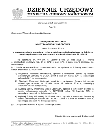 Warszawa, dnia 9 czerwca 2014 r. Poz. 181 Departament Nauki i Szkolnictwa Wojskowego ZARZĄDZENIE Nr 11/MON MINISTRA OBRONY NARODOWEJ z dnia 6 czerwca 2014 r. w sprawie ustalenia warunków i trybu przyjęć na studia kandydatów na żołnierzy zawodowych do uczelni wojskowych w roku akademickim 2015/2016 Na podstawie art. 169 ust. 17 ustawy z dnia 27 lipca 2005 r. – Prawo o szkolnictwie wyższym (Dz. U. z 2012 r. poz. 572, z późn. zm.1)) zarządza się, co następuje: § 1. Ustala się warunki i tryb przyjęć na studia kandydatów na żołnierzy zawodowych na rok akademicki 2015/2016 do: 1) Wojskowej Akademii Technicznej, zgodnie z wnioskiem Senatu tej uczelni uchwalonym uchwałą Nr 24/WAT/2014 z dnia 27 marca 2014 r., stanowiącą załącznik Nr 1 do zarządzenia; 2) Akademii Marynarki Wojennej, zgodnie z wnioskiem Senatu tej uczelni uchwalonym uchwałą Nr 16/2014 z dnia 17 kwietnia 2014 r., stanowiącą załącznik Nr 2 do zarządzenia; 3) Wyższej Szkoły Oficerskiej Wojsk Lądowych, zgodnie z wnioskiem Senatu tej uczelni uchwalonym uchwałą Nr 12/IV/2014 z dnia 10 kwietnia 2014 r., stanowiącą załącznik Nr 3 do zarządzenia; 4) Wyższej Szkoły Oficerskiej Sił Powietrznych, zgodnie z wnioskiem Senatu tej uczelni uchwalonym uchwałą Nr 13/LXXXIX/2014 r. z dnia 28 kwietnia 2014 r., stanowiącą załącznik Nr 4 do zarządzenia. § 2. Zarządzenie wchodzi w życie z dniem ogłoszenia. Minister Obrony Narodowej: T. Siemoniak 1) Zmiany tekstu jednolitego wymienionej ustawy zostały ogłoszone w Dz. U. z 2012 r. poz. 742 i 1544, z 2013 r. poz. 675, 829, 1005, 1588 i 1650 oraz z 2014 r. poz. 7. Załączniki do zarządzenia Nr11/MON Ministra Obrony Narodowej z dnia 06.06.2014 r. (poz. 181) Załącznik nr 1 Uchwała Senatu Wojskowej Akademii Technicznej im. Jarosława Dąbrowskiego nr 24/WAT/2014 z dnia 27 marca 2014 r. w sprawie wniosku do Ministra Obrony Narodowej o ustalenie warunków i trybu przyjęcia na studia wyższe kandydatów na żołnierzy zawodowych do Wojskowej Akademii Technicznej im. Jarosława Dąbrowskiego w roku akademickim 2015/2016 Na podstawie art. 169 ust. 17 ustawy z dnia 27 lipca 2005 r. - Prawo o szkolnictwie wyższym (Dz. U. z 2012 r. poz. 572, z późn. zm.) uchwala się, co następuje: §1 Senat WAT zwraca się z wnioskiem do Ministra Obrony Narodowej o ustalenie warunków i trybu przyjęcia na studia wyższe kandydatów na żołnierzy zawodowych do Wojskowej Akademii Technicznej im. Jarosława Dąbrowskiego w roku akademickim 2015/2016 na warunkach i w trybie określonym w załączniku do uchwały. §2 Uchwała wchodzi w życie z dniem podjęcia. Przewodniczący gen bryg. prof. dr hab. inż. Zygmunt MIERCZYK 2 Załącznik do uchwały Senatu WAT Nr 24/WAT/2014 z dnia 27 marca 2014 r. WARUNKI I TRYB PRZYJĘCIA NA STUDIA WYŻSZE KANDYDATÓW NA ŻOŁNIERZY ZAWODOWYCH DO WOJSKOWEJ AKADEMII TECHNICZNEJ IM. JAROSŁAWA DĄBROWSKIEGO W ROKU AKADEMICKIM 2015/2016 §1 1. O przyjęcie na studia w charakterze kandydata na żołnierza zawodowego, zwane dalej „studiami”, do Wojskowej Akademii Technicznej im. Jarosława Dąbrowskiego, zwanej dalej „Akademią”, może ubiegać się osoba niebędąca żołnierzem2 (kandydat lub kandydatka) spełniająca niżej wymienione warunki określone w art. 124 ust. 2 ustawy z dnia 11 września 2003 r. o służbie wojskowej żołnierzy zawodowych (Dz. U. z 2010 r. Nr 90, poz. 593, z późn. zm.): 1) posiada obywatelstwo polskie; 2) jest niekarana sądownie; 3) posiada zdolność fizyczną i psychiczną do zawodowej służby wojskowej; 4) posiada wiek co najmniej 18 lat; 5) posiada świadectwo dojrzałości. 2. Zdolność fizyczną i psychiczną kandydata do pełnienia zawodowej służby wojskowej ustalają i wydają orzeczenia wojskowe komisje lekarskie i wojskowe pracownie psychologiczne, do których kandydat jest kierowany przez wojskowego komendanta uzupełnień, po złożeniu w Akademii wniosku, o którym mowa w § 2 ust. 2 pkt. 2 lit. a. 3. Do przeprowadzenia postępowania rekrutacyjnego rektor powołuje: uczelnianą komisję rekrutacyjną, wydziałowe komisje rekrutacyjne, komisję do przeprowadzenia testu sprawności fizycznej, komisję do przeprowadzenia testu znajomości języka angielskiego oraz komisję do przeprowadzenia rozmów kwalifikacyjnych z kandydatami na żołnierzy zawodowych. 4. Postępowanie rekrutacyjne przeprowadza się na poszczególne kierunki studiów. Podział na specjalności dokonywany jest w trakcie studiów. Dopuszcza się możliwość wstępnego podziału na specjalności w trakcie rozmowy kwalifikacyjnej, o której mowa w § 3. 5. Preferowany kierunek studiów kandydat określa we wniosku o przyjęcie na studia. Kandydat ma prawo określić do trzech kierunków studiów w przypadku nieprzyjęcia na pierwszy kierunek - wniosek kandydata jest rozpatrywany kolejno na drugim i trzecim określonym przez niego kierunku studiów. 6. Kandydat, który nie został przyjęty na studia w charakterze kandydata na żołnierza zawodowego, może ubiegać się o przyjęcie na studia w Akademii w trybie przewidzianym dla osób cywilnych. 2 zasady kierowania żołnierzy zawodowych na studia do Akademii normują przepisy ustawy z dnia 11 września 2003 r. o służbie wojskowej żołnierzy zawodowych 3 7. Limity miejsc na poszczególne kierunki studiów ustala Minister Obrony Narodowej. Ustalenie limitu miejsc na określony kierunek studiów oznacza uruchomienie rekrutacji na ten kierunek studiów. §2 1. Rejestracja kandydatów na studia prowadzona jest na szczeblu Akademii (centralnie), wyłącznie za pośrednictwem Internetowej Rejestracji Kandydatów, zwanej dalej „IRK”. 2. Proces rejestracji obejmuje: 1) wypełnienie (poprzez IRK) podania-ankiety o przyjęcie na studia w terminie do 31 marca; 2) dostarczenie do Akademii w terminie do 31 marca: a) wniosku (w formie papierowej) do rektora o przyjęcie na studia w charakterze kandydata na żołnierza zawodowego, według wzoru ustalonego w rozporządzeni