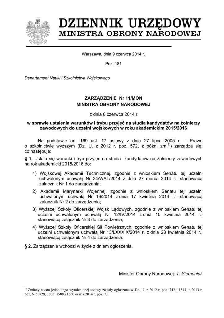 ZARZĄDZENIE Nr 11/MON MINISTRA OBRONY