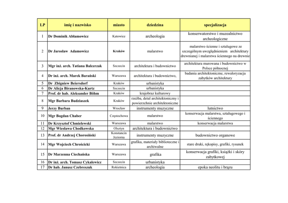 LP 1 imię i nazwisko Dr Dominik Abłamowicz miasto dziedzina specjalizacja Katowice archeologia konserwatorstwo i muzealnictwo archeologiczne malarstwo ścienne i sztalugowe ze szczególnym uwzględnieniem architektury drewnianej i malarstwa ściennego na drewnie 2 Dr Jarosław Adamowicz Kraków malarstwo 3 Mgr inż. arch. Tatiana Balcerzak Szczecin architektura i budownictwo 4 Dr inż. arch. Marek Barański Warszawa architektura i budownictwo, 5 7 Dr Zbigniew Beiersdorf Dr Alicja Biranowska-Kurtz Prof. dr hab. Aleksander Böhm Kraków Szczecin Kraków 8 Mgr Barbara Budziaszek Kraków urbanistyka urbanistyka krajobraz kulturowy rzeźba, detal architektoniczny i powierzchnie architektoniczne 9 Jerzy Burban Wrocław instrumenty muzyczne Częstochowa malarstwo 11 Dr Krzysztof Chmielewski Warszawa malarstwo 12 Mgr Wiesława Chodkowska Olsztyn Konstancin Jeziorna architektura i budownictwo 6 10 Mgr Bogdan Chaber 13 Prof. dr Andrzej Chorosiński architektura murowana i budownictwo w Polsce północnej badania architektoniczne, rewaloryzacja zabytków architektury lutnictwo konserwacja malarstwa, sztalugowego i ściennego konserwacja malarstwa instrumenty muzyczne budownictwo organowe 14 Mgr Wojciech Chrościcki Warszawa grafika, materiały biblioteczne i archiwalne stare druki, rękopisy, grafiki, rysunek 15 Dr Marzenna Ciechańska Warszawa grafika konserwacja grafiki, książki i skóry zabytkowej Szczecin urbanistyka archeologia 16 Dr inż. arch. Tomasz Cykalewicz 17 Dr hab. Janusz Czebreszuk Rokietnica epoka neolitu i brązu LP imię i nazwisko miasto dziedzina specjalizacja wycena, stwierdzanie orginalności i autetnyczności istrumentów smyczkowych, lutniczych 18 Mgr Bartłomiej Dankiewicz Kraków instrumenty muzyczne 19 Dr inż. Lech Engel Wrocław architektura i budownictwo architektura i budownictwo, urbanistyka konstrukcje w obiektach zabytkowych 20 Dr inż. arch. Marcin Gawlicki Sopot 21 Dr Ewa Gwiazdowska-Banaszek Szczecin grafika dawna grafika europejska 22 Mgr Hanna Horwatt-Baniewicz Toruń malarstwo malarstwo ścienne i sztalugowe Warszawa rzemiosło artystyczne i sztuka uzytkowa tkaniny zabytkowe Ujazd zabezpieczenie techniczne zabytków 25 Prof. dr hab. Jerzy Jasieńko Wrocław architektura i budownictwo 26 Mgr Marcin Jasionowicz Kraków ocena i wycena zabytków ruchomych ekspertyzy, wyceny i kompleksowa dokumentacja zabytków ruchomych 27 Mgr Barbara Kalfas Kraków rzemiosło artystyczne i sztuka uzytkowa konserwacja tkanin 28 Mgr inż. Antoni Kapuściński Gdynia 23 Prof. Helena Hryszko 24 Mgr Andrzej Jachimczak architektura i budownictwo konstrukcja i ustroje budowlane rzemiosło artystyczne i sztuka użytkowa architektura i budownictwo, zabytki techniki konserwacja witraży, przeszkleń i szkła zabytkowego konstrukcje inżynierskie i budowlane oraz zabytki techniki krajobraz kulturowy, krajobraz warowny, fortyfikacje, budowle obronne, parki i ogrody ochrona miast historycznych i krajobrazu kulturowego 29 Dr Paweł Karaszkiewicz Kraków 30 Dr inż. Stanisław Karczmarczyk Kraków 31 Mgr inż. arch. kraj. Lidia Klupsz Warszawa krajobraz kulturowy Dr hab. inż. arch. Danuta KłosekKozłowska Warszawa urbanistyka, krajobraz kulturowy 32 LP imię i nazwisko 33 Dr hab. Zbigniew Kobyliński miasto dziedzina Latchorzew archeologia 34 Prof. dr hab. Andrzej Kokowski Lublin archeologia 35 Mgr Robert Kola Toruń Toruń zabytki techniki 36 Mgr Jolanta Korcz 37 Mgr Bogusław Kornecki 38 Prof. Grażyna Korpal Warszawa Kraków specjalizacja zarządzanie dziedzictwem archeologicznym; ochrona zabytków archeologicznych archeologia pradziejowa i powszechna, ochrona archeologicznego dziedzictwa kulturowego malarstwo malarstwo ścienne i sztalugowe rzeźba, detal architektoniczny i powierzchnie architektoniczne malarstwo konserwacja malarstwa konserwacja malowideł i dekoracji ściennych oraz powierzchni architektonicznych, malarstwo przenoszenie malowideł ściennych, projektowanie konserwatorskie konserwacja rzeźby kamiennej i elementów rzeźba, detal architektoniczny i architektury oraz zastosowań technik powierzchnie architektoniczne laserowych w konserwacji dzieł sztuki 39 Prof. Edward Kosakowski Modlnica 40 Prof. Andrzej Koss Warszawa 41 Mgr Krystyn Kozieł Kraków rzeźba, detal architektoniczny i powierzchnie architektoniczne konserwacja rzeźby i detalu architektonicznego 42 Dr hab. Janusz Krawczyk Toruń rzemiosło artystyczne i sztuka użytkowa konserwacja mebli zabytkowych 43 Dr Katarzyna Kuligowska Legionowo zabytki techniki historia techniki, historia motoryzacji Kraków architektura i budownictwo, urbanistyka Wrocław architektura i budownictwo konserwacja zabytków architektury i urbanistyki badania architektoniczne i konserwacja zabytków 44 Prof. dr hab. inż. arch. Kazimierz Kuśnierz 45 Dr inż. arch. Andrzej Legendziewicz LP imię i nazwisko miasto dziedzina architektura nowożytna, ocena wartości i architektura i budownictwo konserwacji architektury historyzmu i modernizmu (XIX i XX w) 46 Prof. nadzw. dr hab. Jakub Lewicki Warszawa 47 Dr hab.Maria Lubryczyńska Warszawa malarstwo 48 Mgr Andrzej Łojszczyk Prof. nadzw. dr hab. Jadwiga 49 Łukaszewicz Warszawa malarstwo rzeźba, detal architektoniczny i powierzchnie architektoniczne Toruń Mgr Grażyna Macander 50 Majkowska Brwinów 51 Dr inż. arch. Beata Makowska Szczecin 52 Dr inż. Maciej Małachowicz Wrocław 53 Ks. Dr hab. Piotr Maniurka Opole grafika, malarstwo 54 Dr inż. Stanisław Marduła Zakopane 55 Inż. Józef Mariański Warszawa architektura i budownictwo 56 Mgr inż. arch. Dominik Mączyński Warszawa architektura i budownictwo Kraków krajobraz kulturowy Prof. dr hab. inż. arch. Anna Mitkowska 58 Mgr Janusz Mróz 59 Prof. nadzw. dr hab. inż. arch. Zbigniew Myczkowski 60 Mgr inż. Piotr Napierała 61 Mgr Lech Narębski Warszawa Kraków Wrocław Toruń konserwacja i restauracja malarstwa sztalugowego i ściennego konserwacja książki, grafiki, skóry zabytkowej, archiwaliów, malarstwa na papierze i