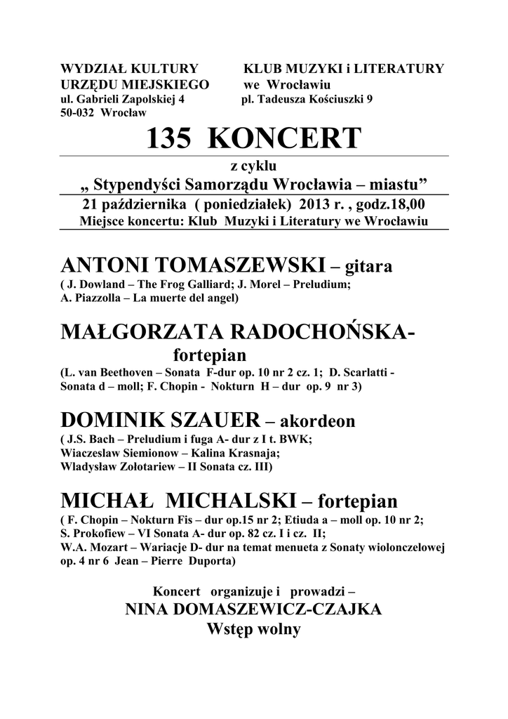 WYDZIAŁ KULTURY URZĘDU MIEJSKIEGO KLUB MUZYKI i LITERATURY we Wrocławiu ul. Gabrieli Zapolskiej 4 50-032 Wrocław pl. Tadeusza Kościuszki 9 135 KONCERT z cyklu „ Stypendyści Samorządu Wrocławia – miastu” 21 października ( poniedziałek) 2013 r. , godz.18,00 Miejsce koncertu: Klub Muzyki i Literatury we Wrocławiu ANTONI TOMASZEWSKI – gitara ( J. Dowland – The Frog Galliard; J. Morel – Preludium; A. Piazzolla – La muerte del angel) MAŁGORZATA RADOCHOŃSKAfortepian (L. van Beethoven – Sonata F-dur op. 10 nr 2 cz. 1; D. Scarlatti Sonata d – moll; F. Chopin - Nokturn H – dur op. 9 nr 3) DOMINIK SZAUER – akordeon ( J.S. Bach – Preludium i fuga A- dur z I t. BWK; Wiaczeslaw Siemionow – Kalina Krasnaja; Wladysław Zołotariew – II Sonata cz. III) MICHAŁ MICHALSKI – fortepian ( F. Chopin – Nokturn Fis – dur op.15 nr 2; Etiuda a – moll op. 10 nr 2; S. Prokofiew – VI Sonata A- dur op. 82 cz. I i cz. II; W.A. Mozart – Wariacje D- dur na temat menueta z Sonaty wiolonczelowej op. 4 nr 6 Jean – Pierre Duporta) Koncert organizuje i prowadzi – NINA DOMASZEWICZ-CZAJKA Wstęp wolny