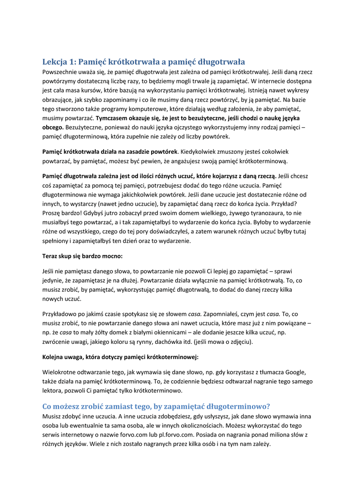 Lekcja 1: Pamięć krótkotrwała a pamięć długotrwała Powszechnie uważa się, że pamięć długotrwała jest zależna od pamięci krótkotrwałej. Jeśli daną rzecz powtórzymy dostateczną liczbę razy, to będziemy mogli trwale ją zapamiętać. W internecie dostępna jest cała masa kursów, które bazują na wykorzystaniu pamięci krótkotrwałej. Istnieją nawet wykresy obrazujące, jak szybko zapominamy i co ile musimy daną rzecz powtórzyć, by ją pamiętać. Na bazie tego stworzono także programy komputerowe, które działają według założenia, że aby pamiętać, musimy powtarzać. Tymczasem okazuje się, że jest to bezużyteczne, jeśli chodzi o naukę języka obcego. Bezużyteczne, ponieważ do nauki języka ojczystego wykorzystujemy inny rodzaj pamięci – pamięć długoterminową, która zupełnie nie zależy od liczby powtórek. Pamięć krótkotrwała działa na zasadzie powtórek. Kiedykolwiek zmuszony jesteś cokolwiek powtarzać, by pamiętać, możesz być pewien, że angażujesz swoją pamięć krótkoterminową. Pamięć długotrwała zależna jest od ilości różnych uczuć, które kojarzysz z daną rzeczą. Jeśli chcesz coś zapamiętać za pomocą tej pamięci, potrzebujesz dodać do tego różne uczucia. Pamięć długoterminowa nie wymaga jakichkolwiek powtórek. Jeśli dane uczucie jest dostatecznie różne od innych, to wystarczy (nawet jedno uczucie), by zapamiętać daną rzecz do końca życia. Przykład? Proszę bardzo! Gdybyś jutro zobaczył przed swoim domem wielkiego, żywego tyranozaura, to nie musiałbyś tego powtarzać, a i tak zapamiętałbyś to wydarzenie do końca życia. Byłoby to wydarzenie różne od wszystkiego, czego do tej pory doświadczyłeś, a zatem warunek różnych uczuć byłby tutaj spełniony i zapamiętałbyś ten dzień oraz to wydarzenie. Teraz skup się bardzo mocno: Jeśli nie pamiętasz danego słowa, to powtarzanie nie pozwoli Ci lepiej go zapamiętać – sprawi jedynie, że zapamiętasz je na dłużej. Powtarzanie działa wyłącznie na pamięć krótkotrwałą. To, co musisz zrobić, by pamiętać, wykorzystując pamięć długotrwałą, to dodać do danej rzeczy kilka nowych uczuć. Przykładowo po jakimś czasie spotykasz się ze słowem casa. Zapomniałeś, czym jest casa. To, co musisz zrobić, to nie powtarzanie danego słowa ani nawet uczucia, które masz już z nim powiązane – np. że casa to mały żółty domek z białymi okiennicami – ale dodanie jeszcze kilka uczuć, np. zwrócenie uwagi, jakiego koloru są rynny, dachówka itd. (jeśli mowa o zdjęciu). Kolejna uwaga, która dotyczy pamięci krótkoterminowej: Wielokrotne odtwarzanie tego, jak wymawia się dane słowo, np. gdy korzystasz z tłumacza Google, także działa na pamięć krótkoterminową. To, że codziennie będziesz odtwarzał nagranie tego samego lektora, pozwoli Ci pamiętać tylko krótkoterminowo. Co możesz zrobić zamiast tego, by zapamiętać długoterminowo? Musisz zdobyć inne uczucia. A inne uczucia zdobędziesz, gdy usłyszysz, jak dane słowo wymawia inna osoba lub ewentualnie ta sama osoba, ale w innych okolicznościach. Możesz wykorzystać do tego serwis internetowy o nazwie forvo.com lub pl.forvo.com. Posiada on nagrania ponad miliona słów z różnych języków. Wiele z nich zostało nagranych przez kilka osób i na tym nam zależy. Oczywiście możesz poszukać też innych serwisów internetowych, które mają nagrania innych lektorów. Zapamiętaj: sukces zapewni Ci to, co jest różne, a nie liczba powtórek. Kilka uwag na temat pamięci długotrwałej Przekładanie zdjęć a pamięć długotrwała Nie przekładaj zdjęć dla samego ich przekładania lub by spojrzeć na to, co już widziałeś i doskonale pamiętasz. To znowu jest powtarzanie i nie działa, a Ty tego nie potrzebujesz. W ten sposób nie wzmocnisz ani pamięci, ani koncentracji, a jedynie przedłużysz swoją pamięć o kilka dni czy tygodni. Zamiast tego przekładaj zdjęcia, by odnaleźć na nich kolejne szczegóły, które wcześniej Ci umknęły, na przykład dlatego, że Twoja koncentracja nie jest jeszcze dostatecznie rozwinięta, by dostrzec wszystko za pierwszym razem. Jeśli na danym zdjęciu nie będzie już niczego, co możesz zauważyć, niczego nowego albo też nie będziesz mógł dodać niczego w swojej wyobraźni, to odłóż je, ponieważ w tym momencie będzie już nieprzydatne. Czasami może się zdarzyć, że przeglądając dane zdjęcie, zapomnisz, jakie było słowo, które wykorzystałeś, by je znaleźć. Nie przejmuj się tym i wciąż skupiaj się na szczegółach na tym zdjęciu. Innym razem, mając już różne uczucia przypisane do tego zdjęcia, będziesz w stanie połączyć dane słowo ze szczegółami z fotografii. I będzie to możliwe tylko wtedy. Szczególnie gdy dane słowo usłyszysz lub zobaczysz w różnych kombinacjach, połączysz je ze szczegółami ze zdjęcia. ----------------------------------Wejdź tutaj i zapoznaj się z nową ofertą 2 Tajemnicy Poliglotów – częścią całej metody językowej 5S.