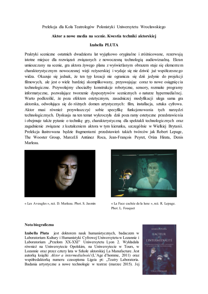 Prelekcja dla Koła Teatrologów Polonistyki Uniwersytetu Wrocławskiego Aktor a nowe media na scenie. Kwestia techniki aktorskiej Izabella PLUTA Praktyki sceniczne ostatnich dwudziestu lat wyjątkowo oryginalne i zróżnicowane, rezerwują istotne miejsce dla rozwiązań związanych z nowoczesną technologią audiowizualną. Ekran umieszczany na scenie, gra aktora żywego planu z wyświetlanym obrazem staje się elemente m charakterystycznym nowoczesnej wizji reżyserskiej i wydaje się nie dziwić już współczesne go widza. Okazuje się jednak, że ten typ kreacji nie ogranicza się dziś jedynie do projekcji filmowych, ale jest o wiele bardziej skomplikowany, przyswajając coraz to nowe osiągnię c ia technologiczne. Przywołajmy chociażby konstrukcje robotyczne, sensory, rozmaite programy informatyczne, pozwalające tworzenie dyspozytywów scenicznych o naturze hypermedialnej. Warto podkreślić, że poza efektem estetycznym, zasadniczej modyfikacji ulega sama gra aktorska, odwołująca się do różnych domen artystycznych: film, installacja, sztuka cyfrowa. Aktor musi również przywłaszczyć sobie specyfikę funkcjonowania tych narzędzi technologicznych. Dyskusja na ten temat wykroczyła dziś poza ramy estetyczne przedstawie nia i obejmuje także pytanie o technikę gry, charakterystyczną dla spektakli technologicznych oraz zagadnienie związane z kształceniem aktora w tym kierunku, szczególnie w Wielkiej Brytanii. Prelekcja ilustrowana będzie fragmentami przedstawień takich twórców jak Robert Lepage, The Wooster Group, Marcel.lí Antúnez Roca, Jean-François Peyret, Oriza Hirata, Denis Marleau. « Les Aveugles », reż. D. Marleau. Phot. S. Jasmin « La Face cachée de la lune », reż. R. Lepage. Phot. L. Fouquet Nota biograficzna Izabella Pluta jest doktorem nauk humanistycznych, badaczem w Laboratorium Kultury i Humanistyki Cyfrowej Uniwersytetu w Lozannie i Laboratorium „Przełom XX-XXI” Uniwersytetu Lyon 2. Wykładała również na Uniwersytecie Opolskim, na Uniwersytecie w Tours, w Lozannie oraz przez cztery lata w Szkole aktorskiej La Manufacture. Jest autorką książki Aktor a intermedialność (L’Age d’homme, 2011) oraz współredaktorką numeru czasopisma Ligeia pt: „Teatry Laboratoria. Badania artystyczne a nowe technologie w teatrze (marzec 2015). Jej artykuły są publikowane w języku polskim, francuskim i angielskim w prasie specjalistycznej (Ligeia, Teatr, Revue de théâtre. Jeu) jak i w pracach zbiorowych (ostatnio Pratiques performatives. Body Remix pod redakcją J. Féral, 2012) . Jest członkiem dwóch grup badawczych: Intermedialność w teatrze (FIRT), Performatywność a efekty obecności (przy Uniwersytecie Quebeku w Montrealu), jak również krytykiem teatralnym i tłumaczką. Kieruje też strukturą badawczą i artystyczną Theatre in Progress w Lozannie. Redaguje obecnie następujące prace zbiorowe: „Salle d’attente Krystiana Lupy”, „Współczesny reżyser a tożsamość artystyczna” oraz „Scena cyfrowa. Manifesty”. www.izabellapluta.com