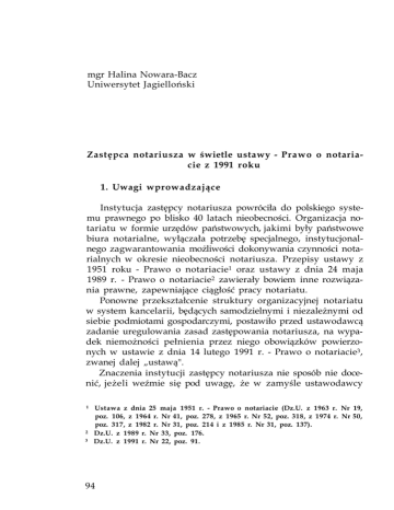 mgr Halina Nowara-Bacz Uniwersytet Jagielloński Zastępca notariusza w świetle ustawy - Prawo o notariacie z 1991 roku 1. Uwagi wprowadzające Instytucja zastępcy notariusza powróciła do polskiego systemu prawnego po blisko 40 latach nieobecności. Organizacja notariatu w formie urzędów państwowych, jakimi były państwowe biura notarialne, wyłączała potrzebę specjalnego, instytucjonalnego zagwarantowania możliwości dokonywania czynności notarialnych w okresie nieobecności notariusza. Przepisy ustawy z 1951 roku - Prawo o notariacie 1 oraz ustawy z dnia 24 maja 1989 r. - Prawo o notariacie2 zawierały bowiem inne rozwiązania prawne, zapewniające ciągłość pracy notariatu. Ponowne przekształcenie struktury organizacyjnej notariatu w system kancelarii, będących samodzielnymi i niezależnymi od siebie podmiotami gospodarczymi, postawiło przed ustawodawcą zadanie uregulowania zasad zastępowania notariusza, na wypadek niemożności pełnienia przez niego obowiązków powierzonych w ustawie z dnia 14 lutego 1991 r. - Prawo o notariacie3, zwanej dalej „ustawą". Znaczenia instytucji zastępcy notariusza nie sposób nie docenić, jeżeli weźmie się pod uwagę, że w zamyśle ustawodawcy 1 2 3 Ustawa z dnia 25 maja 1951 r. - Prawo o notariacie (Dz.U. z 1963 r. Nr 19, poz. 106, z 1964 r. Nr 41, poz. 278, z 1965 r. Nr 52, poz. 318, z 1974 r. Nr 50, poz. 317, z 1982 r. Nr 31, poz. 214 i z 1985 r. Nr 31, poz. 137). Dz.U. z 1989 r. Nr 33, poz. 176. Dz.U. z 1991 r. Nr 22, poz. 91. 94 Zastępca notariusza w świetle.. kancelarie notarialne powinny być nieustannie dostępne dla klientów. Taka konkluzja nasuwa się nieodparcie, gdy uwzględni się następujące postanowienia ustawy: 1) kancelaria notarialna winna być uruchomiona w ciągu 2 miecięcy od daty zawiadomienia notariusza o powołaniu go przez ministra sprawiedliwości (art. 14 ustawy), 2) od chwili uruchomienia kancelaria musi być czynna w powszednich dniach tygodnia, przez co najmniej 6 godzin dziennie (art. 20 § 1 ustawy), 3) ustawa nie przewiduje „zamknięcia" kancelarii albo „zawieszenia" jej działalności na czas urlopu notariusza względnie innej usprawiedliwionej przeszkody w pełnieniu obowiązków, 4) działalność kancelarii ustaje dopiero na skutek odwołania notariusza przez ministra sprawiedliwości, jeżeli zachodzi jedna z przesłanek przewidzianych w art. 16 ustawy. Tak więc notariusz może korzystać z wypoczynku, leczyć się, załatwiać ważne życiowe sprawy tylko pod warunkiem, że jego obowiązki w kancelarii przejmie w tym czasie zastępca. Jednak nie tylko te ważne dla środowiska notarialnego względy życiowe przesądzają o randze zagadnienia i sprawiają, że warto instytucji zastępcy notariusza poświęcić oddzielne opracowanie. Istota problemu zawiera się w postanowieniu art. 1 § 2 ustawy, przewidującego wyjątek od osobistego dokonywania czynności przez notariusza. Otóż, przepis ten dopuszcza dokonywanie czynności notarialnych przez asesora notarialnego wyłącznie w wypadkach „określonych w ustawie". Zatem od tego, czy asesor zostanie ustanowiony zastępcą notariusza „w wypadkach" i zgodnie z trybem ustalonym w ustawie, zależy skuteczność dokonanych przez niego czynności notarialnych. Wzgląd na ochronę interesów osób będących stronami czynności dokonywanych przed zastępcą notariusza, jak i na zasadę odpowiedzialności cywilnoprawnej notariuszy za szkodę wyrządzoną przy dokonywaniu czynności, przemawia za podjęciem szczegółowej analizy przepisów ustawy, regulujących instytucję zastępcy notariusza. 95 REJENT Nr 3 - marzec 1994 r. Dodatkowym bodźcem dla zajęcia się problematyką zastępcy notariusza jest fakt, iż komentarz do nowego prawa o notariacie4 zagadnieniu temu poświęca stosunkowo niewiele miejsca. 2. Regulacja zastępstwa notariusza w ustawie - Prawo o notariacie i jej skutki cywilnoprawne Sytuacje, w jakich ustawa dopuszcza wyznaczenie zastępcy notariusza, zostały wymienione w art. 21 § 1 - 3 i art. 22. I tak, wyróżnić można: 1) nieobecność do 3 dni, która w toku dalszych rozważań nazwana została „chwilową", 2) nieobecność planowaną przez notariusza (trwającą od 3 dni do 3 miesięcy), 3) nieobecność wynikłą z nieprzewidzianych przyczyn, 4) zaprzestanie prowadzenia kancelarii, 5) zawieszenie notariusza w czynnościach zawodowych. Podstawowym kryterium, jakim posłużył się ustawodawca dla zróżnicowania przypadków wymagających ustanowienia zastępcy - jest przyczyna nieobecności notariusza. Brak jednak w tym zakresie pełnej konsekwencji, gdyż nieobecność „chwilowa" nie wymaga podania przez notariusza przyczyny powodującej niemożność pełnienia przez niego obowiązków. 2. 1. Najkrótszy czas zastępowania notariusza („do 3 dni") przewiduje § 1 art. 21 ustawy. W tym przypadku ustawa nie określa, czy ma to być nieobecność z „nieprzewidzianych przyczyn", czy też zaplanowana przez notariusza, a jedynie wymaga, aby notariusz „nie mógł pełnić swych obowiązków". Ta ogólna klauzula pozwala na zbadanie, w trybie nadzoru sprawowanego nad działalnością notariuszy, czy przyczyny nieobecności notariusza są istotne i zapobiec nadużywaniu tej instytucji. Zarazem wyklucza ona możliwość jednoczesnego wykonywania obowiąz- 4 Por. J. Florkowski, B. Tymecki, Prawo o natariacie z komentarzem, Wyd. Prawn., Warszawa 1993. 96 Zastępca notariusza w świetle.. ków przez notariusza i przez zastępcę (np. sporządzanie protokołu poza kancelarią). Uprawnienie do wyznaczania zastępcy z powodu krótkotrwałej („chwilowej") nieobecności zostało ograniczone w ustawie poprzez zawężenie kręgu osób mogących zastąpić notariusza. Ponieważ w tym przypadku notariusz może jako zastępcę wyznaczyć tylko asesora zatrudnionego w kancelarii, stąd zastępstwo z powodu krótkotrwałej nieobecności mogą ustanowić tylko notariusze, którzy zatrudniają co najmniej jednego a