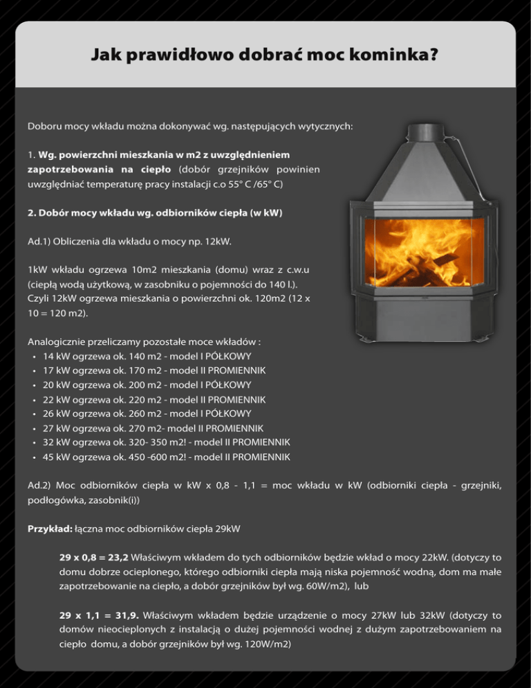 Jak prawidłowo dobrać moc kominka? Doboru mocy wkładu można dokonywać wg. następujących wytycznych: 1. Wg. powierzchni mieszkania w m2 z uwzględnieniem zapotrzebowania na ciepło (dobór grzejników powinien uwzględniać temperaturę pracy instalacji c.o 55° C /65° C) 2. Dobór mocy wkładu wg. odbiorników ciepła (w kW) Ad.1) Obliczenia dla wkładu o mocy np. 12kW. 1kW wkładu ogrzewa 10m2 mieszkania (domu) wraz z c.w.u (ciepłą wodą użytkową, w zasobniku o pojemności do 140 l.). Czyli 12kW ogrzewa mieszkania o powierzchni ok. 120m2 (12 x 10 = 120 m2). Analogicznie przeliczamy pozostałe moce wkładów : • 14 kW ogrzewa ok. 140 m2 - model I PÓŁKOWY • 17 kW ogrzewa ok. 170 m2 - model II PROMIENNIK • 20 kW ogrzewa ok. 200 m2 - model I PÓŁKOWY • 22 kW ogrzewa ok. 220 m2 - model II PROMIENNIK • 26 kW ogrzewa ok. 260 m2 - model I PÓŁKOWY • 27 kW ogrzewa ok. 270 m2- model II PROMIENNIK • 32 kW ogrzewa ok. 320- 350 m2! - model II PROMIENNIK • 45 kW ogrzewa ok. 450 -600 m2! - model II PROMIENNIK Ad.2) Moc odbiorników ciepła w kW x 0,8 - 1,1 = moc wkładu w kW (odbiorniki ciepła - grzejniki, podłogówka, zasobnik(i)) Przykład: łączna moc odbiorników ciepła 29kW 29 x 0,8 = 23,2 Właściwym wkładem do tych odbiorników będzie wkład o mocy 22kW. (dotyczy to domu dobrze ocieplonego, którego odbiorniki ciepła mają niska pojemność wodną, dom ma małe zapotrzebowanie na ciepło, a dobór grzejników był wg. 60W/m2), lub 29 x 1,1 = 31,9. Właściwym wkładem będzie urządzenie o mocy 27kW lub 32kW (dotyczy to domów nieocieplonych z instalacją o dużej pojemności wodnej z dużym zapotrzebowaniem na ciepło domu, a dobór grzejników był wg. 120W/m2) [1] Jak prawidłowo dobrać moc kominka? - cd. Wniosek przykład 2) Od mocy wkładu odejmujemy 3kW a dodajemy 4kW. Czyli: mamy odbiorniki ciepła 29kW, i mamy dobrać odpowiednią moc wkładu. a. Rozważamy wkład o mocy 27kW czyli: 27kW - 3kW = 24kW (łączna minimalna moc odbiorników ciepła) oraz 27kW + 4kW = 31kW (łączna maksymalna moc odbiorników ciepła) b. Rozważamy wkład o mocy 32kW czyli: 32kW - 3kW = 29kW (łączna minimalna moc odbiorników ciepła) oraz 32kW + 4kW = 36kW (łączna maksymalna moc odbiorników ciepła) Jeśli dom jest ocieplony i zaiinstalowano grzejniki niskopojemnościowe - stosujemy wkład o mocy 27kW. Natomiast jeżeli dom nie jest ocieplony lub np. wkład ma ogrzewać dodatkowo większy bufor ciepła o pojemności ok. 500l lub więcej - stosujemy wkład o mocy 32kW. | REMIX | kominki z płaszczem wodnym, akcesoria | Szczecin i zachodniopomorskie | www.dobrekominki.szczecin.pl [2]