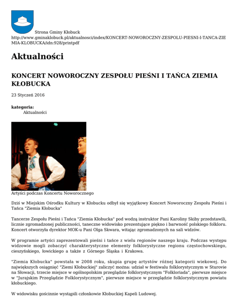 Strona Gminy Kłobuck http://www.gminaklobuck.pl/aktualnosci/index/KONCERT-NOWOROCZNY-ZESPOLU-PIESNI-I-TANCA-ZIE MIA-KLOBUCKA/idn:928/printpdf Aktualności KONCERT NOWOROCZNY ZESPOŁU PIEŚNI I TAŃCA ZIEMIA KŁOBUCKA 23 Styczeń 2016 kategoria: Aktualności Artyści podczas Koncertu Noworocznego Dziś w Miejskim Ośrodku Kultury w Kłobucku odbył się wyjątkowy Koncert Noworoczny Zespołu Pieśni i Tańca "Ziemia Kłobucka" Tancerze Zespołu Pieśni i Tańca "Ziemia Kłobucka" pod wodzą instruktor Pani Karoliny Skiby przedstawili, licznie zgromadzonej publiczności, taneczne widowisko prezentujące piękno i barwność polskiego folkloru. Koncert otworzyła dyrektor MOK-u Pani Olga Skwara, witając zgromadzonych na sali widzów. W programie artyści zaprezentowali pieśni i tańce z wielu regionów naszego kraju. Podczas występu widzowie mogli zobaczyć charakterystyczne elementy folklorystyczne regionu częstochowskiego, cieszyńskiego, łowickiego a także z Górnego Śląska i Krakowa. "Ziemia Kłobucka" powstała w 2008 roku, skupia grupę artystów różnej kategorii wiekowej. Do największych osiągnięć "Ziemi Kłobuckiej" zaliczyć można: udział w festiwalu folklorystycznym w Sturovie na Słowacji, trzecie miejsce w ogólnopolskim przeglądzie folklorystycznym "Folkloriada", pierwsze miejsce w "Jurajskim Przeglądzie Folklorystycznym", pierwsze miejsce w przeglądzie folklorystycznym powiatu kłobuckiego. W widowisku gościnnie wystąpili członkowie Kłobuckiej Kapeli Ludowej. Koncert przygotowali: Karolina Skiba (choreografia, śpiew), Andrzej Jelonek (muzyka, śpiew), Wojciech Krysiak (dźwięk, światła), Renata Włóka (dekoracje, plakaty). KONCERT NOWOROCZNY ZESPOŁU PIEŚNI I TAŃCA ZIEMIA KŁOBUCKA KONCERT NOWOROCZNY ZESPOŁU PIEŚNI I TAŃCA ZIEMIA KŁOBUCKA 20 zdjęć 23 styczeń 2016 Aktualności - strona 1 Aktualności - strona 2 powrót do listy aktualności poprzednia następna