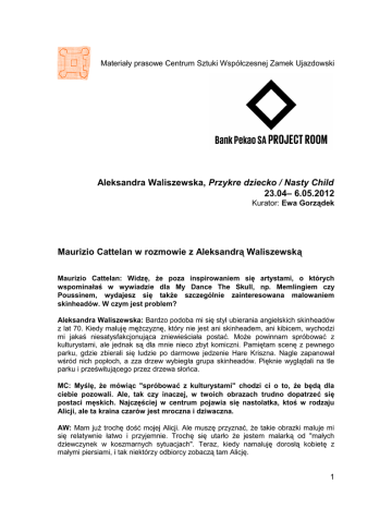 Materiały prasowe Centrum Sztuki Współczesnej Zamek Ujazdowski Aleksandra Waliszewska, Przykre dziecko / Nasty Child 23.04– 6.05.2012 Kurator: Ewa Gorządek Maurizio Cattelan w rozmowie z Aleksandrą Waliszewską Maurizio Cattelan: Widzę, że poza inspirowaniem się artystami, o których wspominałaś w wywiadzie dla My Dance The Skull, np. Memlingiem czy Poussinem, wydajesz się także szczególnie zainteresowana malowaniem skinheadów. W czym jest problem? Aleksandra Waliszewska: Bardzo podoba mi się styl ubierania angielskich skinheadów z lat 70. Kiedy maluję mężczyznę, który nie jest ani skinheadem, ani kibicem, wychodzi mi jakaś niesatysfakcjonująca zniewieściała postać. Może powinnam spróbować z kulturystami, ale jednak są dla mnie nieco zbyt komiczni. Pamiętam scenę z pewnego parku, gdzie zbierali się ludzie po darmowe jedzenie Hare Kriszna. Nagle zapanował wśród nich popłoch, a zza drzew wybiegła grupa skinheadów. Pięknie wyglądali na tle parku i prześwitującego przez drzewa słońca. MC: Myślę, że mówiąc "spróbować z kulturystami" chodzi ci o to, że będą dla ciebie pozowali. Ale, tak czy inaczej, w twoich obrazach trudno dopatrzeć się postaci męskich. Najczęściej w centrum pojawia się nastolatka, ktoś w rodzaju Alicji, ale ta kraina czarów jest mroczna i dziwaczna. AW: Mam już trochę dość mojej Alicji. Ale muszę przyznać, że takie obrazki maluje mi się relatywnie łatwo i przyjemnie. Trochę się utarło że jestem malarką od "małych dziewczynek w koszmarnych sytuacjach". Teraz, kiedy namaluję dorosłą kobietę z małymi piersiami, i tak niektórzy odbiorcy zobaczą tam Alicję. 1 MC: Czy coś jest nie tak ze stereotypami? Czy uważasz że to, co krytycy mówią o twoich pracach, i to, w jaki sposób je opisują, może być szkodliwe? Że mogłoby to wprowadzić oglądających na fałszywy trop, wytworzyć w nich nieadekwatne oczekiwania względem twojej twórczości? AW: Zapewne sam jako artysta zetknąłeś się z niejednym stereotypem. Odnoszę wrażenie, że krytycy często boją się sztuki, bo jej nie rozumieją i nie są w stanie jej odczuć. Aby odnaleźć się w tym obcym i złowrogim świecie, tworzą cały system sztucznych wartości. Są twórcy, którym taka sytuacja odpowiada i znakomicie odnajdują się, reagując na zapotrzebowania "sceny artystycznej". Idealną sytuacją byłoby dla mnie zniknięcie wszystkich krytyków z powierzchni ziemi i powrót do czasów przedsalonowych. MC: To bardzo surowe rozwiązanie. Czy w sytuacji idealnej, o której mówisz, ktokolwiek byłby zainteresowany sztuką poza samymi artystami? AW: Odpowiedź na to pytanie wydaje się o tyle łatwa, że taka sytuacja istniała już przed pojawieniem się XIX-wiecznych salonów. Przy obecnym rozwoju Internetu i sposobów powielania sztuki, dostęp do niej jest o wiele łatwiejszy. Z drugiej strony, konkurencja telewizji i innych mediów na pewno zmniejsza moc oddziaływania sztuki. Brak wsparcia ze strony krytyki sprowadziłby zapewne artystów ponownie do poziomu rzemieślników, co teoretycznie mogłoby sprzyjać samej sztuce. Wiele osób prawdopodobnie przestałoby się nią zajmować. MC: Czym zatem mieliby się zająć? Co byś im doradziła? AW: Skoro ich motywacją dla artystycznej kariery były pieniądze, może udałoby im się odnieść oczekiwany sukces na polu biznesu. Z tego, co wiem, ostatnio najbardziej opłaca się otworzyć bank. MC: Zostawmy już wątek "końca salonu". Słyszałem wiele komentarzy i plotek na temat twojej sztuki. Niektóre z nich wydają się sugerować, że kontakt z twoimi pracami może być dla niektórych osób szkodliwy. Czy adresujesz swoje obrazy do konkretnego odbiorcy? AW: Przede wszystkim, maluję dla samej siebie. Nie mam zamiaru nikogo szokować. Jeśli już, to chciałabym być może kogoś przygnębić. MC: Skąd pomysł, żeby przygnębiać ludzi? Jesteś mizantropką? AW: Lubię pojedyncze osoby. Przerażają mnie tłumy.. MC: Czy są zagraniczni lub polscy artyści, z którymi chciałabyś współpracować, mieć wspólną wystawę, etc.? AW: Ogólnie rzecz biorąc, nie uważam robienia wystaw za zbyt ekscytujące. Ale lubię publikować prace, np. w antologiach Frederic Magazine wydawanych przez grupę moich francuskich znajomych. Interesujące nazwiska pojawiają się również w publikacjach United Dead Artists, kolejnej oficyny, z którą współpracuję. Tak czy inaczej, nie ma jednego artysty-idola, do którego się odnoszę. Być może, są osoby, których wystawy z 2 chęcią bym zobaczyła, ale nie odczuwam konieczności wspólnego wystawiania. Myślę, że najwięcej przyjemności sprawiają mi indywidualne wystawy i publikacje. Niedawno, bardzo silne wrażenie wywarły na mnie ilustracje do Apokalipsy XVII-wiecznego polskiego artysty Jana Ziarnki. Zrobiłam serię obrazów inspirowanych jego skomplikowanymi dziełami. Jest to zapomniana postać, pomyślałam więc, że dobrym pomysłem byłoby przypomnienie jego twórczości poprzez zorganizowanie wystawy, prezentującej oryginały i moje interpretacje. MC: Wspominasz renesansowych malarzy, twierdzisz, że jesteś zakochana w drzeworytach o tematyce apokaliptycznej. Czy mamy zatem wyciągać z tego wniosek, że świadomie i ostatecznie odrzucasz współczesność? AW: Czczę sztukę renesansu, ale inspirują mnie również pewne elementy tego, co się dzieje teraz. Niedawno namalowałam cykl inspirowany masakrą na norweskiej wyspie Utoya. Myślę, że wynika to trochę z romantycznej chęci odnalezienia "wielkiego tematu" w teraźniejszości. W tym punkcie łączą się moje fascynacje zarówno obrazami sądu ostatecznego Memlinga, jak i japońskimi filmami grozy. MC: Po co cała ta masakra i rozlew krwi? Nie wierzysz w zwycięstwo rozumu i wrodzonego dobra? AW: Pewnie. Oczami wyobraźni widzę korowody szczęśliwych istot: ludzie z tygrysami i barankami, obejmujący się w nieskończonym tańcu radości i słod