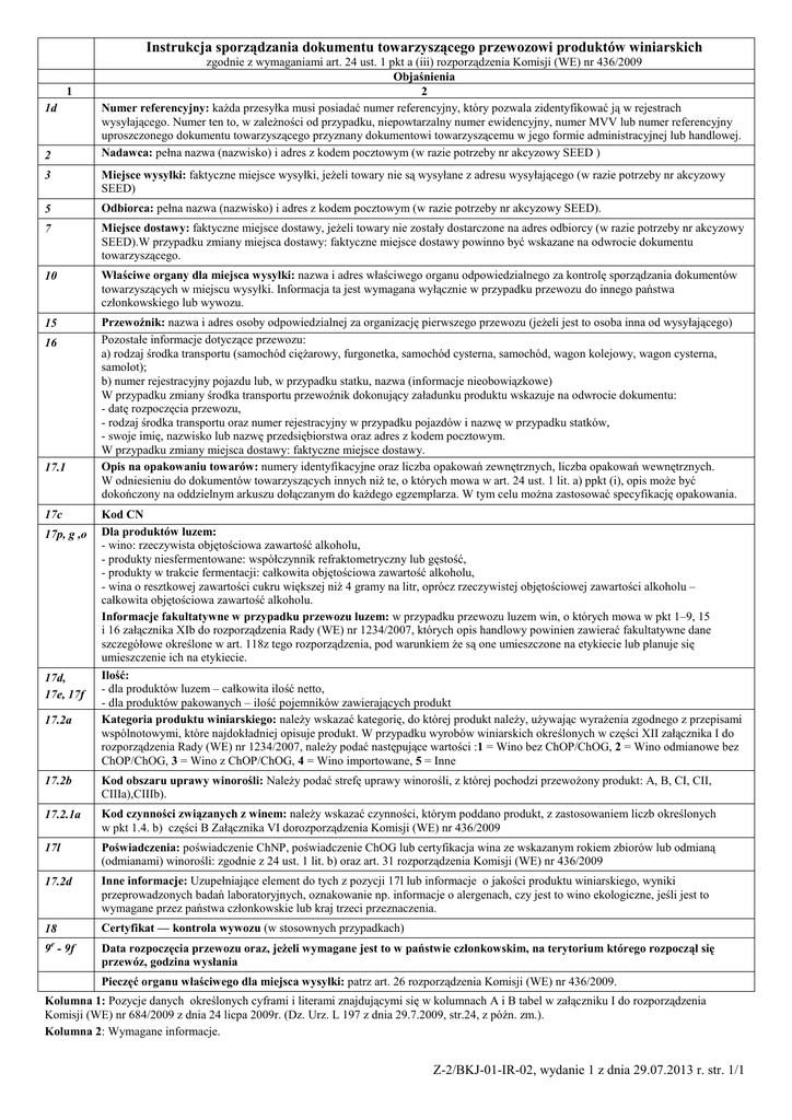 Instrukcja sporządzania dokumentu towarzyszącego przewozowi produktów winiarskich 1 1d 2 zgodnie z wymaganiami art. 24 ust. 1 pkt a (iii) rozporządzenia Komisji (WE) nr 436/2009 Objaśnienia 2 Numer referencyjny: kaŜda przesyłka musi posiadać numer referencyjny, który pozwala zidentyfikować ją w rejestrach wysyłającego. Numer ten to, w zaleŜności od przypadku, niepowtarzalny numer ewidencyjny, numer MVV lub numer referencyjny uproszczonego dokumentu towarzyszącego przyznany dokumentowi towarzyszącemu w jego formie administracyjnej lub handlowej. Nadawca: pełna nazwa (nazwisko) i adres z kodem pocztowym (w razie potrzeby nr akcyzowy SEED ) 3 Miejsce wysyłki: faktyczne miejsce wysyłki, jeŜeli towary nie są wysyłane z adresu wysyłającego (w razie potrzeby nr akcyzowy SEED) 5 Odbiorca: pełna nazwa (nazwisko) i adres z kodem pocztowym (w razie potrzeby nr akcyzowy SEED). 7 Miejsce dostawy: faktyczne miejsce dostawy, jeŜeli towary nie zostały dostarczone na adres odbiorcy (w razie potrzeby nr akcyzowy SEED).W przypadku zmiany miejsca dostawy: faktyczne miejsce dostawy powinno być wskazane na odwrocie dokumentu towarzyszącego. 10 Właściwe organy dla miejsca wysyłki: nazwa i adres właściwego organu odpowiedzialnego za kontrolę sporządzania dokumentów towarzyszących w miejscu wysyłki. Informacja ta jest wymagana wyłącznie w przypadku przewozu do innego państwa członkowskiego lub wywozu. 15 Przewoźnik: nazwa i adres osoby odpowiedzialnej za organizację pierwszego przewozu (jeŜeli jest to osoba inna od wysyłającego) Pozostałe informacje dotyczące przewozu: a) rodzaj środka transportu (samochód cięŜarowy, furgonetka, samochód cysterna, samochód, wagon kolejowy, wagon cysterna, samolot); b) numer rejestracyjny pojazdu lub, w przypadku statku, nazwa (informacje nieobowiązkowe) W przypadku zmiany środka transportu przewoźnik dokonujący załadunku produktu wskazuje na odwrocie dokumentu: - datę rozpoczęcia przewozu, - rodzaj środka transportu oraz numer rejestracyjny w przypadku pojazdów i nazwę w przypadku statków, - swoje imię, nazwisko lub nazwę przedsiębiorstwa oraz adres z kodem pocztowym. W przypadku zmiany miejsca dostawy: faktyczne miejsce dostawy. Opis na opakowaniu towarów: numery identyfikacyjne oraz liczba opakowań zewnętrznych, liczba opakowań wewnętrznych. W odniesieniu do dokumentów towarzyszących innych niŜ te, o których mowa w art. 24 ust. 1 lit. a) ppkt (i), opis moŜe być dokończony na oddzielnym arkuszu dołączanym do kaŜdego egzemplarza. W tym celu moŜna zastosować specyfikację opakowania. 16 17.1 17c 17p, g ,o 17d, 17e, 17f 17.2a Kod CN Dla produktów luzem: - wino: rzeczywista objętościowa zawartość alkoholu, - produkty niesfermentowane: współczynnik refraktometryczny lub gęstość, - produkty w trakcie fermentacji: całkowita objętościowa zawartość alkoholu, - wina o resztkowej zawartości cukru większej niŜ 4 gramy na litr, oprócz rzeczywistej objętościowej zawartości alkoholu – całkowita objętościowa zawartość alkoholu. Informacje fakultatywne w przypadku przewozu luzem: w przypadku przewozu luzem win, o których mowa w pkt 1–9, 15 i 16 załącznika XIb do rozporządzenia Rady (WE) nr 1234/2007, których opis handlowy powinien zawierać fakultatywne dane szczegółowe określone w art. 118z tego rozporządzenia, pod warunkiem Ŝe są one umieszczone na etykiecie lub planuje się umieszczenie ich na etykiecie. Ilość: - dla produktów luzem – całkowita ilość netto, - dla produktów pakowanych – ilość pojemników zawierających produkt Kategoria produktu winiarskiego: naleŜy wskazać kategorię, do której produkt naleŜy, uŜywając wyraŜenia zgodnego z przepisami wspólnotowymi, które najdokładniej opisuje produkt. W przypadku wyrobów winiarskich określonych w części XII załącznika I do rozporządzenia Rady (WE) nr 1234/2007, naleŜy podać następujące wartości :1 = Wino bez ChOP/ChOG, 2 = Wino odmianowe bez ChOP/ChOG, 3 = Wino z ChOP/ChOG, 4 = Wino importowane, 5 = Inne 17.2b Kod obszaru uprawy winorośli: NaleŜy podać strefę uprawy winorośli, z której pochodzi przewoŜony produkt: A, B, CI, CII, CIIIa),CIIIb). 17.2.1a Kod czynności związanych z winem: naleŜy wskazać czynności, którym poddano produkt, z zastosowaniem liczb określonych w pkt 1.4. b) części B Załącznika VI dorozporządzenia Komisji (WE) nr 436/2009 17l Poświadczenia: poświadczenie ChNP, poświadczenie ChOG lub certyfikacja wina ze wskazanym rokiem zbiorów lub odmianą (odmianami) winorośli: zgodnie z 24 ust. 1 lit. b) oraz art. 31 rozporządzenia Komisji (WE) nr 436/2009 17.2d Inne informacje: Uzupełniające element do tych z pozycji 17l lub informacje o jakości produktu winiarskiego, wyniki przeprowadzonych badań laboratoryjnych, oznakowanie np. informacje o alergenach, czy jest to wino ekologiczne, jeśli jest to wymagane przez państwa członkowskie lub kraj trzeci przeznaczenia. 18 Certyfikat — kontrola wywozu (w stosownych przypadkach) e 9 - 9f Data rozpoczęcia przewozu oraz, jeŜeli wymagane jest to w państwie członkowskim, na terytorium którego rozpoczął się przewóz, godzina wysłania Pieczęć organu właściwego dla miejsca wysyłki: patrz art. 26 rozporządzenia Komisji (WE) nr 436/2009. Kolumna 1: Pozycje danych określonych cyframi i literami znajdującymi się w kolumnach A i B tabel w załączniku I do rozporządzenia Komisji (WE) nr 684/2009 z dnia 24 licpa 2009r. (Dz. Urz. L 197 z dnia 29.7.2009, str.24, z późn. zm.). Kolumna 2: Wymagane informacje. Z-2/BKJ-01-IR-02, wydanie 1 z dnia 29.07.2013 r. str. 1/1