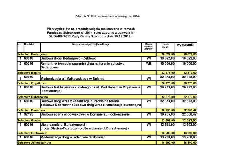 Załącznik Nr 18 do sprawozdania opisowego za 2014 r. Plan wydatków na przedsięwzięcia realizowane w ramach Funduszu Sołeckiego w 2014 roku zgodnie z uchwałą Nr XLIX/489/2013 Rady Gminy Szemud z dnia 19.12.2013 r Lp. Rozdział Nazwa inwestycji i jej lokalizacja Rodzaj wydatku (WI/WB1) Sołectwo Będargowo Kwota (w zł) wykonanie 20 622,00 20 622,00 1 60016 Budowa drogi Będargowo - Zęblewo WI 10 622,00 10 622,00 2 60016 Remont (w tym odkrzaczenie) dróg na terenie sołectwa Będargowo WB 10 000,00 10 000,00 32 373,00 32 373,00 32 373,00 32 373,00 26 773,00 26 773,00 26 773,00 26 773,00 32 373,00 32 373,00 32 373,00 32 373,00 30 755,00 22 000,42 30 755,00 22 000,42 12 593,00 12 593,00 12 593,00 12 593,00 13 208,00 13 208,00 13 208,00 13 208,00 16 899,00 16 899,00 Sołectwo Bojano 1 60016 Modernizacja ul. Majkowskiego w Bojanie WI Sołectwo Częstkowo 1 60016 Budowa traktu pieszo - jezdnego na ul. Pod Dębem w Częstkowie (kontynuacja) WI Sołectwo Dobrzewino 1 60016 Budowa dróg wraz z kanalizacją burzową na terenie sołectwa DobrzewinoBudowa dróg wraz z kanalizacją burzową na terenie Sołectwo Donimierz sołectwa DobrzewinoBudowa dróg wraz z kanalizacją burzową na 1 92195 Budowa sceny widowiskowej w Donimierzu - dokończenie terenie Sołectwo Głazicasołectwa DobrzewinoBudowa dróg wraz z kanalizacją burzową na terenie 1 60016 Utwardzenie ul.Bursztynowej sołectwa Dobrzewino droga Głazica-Przetoczyno Utwardzenie ul.Bursztynowej droga Głazica-Przetoczyno Utwardzenie ul.Bursztynowej Sołectwo Grabowiec droga Głazica-Przetoczyno Utwardzenie ul.Bursztynowej 1 60016 Modernizacja dróg w sołectwie Grabowiec droga Głazica-Przetoczyno Sołectwo Jeleńska Huta WI WI WI WI 1 60016 Modernizacja ul. Otalżyńskiej w Jeleńskiej Hucie WI Sołectwo Kamień 1 60016 2 90015 16 899,00 16 899,00 27 485,00 24 479,35 Naprawa dróg w sołectwie Kamień WB 22 985,00 19 979,35 Oświetlenie ulic Diamentowej i Kryształowej w Kamieniu (projekt) WI 4 500,00 4 500,00 32 373,00 28 373,00 Sołectwo Kielno 1 60016 Ustawienie wiaty przystankowej na Bożance w sołectwie Kielno WI 4 000,00 2 60016 Budowa chodnika przy ul.Jeziornej w Kielnie WI 14 373,00 14 373,00 3 90015 Oświetlenie ul. Słonecznej i Jarzębinowej oraz projekt oświetlenia ul.Oliwskiej w sąsziedztwie przystanków Kielno ul.Różana i Kielno Cmenatzr WI 14 000,00 14 000,00 15 377,00 11 012,50 15 377,00 11 012,50 32 373,00 32 373,00 Sołectwo Kieleńska Huta 1 60016 Modernizacja dróg w sołectwie Kieleńska Huta WI Sołectwo Koleczkowo 1 60016 60016 2 92601 60016 Utwardzenie dróg w sołectwie Koleczkowo WB 28 373,00 28 373,00 Wykonanie drenażu szatni na boisku w Koleczkowie WB 4 000,00 4 000,00 11 492,00 11 492,00 11 492,00 11 492,00 14 795,00 14 795,00 Sołectwo Kowalewo 1 60016 Budowa drogi Kowalewo - Kamień WI Sołectwo Leśno 1 60016 Naprawa dróg w sołectwie Leśno WB 9 795,00 9 795,00 2 92195 Organizacja obchodów 50-lecia KGW Leśno WB 5 000,00 5 000,00 32 373,00 32 373,00 32 373,00 32 373,00 21 107,00 21 107,00 Sołectwo Łebno 1 60016 Odwodnienie ulic na osiedlu w Łebnie Sołectwo Łebieńska Huta WI 1 60016 Budowa drogi na ul. Jeziornej w Łebieńskiej Hucie w kierunku Otalżyna WI 21 107,00 21 107,00 24 053,00 21 287,16 21 053,00 3 000,00 18 287,16 3 000,00 17 158,00 10 824,00 17 158,00 10 824,00 32 373,00 31 363,00 WI 10 000,00 10 000,00 WI 10 373,00 10 373,00 WI 12 000,00 10 990,00 13 500,00 13 500,00 13 500,00 13 500,00 17 967,00 17 967,00 17 967,00 17 967,00 16 834,00 16 834,00 WI 16 834,00 16 834,00 WI WB 393 650,00 101 206,00 369 186,92 95 434,51 494 856,00 464 621,43 Sołectwo Przetoczyno 1 60016 2 60016 Naprawa ul. Wielkopolskiej i ul. Laski w Przetoczynie Utwardzenie ul.Bursztynowej - droga Głazica-Przetoczyno WB WI Sołectwo Rębiska 1 60016 Przebudowa ul. Spacerowej w Rębiskach WI Sołectwo Szemud 1 60016 Modernizacja ul. Labudy w Szemudzie 2 60016 Modernizacja ul. Chodzińskiego w Szemudzie Modernizacja ul. Chodzińskiego w Szemudzie 3 90015 Budowa oświetlenia ul. Sparcerowej w SzemudzieBudowa oświetlenia ul. Sparcerowej w Szemudzie Sołectwo Szemudzka Huta 1 60016 Modernizacja dróg w sołectwie Szemudzka Huta WI Sołectwo Warzno 1 60016 Modernizacja drogi Warzno - Czeczewo WI Sołectwo Zęblewo 1 60016 Regulacja stanu prawnego i utwardzenie drogi w Zęblewie w kierunku Łebno (kontynuacja) OGÓŁEM OGÓŁEM OGÓŁEM WYDATKI W RAMACH FUNDUSZU SOŁECKIEGO Szczegółowy opis podjętych działań ujęto w wykazie zadań inwestycyjnych
