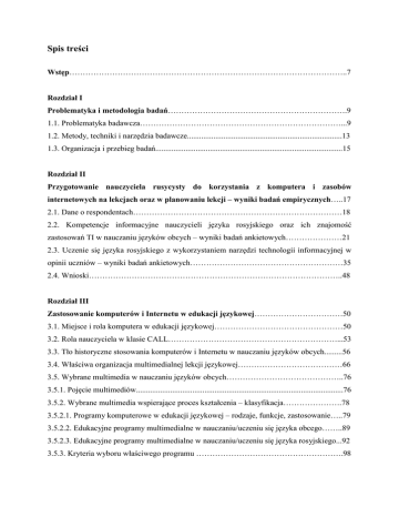 Spis treści Wstęp…………………………………………………………………………………………..7 Rozdział I Problematyka i metodologia badań………………………………………………………….9 1.1. Problematyka badawcza…………………………………………………………………...9 1.2. Metody, techniki i narzędzia badawcze.............................................................................13 1.3. Organizacja i przebieg badań.............................................................................................15 Rozdział II Przygotowanie nauczyciela rusycysty do korzystania z komputera i zasobów internetowych na lekcjach oraz w planowaniu lekcji – wyniki badań empirycznych…..17 2.1. Dane o respondentach……………………………………………………………………18 2.2. Kompetencje informacyjne nauczycieli języka rosyjskiego oraz ich znajomość zastosowań TI w nauczaniu języków obcych – wyniki badań ankietowych…………………21 2.3. Uczenie się języka rosyjskiego z wykorzystaniem narzędzi technologii informacyjnej w opinii uczniów – wyniki badań ankietowych…………………………………………………35 2.4. Wnioski…………………………………………………………………………………..48 Rozdział III Zastosowanie komputerów i Internetu w edukacji językowej……………………………50 3.1. Miejsce i rola komputera w edukacji językowej…………………………………………50 3.2. Rola nauczyciela w klasie CALL………………………………………………………...53 3.3. Tło historyczne stosowania komputerów i Internetu w nauczaniu języków obcych.........56 3.4. Właściwa organizacja multimedialnej lekcji językowej…………………………………66 3.5. Wybrane multimedia w nauczaniu języków obcych……………………………………..76 3.5.1. Pojęcie multimediów.......................................................................................................76 3.5.2. Wybrane multimedia wspierające proces kształcenia – klasyfikacja………………….78 3.5.2.1. Programy komputerowe w edukacji językowej – rodzaje, funkcje, zastosowanie…..79 3.5.2.2. Edukacyjne programy multimedialne w nauczaniu/uczeniu się języka obcego……..89 3.5.2.3. Edukacyjne programy multimedialne w nauczaniu/uczeniu się języka rosyjskiego...92 3.5.3. Kryteria wyboru właściwego programu ……………………………………………….98 3.5.4. Za i przeciw wykorzystania multimedialnych programów edukacyjnych w procesie kształcenia…………………………………………………………………………………...101 3.6. Możliwości wykorzystania Internetu w nauczaniu/uczeniu się języka rosyjskiego jako obcego……………………………………………………………………………………….104 3.6.1. Charakterystyka Internetu i jego rola w kształtowanie kompetencji językowej i komunikacyjnej uczących się ……………………………………………………………….104 3.6.2. Strony internetowe przydatne nauczycielowi języka rosyjskiego jako obcego............107 3.6.3. Możliwości wykorzystania wybranych usług internetowych w kształtowaniu kompetencji komunikacyjnej uczących się …………………………………………………113 3.6.4. Komputer i Internet w samodzielnej pracy ucznia nad językiem…………………….118 Rozdział IV Kształcenie nauczycieli języków obcych w zakresie technologii informacyjnej i edukacji medialnej................................................................................................................................120 4.1. Standardy informatycznego przygotowania nauczycieli ze szczególnym uwzględnieniem nauczycieli języków obcych...................................................................................................120 4.2. Kursy, szkolenia i warsztaty dla nauczycieli i pedagogów z zakresu technologii informacyjnej i edukacji medialnej na przykładzie województwa podkarpackiego (20092010).......................................................................................................................................127 4.3. Inne formy doskonalenia umiejętności nauczycieli z zakresu TI i EM (z uwzględnieniem dokształcania zdalnego)……………………………………………………………………..130 Rozdział V Praktyczne możliwości zastosowania komputerów i usług internetowych w nauczaniu języka rosyjskiego………………………………………………………………………….132 5.1. Multimedialne nauczanie elementów języka – charakterystyka, przykładowe narzędzia…………………………………………………………………………………….133 5.1.1. Nauczanie wymowy, rytmu i intonacji……………………………………………….133 5.1.2. Nauczanie pisowni……………………………………………………………………134 5.1.3. Nauczanie słownictwa………………………………………………………………...136 5.1.4. Nauczanie gramatyki………………………………………………………………….137 5.2. Nauczanie umiejętności i sprawności językowych z wykorzystaniem narzędzi technologii informacyjnej………………………………………………………………………………..138 5.3. Projekt multimedialny jako uniwersalna metoda kształtowania wszystkich sprawności językowych z wykorzystaniem komputera i Internetu………………………………………145 5.4. Przykładowe konspekty lekcji języka rosyjskiego z zastosowaniem komputera i usług Internetu..................................................................................................................................151 5.5. Wniosk