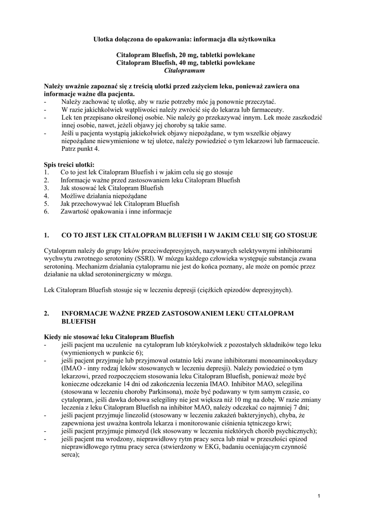 Ulotka dołączona do opakowania: informacja dla użytkownika Citalopram Bluefish, 20 mg, tabletki powlekane Citalopram Bluefish, 40 mg, tabletki powlekane Citalopramum Należy uważnie zapoznać się z treścią ulotki przed zażyciem leku, ponieważ zawiera ona informacje ważne dla pacjenta. Należy zachować tę ulotkę, aby w razie potrzeby móc ją ponownie przeczytać. W razie jakichkolwiek wątpliwości należy zwrócić się do lekarza lub farmaceuty. Lek ten przepisano określonej osobie. Nie należy go przekazywać innym. Lek może zaszkodzić innej osobie, nawet, jeżeli objawy jej choroby są takie same. Jeśli u pacjenta wystąpią jakiekolwiek objawy niepożądane, w tym wszelkie objawy niepożądane niewymienione w tej ulotce, należy powiedzieć o tym lekarzowi lub farmaceucie. Patrz punkt 4. Spis treści ulotki: 1. Co to jest lek Citalopram Bluefish i w jakim celu się go stosuje 2. Informacje ważne przed zastosowaniem leku Citalopram Bluefish 3. Jak stosować lek Citalopram Bluefish 4. Możliwe działania niepożądane 5. Jak przechowywać lek Citalopram Bluefish 6. Zawartość opakowania i inne informacje 1. CO TO JEST LEK CITALOPRAM BLUEFISH I W JAKIM CELU SIĘ GO STOSUJE Cytalopram należy do grupy leków przeciwdepresyjnych, nazywanych selektywnymi inhibitorami wychwytu zwrotnego serotoniny (SSRI). W mózgu każdego człowieka występuje substancja zwana serotoniną. Mechanizm działania cytalopramu nie jest do końca poznany, ale może on pomóc przez działanie na układ serotoninergiczny w mózgu. Lek Citalopram Bluefish stosuje się w leczeniu depresji (ciężkich epizodów depresyjnych). 2. INFORMACJE WAŻNE PRZED ZASTOSOWANIEM LEKU CITALOPRAM BLUEFISH Kiedy nie stosować leku Citalopram Bluefish jeśli pacjent ma uczulenie na cytalopram lub którykolwiek z pozostałych składników tego leku (wymienionych w punkcie 6); jeśli pacjent przyjmuje lub przyjmował ostatnio leki zwane inhibitorami monoaminooksydazy (IMAO - inny rodzaj leków stosowanych w leczeniu depresji). Należy powiedzieć o tym lekarzowi, przed rozpoczęciem stosowania leku Citalopram Bluefish, ponieważ może być konieczne odczekanie 14 dni od zakończenia leczenia IMAO. Inhibitor MAO, selegilina (stosowana w leczeniu choroby Parkinsona), może być podawany w tym samym czasie, co cytalopram, jeśli dawka dobowa selegiliny nie jest większa niż 10 mg na dobę. W razie zmiany leczenia z leku Citalopram Bluefish na inhibitor MAO, należy odczekać co najmniej 7 dni; jeśli pacjent przyjmuje linezolid (stosowany w leczeniu zakażeń bakteryjnych), chyba, że zapewniona jest uważna kontrola lekarza i monitorowanie ciśnienia tętniczego krwi; jeśli pacjent przyjmuje pimozyd (lek stosowany w leczeniu niektórych chorób psychicznych); jeśli pacjent ma wrodzony, nieprawidłowy rytm pracy serca lub miał w przeszłości epizod nieprawidłowego rytmu pracy serca (stwierdzony w EKG, badaniu oceniającym czynność serca); 1 - jeśli pacjent przyjmuje leki stosowane w leczeniu zaburzeń rytmu pracy serca lub mogące wpływać na czynność serca. Patrz także „Citalopram Bluefish a inne leki” poniżej; jeśli którakolwiek z powyższych sytuacji dotyczy pacjenta, należy powiedzieć o tym lekarzowi przed rozpoczęciem leczenia lekiem Citalopram Bluefish. Ostrzeżenia i środki ostrożności Przed rozpoczęciem stosowania leku Citalopram Bluefish należy omówić to z lekarzem lub farmaceutą. Myśli samobójcze i pogłębienie depresji Osoby, u których występuje depresja i (lub) zaburzenia lękowe, mogą czasami mieć myśli o samookaleczeniu lub o popełnieniu samobójstwa. Takie objawy czy zachowanie mogą nasilać się na początku stosowania leków przeciwdepresyjnych, ponieważ leki te zaczynają działać zazwyczaj po upływie 2 tygodni, czasami później. Wystąpienie myśli samobójczych, myśli o samookaleczeniu lub popełnieniu samobójstwa jest bardziej prawdopodobne, jeżeli: u pacjenta w przeszłości występowały myśli samobójcze lub chęć samookaleczenia; pacjent jest młodym dorosłym. Dane z badań klinicznych wskazują na zwiększone ryzyko wystąpienia zachowań samobójczych u osób w wieku poniżej 25 lat z zaburzeniami psychicznymi, którzy byli leczeni lekami przeciwdepresyjnymi. Jeśli u pacjenta występują myśli samobójcze lub myśli o samookaleczeniu, należy niezwłocznie skontaktować się z lekarzem lub zgłosić się do szpitala. Pomocne może okazać się poinformowanie krewnych lub przyjaciół o depresji lub zaburzeniach lękowych oraz poproszenie ich o przeczytanie tej ulotki. Pacjent może zwrócić się do krewnych lub przyjaciół z prośbą o informowanie go, jeśli zauważą, że depresja lub lęk nasiliły się lub wystąpiły niepokojące zmiany w zachowaniu. Należy zachować szczególną ostrożność, jeśli u pacjenta wystąpią takie objawy, jak wewnętrzne poczucie niepokoju i niemożność spokojnego stania w miejscu lub siedzenia, zazwyczaj połączone z wyczerpaniem (akatyzja). Jest najbardziej prawdopodobne, że te objawy wystąpią w kilku pierwszych tygodniach leczenia. Zwiększenie dawki leku Citalopram Bluefish może pogorszyć te objawy (patrz punkt 4 „Możliwe działania niepożądane”). Należy powiedzieć lekarzowi, jeśli którakolwiek z podanych poniżej sytuacji dotyczy pacjenta, ponieważ może mieć to wpływ na leczenie. Należy powiedzieć lekarzowi jeśli: pacjent zażywa w tym samym czasie inne leki (patrz punkt ” Citalopram Bluefish a inne leki); pacjent ma cukrzycę, ponieważ może być konieczne dostosowanie dawki insuliny lub innych leków zmniejszających stężenie cukru we krwi; pacjent choruje na padaczkę, lub gdy u pacjenta wystąpiły drgawki w przeszłości bądź wystąpiły po raz pierwszy w trakcie leczenia lekiem Citalopram Bluefish. Jeśli wystąpią drgawki lub napad padaczki lekarz może zadecydować o przerwaniu stosowania leku Citalopram Bluefish; pacjent jest leczony elektrowstrząsami; 