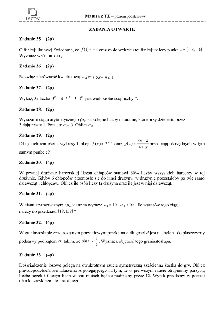 Matura z TZ – poziom podstawowy ZADANIA OTWARTE Zadanie 25. (2p) O funkcji liniowej f wiadomo, że f (1) = − 4 oraz że do wykresu tej funkcji należy punkt A = ( − 3, − 6) . Wyznacz wzór funkcji f. Zadanie 26. (2p) Rozwiąż nierówność kwadratową − 2 x 2 + 5 x + 4 ≥ 1 . Zadanie 27. (2p) Wykaż, że liczba 513 + 4 ⋅ 512 − 3 ⋅ 511 jest wielokrotnością liczby 7. Zadanie 28. (2p) Wyrazami ciągu arytmetycznego (an) są kolejne liczby naturalne, które przy dzieleniu przez 3 dają resztę 1. Ponadto a =13. Oblicz a30 . 5 Zadanie 29. (2p) Dla jakich wartości k wykresy funkcji f ( x ) = 2 x + 2 oraz g ( x ) = samym punkcie? 3x − k przecinają oś rzędnych w tym 4+ x Zadanie 30. (4p) W pewnej drużynie harcerskiej liczba chłopców stanowi 60% liczby wszystkich harcerzy w tej drużynie. Gdyby 6 chłopców przeniosło się do innej drużyny, w drużynie pozostałoby po tyle samo dziewcząt i chłopców. Oblicz ile osób liczy ta drużyna oraz ile jest w niej dziewcząt. Zadanie 31. (4p) W ciągu arytmetycznym ( an ) dane są wyrazy: a4 = 15 , a14 = 55 . Ile wyrazów tego ciągu należy do przedziału (19, 159 ) ? Zadanie 32. (4p) W graniastosłupie czworokątnym prawidłowym przekątna o długości d jest nachylona do płaszczyzny 1 podstawy pod kątem α takim, że sin α = . Wyznacz objętość tego graniastosłupa. 5 Zadanie 33. (4p) Doświadczenie losowe polega na dwukrotnym rzucie symetryczną sześcienna kostką do gry. Oblicz prawdopodobieństwo zdarzenia A polegającego na tym, że w pierwszym rzucie otrzymamy parzystą liczbę oczek i iloczyn liczb w obu rzutach będzie podzielny przez 12. Wynik przedstaw w postaci ułamka zwykłego nieskracalnego.