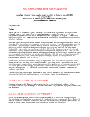 CZY DZIESIĘCINA JEST OBOWIĄZKOWA? Analiza niektórych popularnych błędów w interpretacji Biblii na przykładzie nauczania o obowiązku oddawania dziesięciny przez członków Kościoła Krzysztof Dubis Wstęp Wybaczcie ten przydługawy i nieco „naukowo” brzmiący tytuł — chciałem w miarę spójnie pokazać, o czym będę pisał. Chcę powiązać ze sobą dwa wątki. Pierwszym z nich jest przypomnienie podstawowych zasad interpretacji Biblii [egezgezy], a drugim — omówienie bardzo popularnej, lecz niekoniecznie biblijnej nauki o obowiązku oddawania dziesięciny przez członków Kościoła. Ponieważ nasza witryna ma służyć ludowi Bożemu pomocą w rozróżnianiu prawdy od fałszu w coraz bardziej skomplikowanym gąszczu nowych idei, proroctw i nauk [„baczcie, żeby was kto nie zwiódł” — jak ostrzegał sam Pan mówiąc o dniach ostatecznych], najlepiej będzie dać wszystkim do ręki narzędzia pozwalające odróżnić dobro od zła. Sam Pan dał nam swego Ducha, który wprowadza we wszelką prawdę [Jan 16:13]. Od Niego samego płynie również umiłowanie prawdy mogące ochronić nas przed teologicznym obłędem [II Tes. 2:10-12]. On sam wreszcie wyposaża nas we władze poznawcze niezbędne do rozróżniania dobrego od złego (my mamy jedynie dbać, żeby nie „zardzewiały”) [Hebr. 5:11-14] oraz w Słowo Boże, dzięki któremu możemy się uczyć, wykrywać i poprawiać błędy, abyśmy byli przygotowani do czynienia woli Bożej [II Tym. 3:16-17]. Spróbujemy „przećwiczyć” niektóre błędy egzegetyczne, nota bene bardzo popularne wśród współczesnych chrześcijan, na przykładzie jednej z tych nauk, które często słyszymy, lecz niewielu osobom przychodzi do głowy, by zastanowić się głębiej nad ich prawdziwością. A jest nad czym, gdyż akurat wymóg [„przykazanie”] oddawania dziesięciny okrada chrześcijan z wolności w Chrystusie i z... pieniędzy, które mogliby spożytkować zgodnie z objawioną im osobiście wolą Bożą. Zasady interpretacji Biblii będą podawane w dość luźnym porządku, bez jakiejkolwiek gradacji ważności. Ich kolejność będzie związana z rozwijaniem wątku samej dziesięciny. ZASADA 1: NALEŻY CZYTAĆ TO, CO JEST NAPISANE Bardzo proste, prawda? Czasem jednak okazuje się, że zamiast czytać właściwy tekst, usiłujemy doczytać się w nim tego, co chcemy udowodnić [czyli zamiast egzegezy dokonujemy tzw. eisegezy]. ZASADA 2: „TEKST BEZ KONTEKSTU JEST PRETEKSTEM” Każdy rozpatrywany tekst należy czytać w jego kontekście, przechodząc od najbliższego [kontekst zdania, akapitu] do coraz szerszych [rozdział, księga, wreszcie całe Słowo Boże]. W ramach kontekstu należy się zastanowić, do kogo jest pisany dany fragment i postawić się na chwilę w sytuacji jego bezpośrednich adresatów [np. Izraela lub Koryntian]. ZASADA 3: NAJPIERW ZNACZENIE DOSŁOWNE, DOPIERO POTEM ALEGORIA Należy pamiętać, że Biblia została napisana przez ludzi natchnionych Duchem Świętym do ludzi czytających ją w Duchu Świętym. Nie znaczy to jednak, że mamy ją czytać w sposób mistyczny, numerologiczny, czy jakiś inny — należy ją czytać NORMALNIE. Tak, jakby była listem skierowanym do każdego z nas: rozumiejąc tekst dosłownie, a dopiero wtedy, gdy nie ma on dosłownego sensu, przechodzić na poziom alegorii [przenośni]. ZASADA 4: CZYTAJMY TEKSTY PARALELNE Jeśli stoi przed nami problem tematyczny, dobrze jest poszukać w Biblii innych fragmentów mówiących o tym samym [paralelnych, czyli równoległych]. Wtedy możemy uzyskać pełniejszy obraz całości. Pamiętajmy, że nauczanie całej Biblii przypomina nieco układankę [puzzle]: każdy fragment jest na swoim miejscu [wchodzi tam bez wciskania na siłę!] i dopiero wszystkie razem tworzą cudowną jedność, harmonię, wzajemnie się uzupełniając. ZASADA 5: WEŹMY POD UWAGĘ RODZAJ LITERATURY Warto wziąć pod uwagę, z jakim rodzajem literatury mamy do czynienia. Poezję [np. Psalmy] czyta się nieco inaczej niż narrację [ewangelie], księgi dydaktyczne [np. Przypowieści Salomona] czy listy lub księgi prorockie. Np. nie powinniśmy wywodzić całych doktryn jedynie na podstawie jednego z pozdrowień zawartych w listach apostolskich [a tak się zdarza!]. Skoro ustaliliśmy kilka podstawowych reguł hermeneutyki [interpretacji Biblii], przejdźmy do nauki o dziesięcinie. Definicja dziesięciny Biblijna definicja dziesięciny: Rodzaj podatku lub poświęcenia (oddzielenia) dla Pana jednej dziesiątej płodów ziemi (plonów polnych, owoców drzew) oraz bydła i trzody [III Mojż. 27:3032 W Prawie Mojżeszowym dziesięcina była obowiązkowa (przykazanie), a nie dobrowolna [III Mojż. 27:34] Cel dziesięciny Wspomaganie Lewitów, obcych przybyszów, sieroty i wdowy. Oddawanie dziesięciny było warunkiem błogosławieństwa dla narodu i ziemi izraelskiej [V Mojż. 26:12-15] Rodzaje dziesięciny Zwolennicy nakazu oddawania dziesięciny przez członków Kościoła powinni zdawać sobie sprawę, że istniały trzy rodzaje dziesięciny (wszystkie obowiązkowe): 1 rodzaj — Była oddawana raz w roku dla wspomożenia Lewitów [kapłanów] [IV Mojż. 18:2124] Plemię Lewitów nie otrzymało ziemi w dziedzictwie [IV Mojż. 18:20, V Mojż. 12:12, V Mojż. 14:27]. Zostało oddzielone od reszty plemion izraelskich [IV Mojż. 3:39-45, IV Mojż. 3:5-10, IV Mojż. 8:14-19], żeby służyć Bogu w Przybytku, a później w Świątyni. Dlatego pierwsza dziesięcina była przeznaczona dla nich, gdyż nie mieli innych źródeł utrzymania. 2 rodzaj — Była przynoszona do Jerozolimy w czasie świąt [V Mojż. 14:22-27] 3 rodzaj — Była oddawana co trzy lata i przeznaczano ją dla biednych [V Mojż. 14:28-29] Każdy trzeci rok był ogłaszany „rokiem dziesięcin” [V Mojż. 26:12]. Gdy Izraelici złożyli wszystkie swoje dziesięciny, mieli dać trzecią z nich Lewitom, przybyszom i sierotom. Wtedy dopiero mogli powiedzieć przed Bogiem, że w