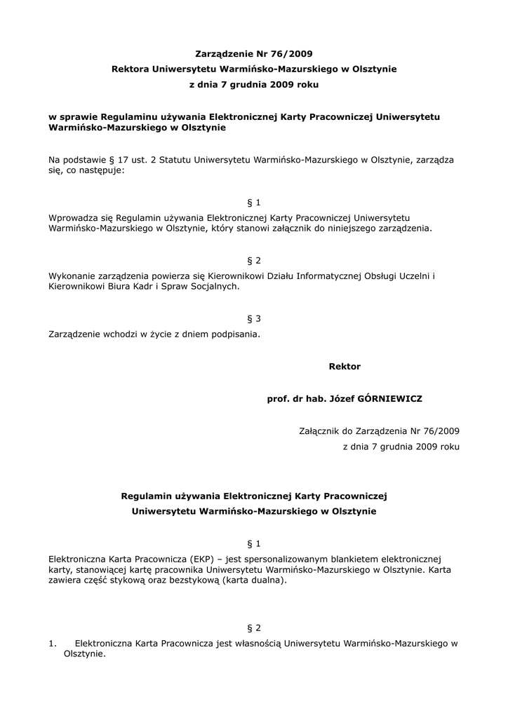 Zarządzenie Nr 76/2009 Rektora Uniwersytetu Warmińsko-Mazurskiego w Olsztynie z dnia 7 grudnia 2009 roku w sprawie Regulaminu używania Elektronicznej Karty Pracowniczej Uniwersytetu Warmińsko-Mazurskiego w Olsztynie Na podstawie § 17 ust. 2 Statutu Uniwersytetu Warmińsko-Mazurskiego w Olsztynie, zarządza się, co następuje: §1 Wprowadza się Regulamin używania Elektronicznej Karty Pracowniczej Uniwersytetu Warmińsko-Mazurskiego w Olsztynie, który stanowi załącznik do niniejszego zarządzenia. §2 Wykonanie zarządzenia powierza się Kierownikowi Działu Informatycznej Obsługi Uczelni i Kierownikowi Biura Kadr i Spraw Socjalnych. §3 Zarządzenie wchodzi w życie z dniem podpisania. Rektor prof. dr hab. Józef GÓRNIEWICZ Załącznik do Zarządzenia Nr 76/2009 z dnia 7 grudnia 2009 roku Regulamin używania Elektronicznej Karty Pracowniczej Uniwersytetu Warmińsko-Mazurskiego w Olsztynie §1 Elektroniczna Karta Pracownicza (EKP) – jest spersonalizowanym blankietem elektronicznej karty, stanowiącej kartę pracownika Uniwersytetu Warmińsko-Mazurskiego w Olsztynie. Karta zawiera część stykową oraz bezstykową (karta dualna). §2 1. Elektroniczna Karta Pracownicza jest własnością Uniwersytetu Warmińsko-Mazurskiego w Olsztynie. 2. Każdy pracownik UWM, po akceptacji niniejszego regulaminu, otrzymuje Elektroniczną Kartę Pracowniczą i staje się jej posiadaczem. 3. Kartą może posługiwać się wyłącznie jej posiadacz, który ponosi odpowiedzialność za wszystkie czynności dokonane za jej pomocą. Za udostępnienie karty osobie trzeciej, posiadacz może zostać pociągnięty do odpowiedzialności służbowej. 4. W przypadku znalezienia Elektronicznej Karty Pracowniczej UWM innego pracownika, należy ją przekazać do Biura Kadr i Spraw Socjalnych, który informuje o tym fakcie Dział Informatycznej Obsługi Uczelni. §3 Zastosowania Elektronicznej Karty Pracowniczej: 1. identyfikacja pracownika UWM, 2. kontrola dostępu do obiektów i pomieszczeń (część bezstykowa karty), 3. obsługa nowych urządzeń wielofunkcyjnych: ksera, drukarki – rozliczanie kosztów druku (część bezstykowa karty), 4. kontrola czasu pracy (część bezstykowa karty), 5. karta biblioteczna (kod kreskowy). §4 Posiadacz karty jest zobowiązany do: 1. używania karty zgodnie z jej przeznaczeniem, 2. przechowywania karty z zachowaniem należytej staranności, zachowania niezbędnych środków ostrożności zapobiegających zagubieniu, kradzieży lub zniszczeniu karty (np. wskutek jej zarysowania, zgięcia, złamania), a także wystawienia na działania wysokich temperatur i silnego pola magnetycznego (emitowanego przez m.in. telewizory, komputery i telefony komórkowe), 3. nieudostępniania karty osobom trzecim, 4. niezwłocznego poinformowania Działu Informatycznej Obsługi Uczelni w przypadku zagubienia karty, w celu jej zablokowania, 5. przekazania uszkodzonej karty do Biura Kadr i Spraw Socjalnych bądź bezpośrednio do Działu Informatycznej Obsługi Uczelni, w celu jej wymiany na sprawną, 6. zgłaszania wszelkich problemów związanych z używaniem karty do Działu Informatycznej Obsługi Uczelni, po wcześniejszym sprawdzeniu informacji na stronach internetowych administracji UWM. §5 Zasady wydawania karty: 1. karty personalizuje (drukuje) Dział Informatycznej Obsługi Uczelni, po czy przekazuje je do Biura Kadr i Spraw Socjalnych, w partiach wg jednostek organizacyjnych, jedną kopią regulaminu oraz listą pracowników danej jednostki do akceptacji regulaminu i pokwitowań odbiorów karty, 2. kierownicy po otrzymaniu informacji z Biura Kadr i Spraw Socjalnych zobowiązani są do odbioru za pokwitowaniem kart pracowników swoich jednostek, wraz z listą osób do akceptacji regulaminu i pokwitowań odbiorów karty, 3. kierownicy jednostek przekazują swoim pracownikom karty po uzyskaniu od nich podpisu akceptacji regulaminu oraz pokwitowania odbioru karty na liście, 4. lista z podpisami przekazywana jest z powrotem do Biura Kadr i Spraw Socjalnych, 5. Biuro Kadr i Spraw Socjalnych informuje Dział Informatycznej Obsługi Uczelni o nowo zatrudnionych osobach, dla których mają zostać wydrukowane karty. Po wydruku Dział Informatycznej Obsługi Uczelni przekazuje je do Biura Kadr i Spraw Socjalnych w celu dalszego ich przekazania do właściwych osób, po akceptacji regulaminu i potwierdzeniu odbioru karty. §6 Zasady i tryb wymiany Elektronicznej Karty Pracowniczej: 1. nową kartę wydaje się w przypadku kradzieży, zagubienia lub uszkodzenia uniemożliwiającego używanie oryginalnej karty, 2. uszkodzoną kartę posiadacz przekazuje do Biura Kadr i Spraw Socjalnych bądź bezpośrednio do Działu Informatycznej Obsługi Uczelni, w celu jej wymiany na sprawną, 3. posiadacz składa oświadczenie, z zaznaczeniem powodu ubiegania się o duplikat karty, 4. wymieniana (oryginalna) karta jest blokowana, 5. w przypadku kradzieży bądź zagubienia karty, posiadacz pokrywa koszty ponownego jej wydania 6. w przypadku uszkodzeń spowodowanych przez posiadacza karty, pokrywa on koszty ponownego jej wydania, 7. w przypadku niezawinionego uszkodzenia karty przez posiadacza, wymiana jest bezpłatna, 8. karta drukowana jest (personalizowana) w Dziale Informatycznej Obsługi Uczelni. 9. odbiór duplikatu karty dokonywany jest osobiście w Biurze Kadr i Spraw Socjalnych. §7 1. Karta zostaje unieważniona w następujących przypadkach: 1) rozwiązania umowy o pracę - kartę należy zwrócić do Biura Kadr i Spraw Socjalnych, który niezwłocznie informuje o tym fakcie Działu Informatycznej Obsługi Uczelni, 2) po zgłoszeniu faktu kradzieży, zagubienia bądź uszkodzenia karty do Działu Informatycznej Obsługi Uczelni, 3) uzasadnionego podejrzenia, iż kartą nie posługuje się jej posiadacz. 2. Istnieje możliwość ponownej aktywacji unieważnionej wcześniej karty, po wyjaśnieniu sprawy.