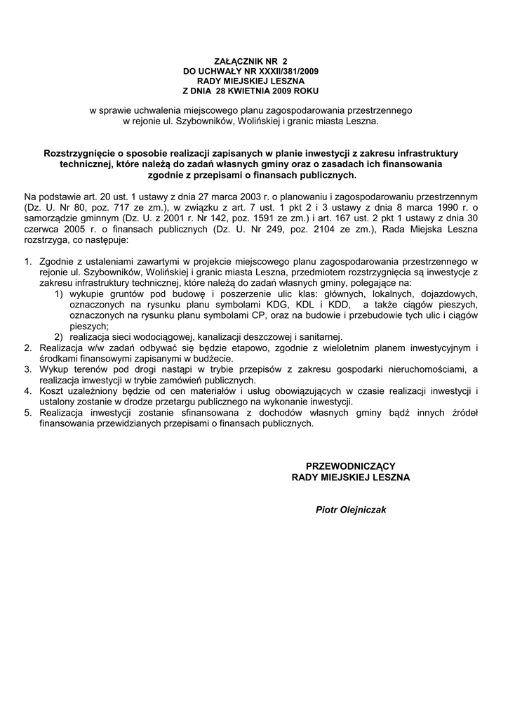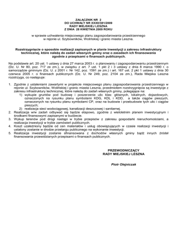 ZAŁĄCZNIK NR 2 DO UCHWAŁY NR XXXII/381/2009 RADY MIEJSKIEJ LESZNA Z DNIA 28 KWIETNIA 2009 ROKU w sprawie uchwalenia miejscowego planu zagospodarowania przestrzennego w rejonie ul. Szybowników, Wolińskiej i granic miasta Leszna. Rozstrzygnięcie o sposobie realizacji zapisanych w planie inwestycji z zakresu infrastruktury technicznej, które należą do zadań własnych gminy oraz o zasadach ich finansowania zgodnie z przepisami o finansach publicznych. Na podstawie art. 20 ust. 1 ustawy z dnia 27 marca 2003 r. o planowaniu i zagospodarowaniu przestrzennym (Dz. U. Nr 80, poz. 717 ze zm.), w związku z art. 7 ust. 1 pkt 2 i 3 ustawy z dnia 8 marca 1990 r. o samorządzie gminnym (Dz. U. z 2001 r. Nr 142, poz. 1591 ze zm.) i art. 167 ust. 2 pkt 1 ustawy z dnia 30 czerwca 2005 r. o finansach publicznych (Dz. U. Nr 249, poz. 2104 ze zm.), Rada Miejska Leszna rozstrzyga, co następuje: 1. Zgodnie z ustaleniami zawartymi w projekcie miejscowego planu zagospodarowania przestrzennego w rejonie ul. Szybowników, Wolińskiej i granic miasta Leszna, przedmiotem rozstrzygnięcia są inwestycje z zakresu infrastruktury technicznej, które należą do zadań własnych gminy, polegające na: 1) wykupie gruntów pod budowę i poszerzenie ulic klas: głównych, lokalnych, dojazdowych, oznaczonych na rysunku planu symbolami KDG, KDL i KDD, a także ciągów pieszych, oznaczonych na rysunku planu symbolami CP, oraz na budowie i przebudowie tych ulic i ciągów pieszych; 2) realizacja sieci wodociągowej, kanalizacji deszczowej i sanitarnej. 2. Realizacja w/w zadań odbywać się będzie etapowo, zgodnie z wieloletnim planem inwestycyjnym i środkami finansowymi zapisanymi w budżecie. 3. Wykup terenów pod drogi nastąpi w trybie przepisów z zakresu gospodarki nieruchomościami, a realizacja inwestycji w trybie zamówień publicznych. 4. Koszt uzależniony będzie od cen materiałów i usług obowiązujących w czasie realizacji inwestycji i ustalony zostanie w drodze przetargu publicznego na wykonanie inwestycji. 5. Realizacja inwestycji zostanie sfinansowana z dochodów własnych gminy bądź innych źródeł finansowania przewidzianych przepisami o finansach publicznych. PRZEWODNICZĄCY RADY MIEJSKIEJ LESZNA Piotr Olejniczak ZAŁĄCZNIK NR 3 DO UCHWAŁY NR XXXII/381/2009 RADY MIEJSKIEJ LESZNA Z DNIA 28 KWIETNIA 2009 ROKU w sprawie uchwalenia miejscowego planu zagospodarowania przestrzennego w rejonie ul. Szybowników, Wolińskiej i granic miasta Leszna. Rozstrzygnięcie o sposobie rozpatrzenia nieuwzględnionych uwag wniesionych do projektu miejscowego planu zagospodarowania przestrzennego. Na podstawie art. 20 ust. 1 ustawy z 27 marca 2003 r. o planowaniu i zagospodarowaniu przestrzennym (Dz. U. Nr 80, poz. 717 ze zmianami) Rada Miejska Leszna ustala, co następuje: Do wyłożonego w dniach od 19 stycznia 2009r. do 9 lutego 2009r.do publicznego wglądu projektu planu nie wniesiono żadnych uwag, w związku z czym nie występuje potrzeba rozstrzygnięć w powyższej sprawie. PRZEWODNICZĄCY RADY MIEJSKIEJ LESZNA Piotr Olejniczak