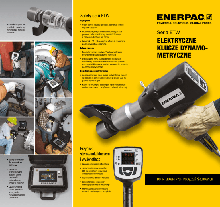 Zalety serii ETW Wydajność Konstrukcja oparta na przekładni planetarnej minimalizuje zużycie i przestoje. • Ciągłe obroty z dużą prędkością pozwalają szybciej wykonać zadanie • Możliwość regulacji momentu obrotowego i kąta pozwala zadać znamionowy moment obrotowy, a następnie określony kąt obrotu • Wskaźnik LED z tyłu narzędzia informuje czy zadane parametry zostały osiągnięte. Łatwa obsługa • Panel sterowniczy z dużym, 7-calowym ekranem dotykowym upraszcza obsługę narzędzia • Umieszczone z tyłu klucza przyciski sterowania umożliwiają użytkownikowi monitorowanie procesu mocowania i kierowanie nim bez konieczności powrotu do panelu sterowniczego. Seria ETW ELEKTRYCZNE KLUCZE DYNAMOMETRYCZNE Rejestracja parametrów pracy • Zapis parametrów pracy można wyświetlać na ekranie i przesyłać za pomocą standardowego złącza USB na panelu sterowniczym • Każde narzędzie jest badane pod kątem wydajności i dostarczane razem z certyfikatem kalibracji fabrycznej. • Łatwy w obsłudze 7-calowy ekran dotykowy • Upraszcza skomplikowane zadania dzięki możliwości automatycznej wstępnej nastawy • Czujnik zwarcia chroni operatora w przypadku niewystarczającego uziemienia. Przyciski sterowania kluczem i wyświetlacz • Wygodnie umieszczone z tyłu klucza • Jasny, trzywierszowy wyświetlacz LED zapewnia łatwy odczyt nawet w nasłonecznionym miejscu • Wybór kierunku obrotów i wskaźniki • Lampki kontrolne osiągnięcia/ nieosiągnięcia momentu obrotowego • Przyciski zwiększania/zmniejszania momentu obrotowego oraz liczby śrub. DO INTELIGENTNYCH POŁĄCZEŃ ŚRUBOWYCH Elektryczne klucze dynamometryczne, seria ETW A Australia i Nowa Zelandia Actuant Australia Ltd. T +61 297 177 200 – F +61 297 438 648 437 Azja Południowo-Wschodnia, Hongkong i Tajwan Actuant Asia Pte Ltd. T +65 68 63 0611 – F +65 64 84 5669 Numer bezpłatny: T +1800 363 7722 165 B C Afryka Południowa oraz inne anglojęzyczne kraje afrykańskie ENERPAC AFRICA ( PTY ) Ltd. T 0027 (0) 12 940 0656 347 D Bliski Wschód, Egipt i Libia ENERPAC Middle East FZE T +971 4 8872686 – F +971 4 8872687 Brazylia Power Packer do Brasil Ltda. T +55 11 5687 2211 Numer bezpłatny: 0800 891 5770 Chiny Actuant (China) Industries Co.Ltd. T +86 0512 5328 7500 – F +86 0512 5335 9690 Numer bezpłatny: T +86 400 885 0369 ▼ TABELA WYBORU Maksymalny moment obrotowy * Napęd Numer czworo- modelu 1) kątny (Nm) (Ft.lbs) (cale) 1355 1355 1355 2710 2710 2710 4065 4065 4065 8135 8135 8135 1000 1000 1000 2000 2000 2000 3000 3000 3000 6000 6000 6000 1 1 1 1 1 1 1 1 1 1½ 1½ 1½ * 1) 2) ETW1000B ETW1000I ETW1000E ETW 2000 B ETW2000I ETW2000E ETW3000B ETW3000I ETW3000E ETW6000B ETW6000I ETW6000E Napięcie Prędkość (V - Hz) (obr./min) 115 - 60 9,8 230 - 60 15,2 230 - 50 15,2 115 - 60 5,8 230 - 60 9,0 230 - 50 9,0 115 - 60 2,8 230 - 60 4,3 230 - 50 4,3 115 - 60 1,9 230 - 60 2,9 230 - 50 2,9 Wymiary (mm) A B C D (kg) 2) 365 365 365 380 380 380 436 436 436 453 453 453 83 83 83 83 83 83 83 83 83 114 114 114 72 72 72 79 79 79 95 95 95 127 127 127 130 130 130 133 133 133 133 133 133 178 178 178 8,2 8,2 8,2 8,9 8,9 8,9 11,9 11,9 11,9 19,1 19,1 19,1 Minimalny moment obrotowy wynosi 20% maksymalnego momentu obrotowego. Napięcie (numer modelu zakończony literą): B = 115 V, 60 Hz I = 230 V, 60 Hz z wtyczką 6-15 NEMA E = 230 V, 50 Hz z popularną europejską wtyczką „SCHUKO” Waga bez ramienia reakcyjnego. Waga ramienia do modeli ETW1000, ETW2000 i ETW3000 wynosi 1,3 kg, a do modelu ETW6000 – 3,5 kg. Waga panelu sterowniczego wynosi 9 kg. Certyfikaty, deklaracje Akcesoria • Deklaracja WE Firma Enerpac oferuje pełny asortyment akcesoriów, w tym różne ramiona reakcyjne i napędy: enerpac.com. • Certyfikat kalibracji przez Enerpac • Certyfikat bezpieczeństwa elektrycznego na terenie Ameryki Północnej, wydany przez CSA • Oznakowanie CSA USA i Kanada. Enerpac Integrated Solutions B.V. T +31 74 242 20 45 – F +31 74 243 03 38 Francja, Szwajcaria, Afryka Północna oraz francuskojęzyczne kraje afrykańskie ENERPAC, Une division d’ACTUANT France S.A.S. T +33 1 60 13 68 68 – F +33 1 69 20 37 50 Hiszpania i Portugalia ENERPAC SPAIN, S.L. T +34 91 884 86 06 – F +34 91 884 86 11 Holandia, Belgia, Luksemburg, Europa ŚrodkowoWschodnia, kraje bałtyckie, Grecja, Turcja oraz kraje Wspólnoty Niepodległych Państw ENERPAC B.V. T +31 318 535 911 – F +31 318 535 848 Indie Actuant India Private Limited T +91 80 3928 9000 Japonia Applied Power Japan LTD KK T +81 48 662 4911 – F +81 48 662 4955 Korea Południowa Actuant Korea Ltd. T +82 31 434 4506 – F +82 31 434 4507 Niemcy i Austria Actuant GmbH T +49 211 471 490 – F +49 211 471 49 28 Norwegia Tel.: +47 91 578 300 Rosja Biuro przedstawiciela firmy Enerpac T +7 495 98090 91 – F +7 495 98090 92 Szwecja, Dania, Finlandia i Islandia Enerpac Scandinavia AB T +46 (0) 771 415000 USA, Ameryka Łacińska i Karaiby ENERPAC T +1 262 293 1600 – F +1 262 293 7036 Zapytania klientów: +1 800 433 2766 Zapytania i zamówienia dystrybutorów: T +1 800 558 0530 – F +1 800 628 0490 Wielka Brytania i Irlandia ENERPAC Ltd. T +44 1670 5016 50 – F +44 1670 5016 51 Włochy ENERPAC S.p.A. T +39 02 4861 111 – F +39 02 4860 1288 [email protected] www.enerpac.com 9265 PL © Enerpac 06-2016 Treść może ulec zmianie bez powiadomienia. PROSTE ROZWIĄZANIE DLA CIEBIE
