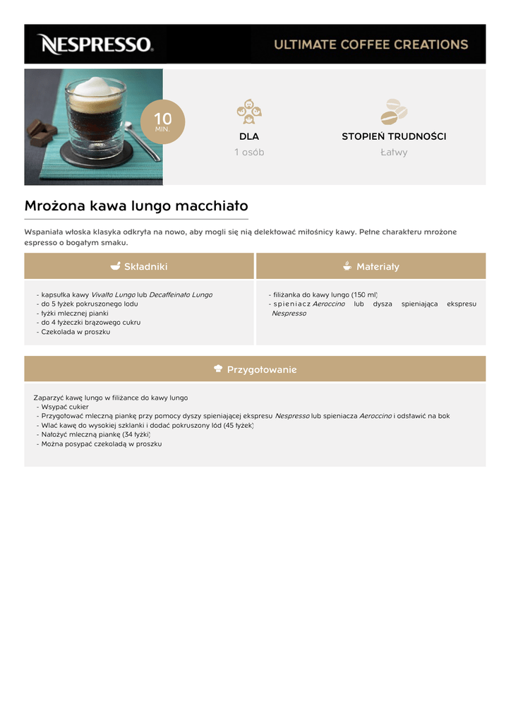 10 MIN. DLA STOPIEŃ TRUDNOŚCI 1 osób Łatwy Mrożona kawa lungo macchiato Wspaniała włoska klasyka odkryta na nowo, aby mogli się nią delektować miłośnicy kawy. Pełne charakteru mrożone espresso o bogatym smaku. Składniki - kapsułka kawy Vivalto Lungo lub Decaffeinato Lungo do 5 łyżek pokruszonego lodu łyżki mlecznej pianki do 4 łyżeczki brązowego cukru Czekolada w proszku Materiały - filiżanka do kawy lungo (150 ml) - s p i e n i a c z Aeroccino lub dysza Nespresso spieniająca ekspresu Przygotowanie Zaparzyć kawę lungo w filiżance do kawy lungo - Wsypać cukier - Przygotować mleczną piankę przy pomocy dyszy spieniającej ekspresu Nespresso lub spieniacza Aeroccino i odstawić na bok - Wlać kawę do wysokiej szklanki i dodać pokruszony lód (45 łyżek) - Nałożyć mleczną piankę (34 łyżki) - Można posypać czekoladą w proszku