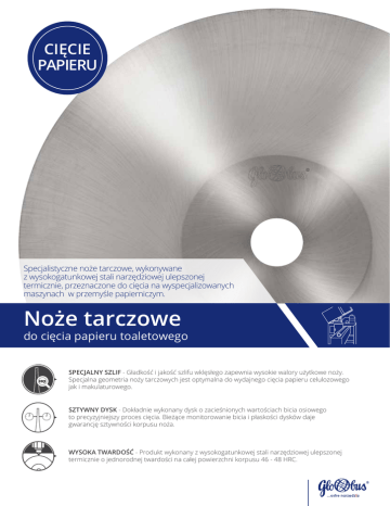 cięcie papieru Specjalistyczne noże tarczowe, wykonywane z wysokogatunkowej stali narzędziowej ulepszonej termicznie, przeznaczone do cięcia na wyspecjalizowanych maszynach w przemyśle papierniczym. Noże tarczowe do cięcia papieru toaletowego SPECJALNY SZLIF - Gładkość i jakość szlifu wklęsłego zapewnia wysokie walory użytkowe noży. Specjalna geometria noży tarczowych jest optymalna do wydajnego cięcia papieru celulozowego jak i makulaturowego. SZTYWNY DYSK - Dokładnie wykonany dysk o zacieśnionych wartościach bicia osiowego to precyzyjniejszy proces cięcia. Bieżące monitorowanie bicia i płaskości dysków daje gwarancję sztywności korpusu noża. WYSOKA TWARDOŚĆ - Produkt wykonany z wysokogatunkowej stali narzędziowej ulepszonej termicznie o jednorodnej twardości na całej powierzchni korpusu 46 - 48 HRC. Noże tarczowe do cięcia papieru toaletowego KY100 CECHY / KORZYŚCI: noże wyprodukowane z wysokogatunkowej stali narzędziowej ulepszonej termicznie dwustronna odśrodkowa zbieżność powierzchni bocznych (powyżej kołnierza) nóż nie posiada faz ostrza, co umożliwia to użytkownikowi nadanie własnej geometrii ostrza z użyciem ściernic na wyposażeniu maszyny i w zależności od rodzaju / gatunku ciętego papieru bardzo dobre wyniki żywotności cięcia w rolkach makulaturowych o dużej zawartości pochodnych popiołu ZASTOSOWANIE: przeznaczone do cięcia papieru toaletowego (celulozowego i makulaturowego) stosowane na wyspecjalizowanych maszynach w przemyśle papierniczym przed przystąpieniem do pracy należy wykonać fazę ostrza na nożu - bezpośrednio po założeniu noża na maszynę możliwość wyboru i dopasowania grubości noża w zależności od gatunku i gęstości ciętego materiału INDEX ilość faz J.M. CENA KATALOGOWA mm mm mm mm z netto/szt. KY100-0610-0002 610 60 4,2 2 220 szt. 599,50 KY100-0610-0003 610 60 4,5 2 220 szt. 594,00 KY100-0610-0004 610 60 4,8 2 220 szt. 588,50 Do podaych cen należy doliczyć 23% podatek VAT. Wybierz najwygodniejszy sposób zamówienia. dział obsługi klienta lubelskie, małopolskie, podkarpackie +48 667 992 313 łódzkie, mazowieckie, podlaskie, świętokrzyskie, warmińsko-mazurskie +48 667 992 314 kujawsko-pomorskie, pomorskie, wielkopolskie, zachodniopomorskie +48 667 992 315 dolnośląskie, lubuskie, opolskie, śląskie +48 667 992 316 Fabryka Pił i Narzędzi WAPIENICA Sp. z o.o. ul. T. Regera 30, 43-382, Bielsko-Biała tel.: +48 33 82 80 800 fax: +48 33 48 80 065 [email protected] faksem +48 33 48 80 065 odwiedź punkty sprzedaży Top Hurt, Top Serwis, PH, Koelner Polska pocztą elektroniczną [email protected] odwiedź SKLEP FIRMOWY pn.-pt. 8.00 - 16.00 ul. T. Regera 30, Bielsko-Biała przez sklep internetowy 7 dni w tygodniu, 24 h/ dobę www.globus-wapienica.eu www.globus-wapienica.eu