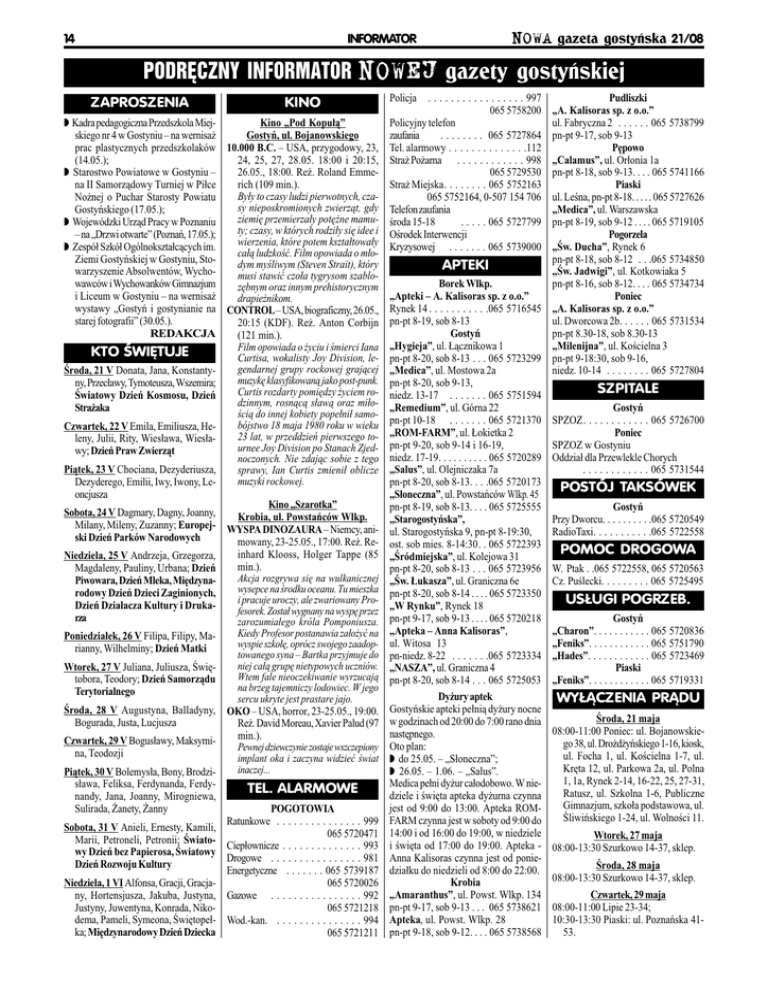 14 INFORMATOR NOWA gazeta gostyñska 21/08 PODRÊCZNY INFORMATOR NOWEJ gazety gostyñskiej ZAPROSZENIA KINO w Kadra pedagogiczna Przedszkola MiejKino Pod Kopu³¹ skiego nr 4 w Gostyniu na wernisa¿ Gostyñ, ul. Bojanowskiego prac plastycznych przedszkolaków 10.000 B.C. USA, przygodowy, 23, 24, 25, 27, 28.05. 18:00 i 20:15, (14.05.); 26.05., 18:00. Re¿. Roland Emmew Starostwo Powiatowe w Gostyniu rich (109 min.). na II Samorz¹dowy Turniej w Pi³ce By³y to czasy ludzi pierwotnych, czaNo¿nej o Puchar Starosty Powiatu sy nieposkromionych zwierz¹t, gdy Gostyñskiego (17.05.); ziemiê przemierza³y potê¿ne mamuw Wojewódzki Urz¹d Pracy w Poznaniu ty; czasy, w których rodzi³y siê idee i na Drzwi otwarte (Poznañ, 17.05.); wierzenia, które potem kszta³towa³y w Zespó³ Szkó³ Ogólnokszta³c¹cych im. ca³¹ ludzkoæ. Film opowiada o m³oZiemi Gostyñskiej w Gostyniu, Stodym myliwym (Steven Strait), który warzyszenie Absolwentów, Wychomusi stawiæ czo³a tygrysom szablowawców i Wychowanków Gimnazjum zêbnym oraz innym prehistorycznym i Liceum w Gostyniu na wernisa¿ drapie¿nikom. wystawy Gostyñ i gostynianie na CONTROL USA, biograficzny, 26.05., starej fotografii (30.05.). 20:15 (KDF). Re¿. Anton Corbijn REDAKCJA (121 min.). Film opowiada o ¿yciu i mierci Iana KTO WIÊTUJE Curtisa, wokalisty Joy Division, legendarnej grupy rockowej graj¹cej roda, 21 V Donata, Jana, Konstantymuzykê klasyfikowan¹ jako post-punk. ny, Przec³awy, Tymoteusza, Wszemira; Curtis rozdarty pomiêdzy ¿yciem rowiatowy Dzieñ Kosmosu, Dzieñ dzinnym, rosn¹c¹ s³aw¹ oraz mi³oStra¿aka ci¹ do innej kobiety pope³ni³ samobójstwo 18 maja 1980 roku w wieku Czwartek, 22 V Emila, Emiliusza, He23 lat, w przeddzieñ pierwszego toleny, Julii, Rity, Wies³awa, Wies³aurnee Joy Division po Stanach Zjedwy; Dzieñ Praw Zwierz¹t noczonych. Nie zdaj¹c sobie z tego Pi¹tek, 23 V Chociana, Dezyderiusza, sprawy, Ian Curtis zmieni³ oblicze muzyki rockowej. Dezyderego, Emilii, Iwy, Iwony, Leoncjusza Kino Szarotka Sobota, 24 V Dagmary, Dagny, Joanny, Krobia, ul. Powstañców Wlkp. Milany, Mileny, Zuzanny; Europej- WYSPA DINOZAURA Niemcy, aniski Dzieñ Parków Narodowych mowany, 23-25.05., 17:00. Re¿. Reinhard Klooss, Holger Tappe (85 Niedziela, 25 V Andrzeja, Grzegorza, min.). Magdaleny, Pauliny, Urbana; Dzieñ Akcja rozgrywa siê na wulkanicznej Piwowara, Dzieñ Mleka, Miêdzynawysepce na rodku oceanu. Tu mieszka rodowy Dzieñ Dzieci Zaginionych, i pracuje uroczy, ale zwariowany ProDzieñ Dzia³acza Kultury i Drukafesorek. Zosta³ wygnany na wyspê przez rza zarozumia³ego króla Pomponiusza. Kiedy Profesor postanawia za³o¿yæ na Poniedzia³ek, 26 V Filipa, Filipy, Mawyspie szko³ê, oprócz swojego zaadoprianny, Wilhelminy; Dzieñ Matki towanego syna Bartka przyjmuje do niej ca³¹ grupê nietypowych uczniów. Wtorek, 27 V Juliana, Juliusza, wiêWtem fale nieoczekiwanie wyrzucaj¹ tobora, Teodory; Dzieñ Samorz¹du na brzeg tajemniczy lodowiec. W jego Terytorialnego sercu ukryte jest prastare jajo. roda, 28 V Augustyna, Balladyny, OKO USA, horror, 23-25.05., 19:00. Bogurada, Justa, Lucjusza Re¿. David Moreau, Xavier Palud (97 min.). Czwartek, 29 V Bogus³awy, MaksymiPewnej dziewczynie zostaje wszczepiony na, Teodozji implant oka i zaczyna widzieæ wiat inaczej... Pi¹tek, 30 V Bolemys³a, Bony, Brodzis³awa, Feliksa, Ferdynanda, FerdyTEL. ALARMOWE nandy, Jana, Joanny, Mirogniewa, POGOTOWIA Sulirada, ¯anety, ¯anny Ratunkowe . . . . . . . . . . . . . . . 999 Sobota, 31 V Anieli, Ernesty, Kamili, 065 5720471 Marii, Petroneli, Petronii; wiatoCiep³ownicze . . . . . . . . . . . . . . 993 wy Dzieñ bez Papierosa, wiatowy Drogowe . . . . . . . . . . . . . . . . 981 Dzieñ Rozwoju Kultury Energetyczne . . . . . . . 065 5739187 Niedziela, 1 VI Alfonsa, Gracji, Gracja065 5720026 ny, Hortensjusza, Jakuba, Justyna, Gazowe . . . . . . . . . . . . . . . . 992 Justyny, Juwentyna, Konrada, Niko065 5721218 dema, Pameli, Symeona, wiêtope³- Wod.-kan. . . . . . . . . . . . . . . . 994 ka; Miêdzynarodowy Dzieñ Dziecka 065 5721211 Policja . . . . . . . . . . . . . . . . . 997 065 5758200 Policyjny telefon zaufania . . . . . . . . 065 5727864 Tel. alarmowy . . . . . . . . . . . . . .112 Stra¿ Po¿arna . . . . . . . . . . . . 998 065 5729530 Stra¿ Miejska. . . . . . . . 065 5752163 065 5752164, 0-507 154 706 Telefon zaufania roda 15-18 . . . . . 065 5727799 Orodek Interwencji Kryzysowej . . . . . . . 065 5739000 Pudliszki A. Kalisoras sp. z o.o. ul. Fabryczna 2 . . . . . . 065 5738799 pn-pt 9-17, sob 9-13 Pêpowo Calamus, ul. Or³onia 1a pn-pt 8-18, sob 9-13. . . . 065 5741166 Piaski ul. Lena, pn-pt 8-18. . . . . 065 5727626 Medica, ul. Warszawska pn-pt 8-19, sob 9-12 . . . . 065 5719105 Pogorzela w. Ducha, Rynek 6 pn-pt 8-18, sob 8-12 . . .065 5734850 APTEKI w. Jadwigi, ul. Kotkowiaka 5 Borek Wlkp. pn-pt 8-16, sob 8-12. . . . 065 5734734 Apteki A. Kalisoras sp. z o.o. Poniec Rynek 14 . . . . . . . . . . .065 5716545 A. Kalisoras sp. z o.o. pn-pt 8-19, sob 8-13 ul. Dworcowa 2b. . . . . . 065 5731534 Gostyñ pn-pt 8.30-18, sob 8.30-13 Hygieja, ul. £¹cznikowa 1 Milenijna, ul. Kocielna 3 pn-pt 8-20, sob 8-13 . . . 065 5723299 pn-pt 9-18:30, sob 9-16, Medica, ul. Mostowa 2a niedz. 10-14 . . . . . . . . 065 5727804 pn-pt 8-20, sob 9-13, SZPITALE niedz. 13-17 . . . . . . . 065 5751594 Remedium, ul. Górna 22 Gostyñ pn-pt 10-18 . . . . . . . 065 5721370 SPZOZ. . . . . . . . . . . . 065 5726700 ROM-FARM, ul. £okietka 2 Poniec pn-pt 9-20, sob 9-14 i 16-19, SPZOZ w Gostyniu niedz. 17-19. . . . . . . . . . 065 5720289 Oddzia³ dla Przewlekle Chorych Salus, ul. Olejniczaka 7a . . . . . . . . . . . . 065 5731544 pn-pt 8-20, sob 8-13. . . .065 5720173 POSTÓJ TAKSÓWEK S³oneczna, ul. Powstañców Wlkp. 45 Gostyñ pn-pt 8-19, sob 8-13. . . . 065 5725555 Przy Dworcu. . . . . . . . . .065 5720549 Starogostyñska, RadioTaxi. . . . . . . . . . .065 5722558 ul. Starogostyñska 9, pn-pt 8-19:30, ost. sob mies. 8-14:30. . 065 5722393 