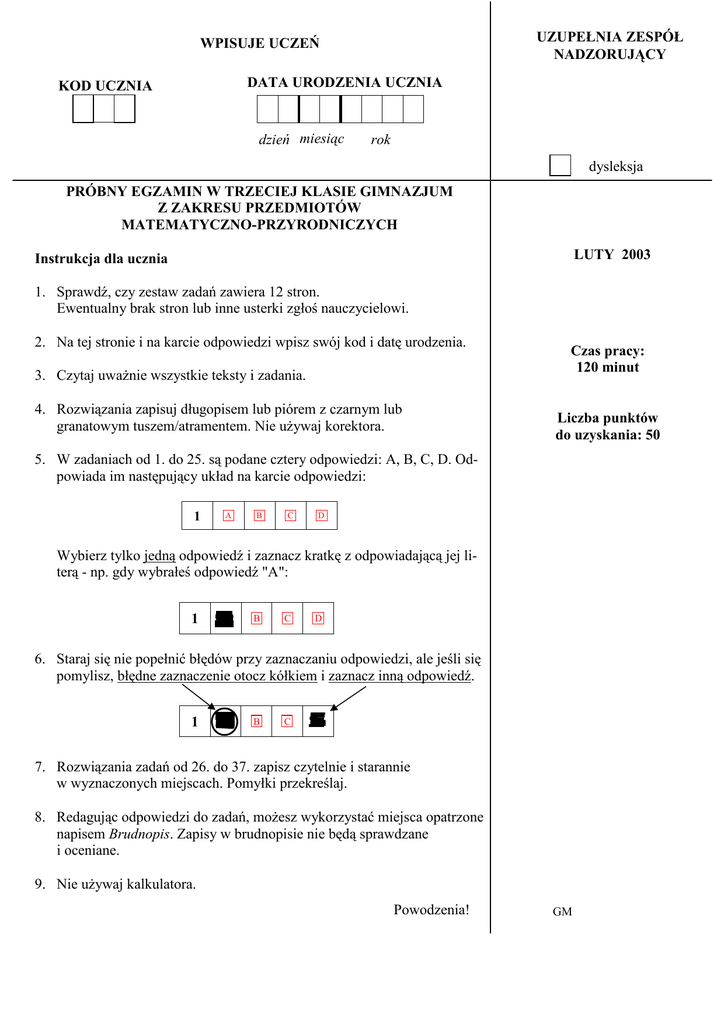 UZUPEŁNIA ZESPÓŁ NADZORUJĄCY WPISUJE UCZEŃ DATA URODZENIA UCZNIA KOD UCZNIA dzień miesiąc rok dysleksja PRÓBNY EGZAMIN W TRZECIEJ KLASIE GIMNAZJUM Z ZAKRESU PRZEDMIOTÓW MATEMATYCZNO-PRZYRODNICZYCH LUTY 2003 Instrukcja dla ucznia 1. Sprawdź, czy zestaw zadań zawiera 12 stron. Ewentualny brak stron lub inne usterki zgłoś nauczycielowi. 2. Na tej stronie i na karcie odpowiedzi wpisz swój kod i datę urodzenia. 3. Czytaj uwaŜnie wszystkie teksty i zadania. 4. Rozwiązania zapisuj długopisem lub piórem z czarnym lub granatowym tuszem/atramentem. Nie uŜywaj korektora. Czas pracy: 120 minut Liczba punktów do uzyskania: 50 5. W zadaniach od 1. do 25. są podane cztery odpowiedzi: A, B, C, D. Odpowiada im następujący układ na karcie odpowiedzi: 1 A. B. C. D. Wybierz tylko jedną odpowiedź i zaznacz kratkę z odpowiadającą jej literą - np. gdy wybrałeś odpowiedź "A": 1 A. B. C. D. 6. Staraj się nie popełnić błędów przy zaznaczaniu odpowiedzi, ale jeśli się pomylisz, błędne zaznaczenie otocz kółkiem i zaznacz inną odpowiedź. 1 A. B. C. D. 7. Rozwiązania zadań od 26. do 37. zapisz czytelnie i starannie w wyznaczonych miejscach. Pomyłki przekreślaj. 8. Redagując odpowiedzi do zadań, moŜesz wykorzystać miejsca opatrzone napisem Brudnopis. Zapisy w brudnopisie nie będą sprawdzane i oceniane. 9. Nie uŜywaj kalkulatora. Powodzenia! GM Rozwiązując zadanie 1, 2, 3, wykorzystaj poniŜszą mapę, na której przedstawiono fragment powierzchni działki. Legenda las liściasty las iglasty łąka 0 200 m Zadanie 1. (0-1) Łąki zajmują powierzchnię: A. 250 m2 B. 2500 m2 C. 25000 m2 D. 250000 m2 Zadanie 2. (0-1) Drzewa liściaste zajmują powierzchnię 40000 m2, co stanowi: A. 0,04 km2 B.0,4 km2 C. 4 km2 D. 40 km2 Zadanie 3. (0-1) Udział powierzchni łąk w ogólnej powierzchni działki wynosi: A. 2,5% B. 4% C. 25 % D. 40 % Zadanie 4. (0-1) W okresie roku kaŜdy metr kwadratowy powierzchni łąki otrzymuje blisko 1700 MJ energii słonecznej. Z tego rośliny łąkowe wykorzystują około 20 MJ. JeŜeli x oznacza część energii wykorzystywanej przez rośliny, to: A. x > 0,1 B. 0,05 < x < 0,1 C. x < 0,01 D. 0,01 < x < 0,05 Zadanie 5. (0-1) Woda, otrzymana przez skroplenie odparowanej wody morskiej, jest: A. kwaśna, C. słona tak jak woda morska, B. bez smaku, D. mniej słona niŜ woda morska. Zadanie 6. (0-1) Sfotografowano śółtą Turnię. Turnie, to skaliste szczyty górskie o stromych, pionowych ścianach. Na podstawie opisu moŜna stwierdzić, Ŝe zdjęcie wykonano w: A. Tatrach, B. Beskidach, C. Bieszczadach, Strona 2 z 12 D. Górach Świętokrzyskich. Zadanie 7. (0-1) Nazwa śółta Turnia pochodzi od występujących tam porostów, które są organizmami zbudowanymi z: A. grzybów i bakterii, C. bakterii i okrytonasiennych, B. glonów i grzybów, D. grzybów i okrytonasiennych. Zadanie 8. (0-1) Między organizmami wchodzącymi w skład porostów występuje symbioza. Jest to rodzaj współŜycia polegający na tym, Ŝe: A. oba organizmy odnoszą korzyści, B. Ŝaden z organizmów nie odnosi korzyści, C. jeden z organizmów odnosi korzyści, a drugi ponosi straty, D. jeden z organizmów osiąga korzyści, a drugi nie ponosi strat. Zadanie 9. (0-1) Porosty są bardzo wraŜliwe na obecność tlenków siarki w powietrzu, dlatego największym zagroŜeniem dla nich jest przemysł: A. spoŜywczy, B. elektroniczny, C. energetyczny, D. włókienniczy. Zadanie 10. (0-1) Jedną z cech odróŜniających klimat morski od kontynentalnego są mniejsze amplitudy temperatur i wyŜsze sumy opadów. W styczniu średnie temperatury i wielkość opadów w Europie w miarę posuwania się w głąb lądu, zmieniają się następująco: A. temperatury rosną, opady rosną; C. temperatury maleją, opady rosną; B. temperatury rosną, opady maleją; D. temperatury maleją, opady maleją. Zadanie 11. (0-1) Z grzęzawiska samochód wyciągany jest przez dwa inne pojazdy. Mniejszy z nich → → ciągnie z siłą F1 = 0,5 kN , a większy z siłą F2 = 1,2 kN . Prawidłowo określony wektor siły wypadkowej ma wartość: A. 0,7 kN B. 1,2 kN grzęzawisko grzęzawisko → F1 → FW C. 0,85 kN grzęzawisko → → F1 F1 → → → F2 FW D. 1,7 kN grzęzawisko → → FW F1 → → F2 F2 F2 → FW Strona 3 z 12 Zadanie 12. (0-1) Ciastka tego samego rodzaju i gatunku sprzedaje się w czterech porcjach róŜnych wagowo. 100 g 1 zł 30 200 g 250 g 500 g 2 zł 50 gr 3 zł 6 zł 20 gr gr Aby za 1 kg ciastek zapłacić najmniej, trzeba wybrać ciastka w opakowaniach: A. 100 gramowych, C. 250 gramowych, B. 200 gramowych, D. 500 gramowych. Zadanie 13. (0-1) Wykres przedstawia zjawisko znane w geografii ludności jako eksplozja demograficzna. Tendencję zmian w III fazie rozwoju demograficznego prawidłowo opisuje stwierdzenie: o /oo A. stopa urodzeń maleje, stopa zgonów maleje; B. stopa urodzeń maleje, stopa zgonów bez zmian; C. stopa urodzeń bez zmian, stopa zgonów maleje; D. stopa urodzeń bez zmian, stopa zgonów bez zmian. urodzenia zgony czas I faza II faza III faza Zadanie 14. (0-1) W ruchu jednostajnym prostoliniowym prędkość określa się wzorem: v = oznacza prędkość, s - drogę, t - czas. Prawdziwe jest zdanie: A. droga jest wprost proporcjonalna do czasu; B. prędkość jest wprost proporcjonalna do czasu; C. prędkość jest odwrotnie proporcjonalna do drogi; D. Ŝadne wielkości nie są do siebie wprost proporcjonalne. Strona 4 z 12 s , gdzie v t IV faza Zadanie 15. (0-1) Z wakacji nad morzem Ola przywiozła muszle. Kilka z nich wykorzystano na lekcji chemii do doświadczenia przedstawionego na rysunku. HCl muszle woda wapienna Reakcja przebiegła gwałtownie z wydzieleniem bezbarwnego gazu, który spowodował zmętnienie wody wapiennej. Przebieg tej reakcji prawidłowo przedstawia równanie: A. Ca + 2 HCl → CaCl 2 + H 2 B. CaO + 2 HCl → CaCl 2 + 2 H 2 O C. CaCO3 + 2 HCl → CaO + H 2 O + Cl 2 D. CaCO3 + 2 HCl → CO2 + CaCl2 + H 2O Zadanie 16. (0-1) Czynność