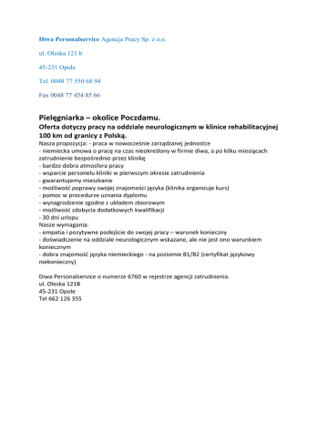 Diwa Personalservice Agencja Pracy Sp. z o.o. ul. Oleska 121 b 45-231 Opole Tel. 0048 77 550 68 94 Fax 0048 77 454 85 66 Pielęgniarka – okolice Poczdamu. Oferta dotyczy pracy na oddziale neurologicznym w klinice rehabilitacyjnej 100 km od granicy z Polską. Nasza propozycja: - praca w nowocześnie zarządzanej jednostce - niemiecka umowa o pracę na czas nieokreślony w firmie diwa, a po kilku miesiącach zatrudnienie bezpośrednio przez klinikę - bardzo dobra atmosfera pracy - wsparcie personelu kliniki w pierwszym okresie zatrudnienia - gwarantujemy mieszkanie - możliwość poprawy swojej znajomości języka (klinika organizuje kurs) - pomoc w procedurze uznania dyplomu - wynagrodzenie zgodne z układem zbiorowym - możliwość zdobycia dodatkowych kwalifikacji - 30 dni urlopu Nasze wymagania: - empatia i pozytywne podejście do swojej pracy – warunek konieczny - doświadczenie na oddziale neurologicznym wskazane, ale nie jest ono warunkiem koniecznym - dobra znajomość języka niemieckiego - na poziomie B1/B2 (certyfikat językowy niekonieczny) Diwa Personalservice o numerze 6760 w rejestrze agencji zatrudnienia. ul. Oleska 121B 45-231 Opole Tel 662 126 355