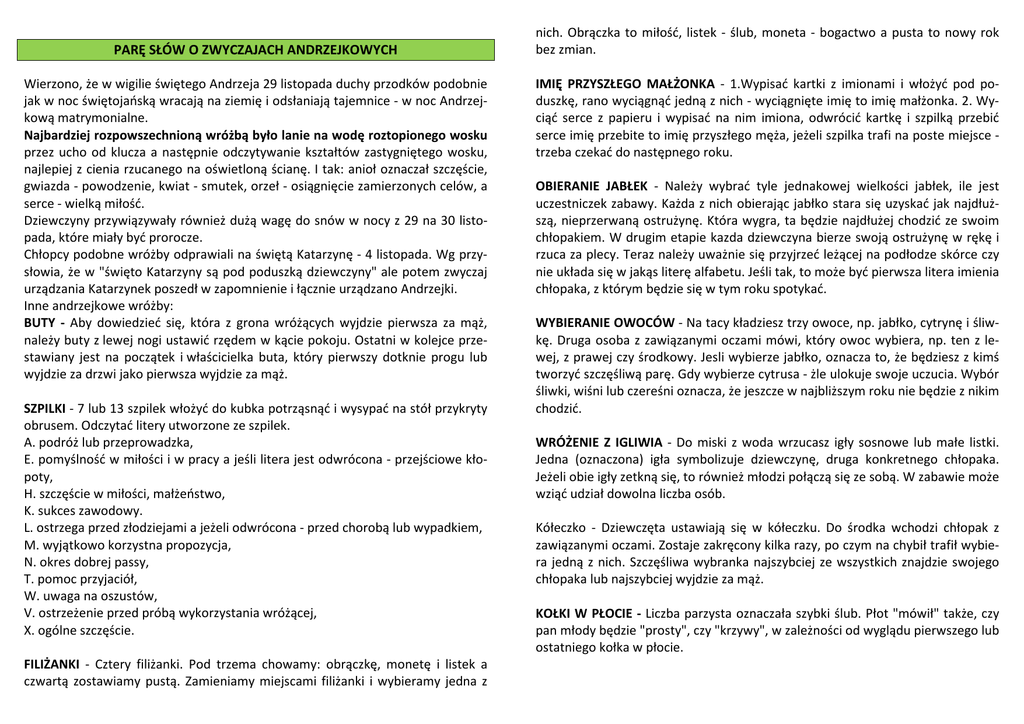 PARĘ SŁÓW O ZWYCZAJACH ANDRZEJKOWYCH Wierzono, że w wigilie świętego Andrzeja 29 listopada duchy przodków podobnie jak w noc świętojańską wracają na ziemię i odsłaniają tajemnice - w noc Andrzejkową matrymonialne. Najbardziej rozpowszechnioną wróżbą było lanie na wodę roztopionego wosku przez ucho od klucza a następnie odczytywanie kształtów zastygniętego wosku, najlepiej z cienia rzucanego na oświetloną ścianę. I tak: anioł oznaczał szczęście, gwiazda - powodzenie, kwiat - smutek, orzeł - osiągnięcie zamierzonych celów, a serce - wielką miłość. Dziewczyny przywiązywały również dużą wagę do snów w nocy z 29 na 30 listopada, które miały być prorocze. Chłopcy podobne wróżby odprawiali na świętą Katarzynę - 4 listopada. Wg przysłowia, że w "święto Katarzyny są pod poduszką dziewczyny" ale potem zwyczaj urządzania Katarzynek poszedł w zapomnienie i łącznie urządzano Andrzejki. Inne andrzejkowe wróżby: BUTY - Aby dowiedzieć się, która z grona wróżących wyjdzie pierwsza za mąż, należy buty z lewej nogi ustawić rzędem w kącie pokoju. Ostatni w kolejce przestawiany jest na początek i właścicielka buta, który pierwszy dotknie progu lub wyjdzie za drzwi jako pierwsza wyjdzie za mąż. SZPILKI - 7 lub 13 szpilek włożyć do kubka potrząsnąć i wysypać na stół przykryty obrusem. Odczytać litery utworzone ze szpilek. A. podróż lub przeprowadzka, E. pomyślność w miłości i w pracy a jeśli litera jest odwrócona - przejściowe kłopoty, H. szczęście w miłości, małżeństwo, K. sukces zawodowy. L. ostrzega przed złodziejami a jeżeli odwrócona - przed chorobą lub wypadkiem, M. wyjątkowo korzystna propozycja, N. okres dobrej passy, T. pomoc przyjaciół, W. uwaga na oszustów, V. ostrzeżenie przed próbą wykorzystania wróżącej, X. ogólne szczęście. FILIŻANKI - Cztery filiżanki. Pod trzema chowamy: obrączkę, monetę i listek a czwartą zostawiamy pustą. Zamieniamy miejscami filiżanki i wybieramy jedna z nich. Obrączka to miłość, listek - ślub, moneta - bogactwo a pusta to nowy rok bez zmian. IMIĘ PRZYSZŁEGO MAŁŻONKA - 1.Wypisać kartki z imionami i włożyć pod poduszkę, rano wyciągnąć jedną z nich - wyciągnięte imię to imię małżonka. 2. Wyciąć serce z papieru i wypisać na nim imiona, odwrócić kartkę i szpilką przebić serce imię przebite to imię przyszłego męża, jeżeli szpilka trafi na poste miejsce trzeba czekać do następnego roku. OBIERANIE JABŁEK - Należy wybrać tyle jednakowej wielkości jabłek, ile jest uczestniczek zabawy. Każda z nich obierając jabłko stara się uzyskać jak najdłuższą, nieprzerwaną ostrużynę. Która wygra, ta będzie najdłużej chodzić ze swoim chłopakiem. W drugim etapie kazda dziewczyna bierze swoją ostrużynę w rękę i rzuca za plecy. Teraz należy uważnie się przyjrzeć leżącej na podłodze skórce czy nie układa się w jakąs literę alfabetu. Jeśli tak, to może być pierwsza litera imienia chłopaka, z którym będzie się w tym roku spotykać. WYBIERANIE OWOCÓW - Na tacy kładziesz trzy owoce, np. jabłko, cytrynę i śliwkę. Druga osoba z zawiązanymi oczami mówi, który owoc wybiera, np. ten z lewej, z prawej czy środkowy. Jesli wybierze jabłko, oznacza to, że będziesz z kimś tworzyć szczęśliwą parę. Gdy wybierze cytrusa - żle ulokuje swoje uczucia. Wybór śliwki, wiśni lub czereśni oznacza, że jeszcze w najbliższym roku nie będzie z nikim chodzić. WRÓŻENIE Z IGLIWIA - Do miski z woda wrzucasz igły sosnowe lub małe listki. Jedna (oznaczona) igła symbolizuje dziewczynę, druga konkretnego chłopaka. Jeżeli obie igły zetkną się, to również młodzi połączą się ze sobą. W zabawie może wziąć udział dowolna liczba osób. Kółeczko - Dziewczęta ustawiają się w kółeczku. Do środka wchodzi chłopak z zawiązanymi oczami. Zostaje zakręcony kilka razy, po czym na chybił trafił wybiera jedną z nich. Szczęśliwa wybranka najszybciej ze wszystkich znajdzie swojego chłopaka lub najszybciej wyjdzie za mąż. KOŁKI W PŁOCIE - Liczba parzysta oznaczała szybki ślub. Płot "mówił" także, czy pan młody będzie "prosty", czy "krzywy", w zależności od wyglądu pierwszego lub ostatniego kołka w płocie. INFORMACJA KRAJOZNAWCZA Rajd rozpoczyna się we wsi Wierzchomino, które pojawiło się we wzmiankach historycznych w 1288 roku. Nazwa wsi pochodzi od słowiańskiego rodu Varchmin, założycieli – właścicieli wsi. Od XIV wieku była w posiadaniu rodziny Kameke. We wsi znajduje się kościół p.w. św. Piotra i Pawła z 1784 roku. W wieży kościoła umieszczony jest dzwon z 1733 roku. Na południe od wsi “niebieski” szlak rowerowy wiedzie obok rezerwatów florystycznych “Wierzchomińskie Bagno” o pow. 43,6 ha i sąsiadującego z nim rezerwatu „Warnie Bagno”, który jest znacznie większy, bo zajmuje ponad 500 hektarów. W skład rezerwatów wchodzą lasy, torfowiska, rzeki i zarastające jeziora. Przedmiotem ochrony jest torfowisko wysokie i kopułowe torfowisko bałtyckie. Występuje tu żurawina błotna, bagno zwyczajne, wrzosiec bagienny, rosiczka, borówka bagienna oraz jedno z największych w Polsce stanowisk wiciokrzewu pomorskiego. W północnej części rezerwatu, w okolicy wsi Smolne, wydobywano w okresie przedwojennym torf, który wykorzystywano do celów opałowych lub jako materiał izolacyjny i ocieplający w budownictwie. Duży kompleks leśny jest ostoją dzika, sarny, jelenia, łosia, daniela, lisa, borsuka. Cisza i spokój zapewniają bardzo dobre warunki lęgowe licznym gatunkom ptactwa wodnego. Rajd zakończymy we wsi Warnino (Warnin) – według danych z 31 grudnia 2005 r. miała 160 mieszkańców. Warnino od XIV wieku do 1658 roku należało do rodu rycerskiego von Parsow. XXV Rajd Pieszy „ANDRZEJKI 2016” W XVIII wieku folwark oraz wieś były częściowo własnością Georga von Kameke. W 1772 roku Warni