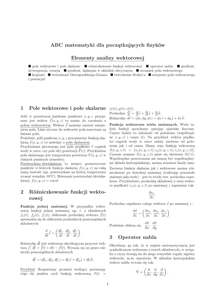 ABC matematyki dla początkujących fizyków Elementy analizy wektorowej pole wektorowe i pole skalarne różniczkowanie funkcji wektorowej operator nabla gradient, dywergencja, rotacja gradient, laplasjan w układzie sferycznym strumień pola wektorowego krążenie twierdzenie Ostrogradskiego-Gaussa twierdzenie Stokes’a natężenie pola wektorowego i potencjał 1 Pole wektorowe i pole skalarne (x(t), y(t), z(t)). dy dx r dz Pochodna: d~ dt = dt î + dt ĵ + dt k̂. Różniczka: d~r = (dx, dy, dz) = dx î + dy ĵ + dz k̂. Jeśli w przestrzeni każdemu punktowi x, y, z przypisany jest wektor f~(x, y, z) to mamy do czynienia z polem wektorowym. Wektor f~ możemy nazwać natężeniem pola. Linie styczne do wektorów pola nazywane są liniami pola. Podobnie, jeśli punktom x, y, z przypiszemy funkcję skalarną f (x, y, z) to mówimy o polu skalarnym. Przykładami pierwszego jest pole prędkości ~v cząstek wody w rzece, czy pole siły grawitacji F~ (r). Przykładem pola skalarnego jest temperatura powietrza T (x, y, z) w różnych punktach atmosfery. Powierzchnia ekwiskalarna to miejsce geometryczne punktów w których funkcja skalarna f (x, y, z) na taką samą wartość (np. powierzchnie na której temperatura wynosi wszędzie 10o C). Równanie powierzchni ekwiskalarnej: f (x, y, z) = const. 2 Funkcja wektorowa wielu zmiennych. Wiele takich funkcji spotykamy opisując zjawiska fizyczne. Często będzie to zależność od położenia (współrzędne x, y, z) i czasu (t). Na przykład: wektor prędkości cząstek wody w rzece zależy zarówno od położenia jak i od czasu. Mamy więc funkcję wektorową ~v (x, y, z, t) = vx (x, y, z, t), vy (x, y, z, t), vz (x, y, z, t) . Czasem zamiast ~v (x, y, z, t) pisze się skrótowo ~v (~r, t). Współrzędne przestrzenne nie muszą być współrzędnymi układu kartezjańskiego, można stosować każdy inny. Zarówno funkcje skalarne jak i wektorowe można różniczkować po dowolnej zmiennej (traktując pozostałe zmienne jako stałe) – jest to wtedy tzw. pochodna cząstkowa. Przykładowo, pochodną składowej x-owej wektora prędkości vx (x, y, z, t) po zmiennej z zapiszemy tak: Różniczkowanie funkcji wektorowej ∂vx . ∂z Pochodna cząstkowa całego wektora ~v po zmiennej z : ∂~v ∂vx ∂vy ∂vz . = , , ∂z ∂z ∂z ∂z Funkcja jednej zmiennej. W przypadku wektorowej funkcji jednej zmiennej, np. t, o składowych fx (t), fy (t), fz (t), obliczenie pochodnej wektora f~(t) sprowadza się do obliczeniu pochodnych poszczególnych składowych dfx dfy dfz d ~ . f= , , dt dt dt dt Podobnie oblicza się 3 ~ jest wektorem określającym przyrost wekRóżniczka df ~ = f~(t + dt) − f~(t). Wyraża się on przez różtora f~, df niczki poszczególnych składowych ~ df Przykład: cego się ∂~v ∂~v , . ∂x ∂y Operator nabla Określamy go tak, że w zapisie matematycznym jest symbolicznym wektorem o trzech składowych, w związku z czym stosują sie do niego wszystkie reguły algebry wektorów, m.in. mnożenia. W układzie kartezjańskim = (dfx , dfy , dfz ) = dfx î + dfy ĵ + dfz k̂. wektor nabla wyraża się tak: Rozpatrzmy promień wodzący poruszają∂ ∂ ∂ , , , ∇ = punktu czyli funkcję wektorową ~r(t) = ∂x ∂y ∂z 1 ∂ ∂ ∂ + ĵ + k̂ . ∂x ∂y ∂z w których funkcja f (x, y, z) ma taką samą wartość (nazwijmy tę powierzchnię powierzchnią ekwiskalarną). Taki operator (jak każdy operator) sam w sobie nie ma Równanie tej powierzchni: f (x, y, z)=const sensu, nabiera realnego sensu dopiero wtedy jeśli po- Przyrost funkcji f wynosi zero jeśli będziemy się działa na jakąś funkcję (skalarną lub wektorową). Na- przemieszczać po tej powierzchni o d~r w dowolnym leży przy tym pamiętać aby stawiać operator po lewej kierunku. Matematycznie: weźmy różniczkę z obu stron równania: d(f (x, y, z)) = d(const), co daje stronie obiektu na który ma działać. ∇ = î ∂f ∂x dx Podnosząc do kwadratu operator ∇, czyli mnożąc ska∂ ∂ ∂ ∂ ∂ ∂ larnie wektory ∇ · ∇ = ∂x , ∂y , ∂z · ∂x , ∂y , ∂z , uzyskujemy inny ważny operator zwany operatorem Laplace’a, lub laplasjanem, oznaczanym symbolem ∇2 lub △. W układzie kartezjańskim: ∇2 = + ∂f ∂y dy + ∂f ∂z dz = 0. Powyższe wyrażenie jest, jak widać, iloczynem skalarnym gradientu ∇f i wektora (dx, dy, dz) czyli przemieszczenia d~r wektora wodzącego ~r. Z zerowania iloczynu skalarnego wnioskujemy o prostopadłości wektorów gradf i d~r, a to z kolei implikuje prostopadłość gradf do powierzchni ekwiskalarnej. ∂2 ∂2 ∂2 + 2+ 2 2 ∂x ∂y ∂z Przykłady: p 1) Ile wynosi grad(r), gdzie r = x2 + y 2 + z 2 jest Laplasjan jest jak widać operatorem skalarnym. długością promieniap wodzącego? Obliczmy x-ową skła∂ x x 2 2 2 Działając operatorem nabla na funkcję zmiennych po- dową gradientu: ∂x x + y + z = √x2 +y2 +z2 = r . łożenia x, y, z (formalnie – mnożąc funkcję przez wektor Pozostałe składowe będą wyglądać podobnie, czyli ∇) uzyskujemy trzy użyteczne funkcje: grad(r) = 1r (x, y, z) = ~rr = r̂. Wykonując obliczenie w układzie sferycznym (patrz ∇f (x, y, z) − gradient funkcji skalarnej f rozdz. 7, strona 3) ten wynik uzyskuje się od razu: d ~ r ∇ · f~(x, y, z) − dywergencja funkcji wektorowej f~ grad(r) = dr (r) ûr = 1 · ûr = r . 1 2) Obliczyć grad r . ∇ × f~(x, y, z) − rotacja funkcji wektorowej f~ ∂ √ 1 Składowa x-owa: ∂x = − √ 2 x 2 2 3 = − rx3 . x2 +y 2 +z 2 x +y +z 1 1 1 Zatem grad r = − r3 (x, y, z) = − r2 r̂. 4 Gradient funkcji Podobnie jak w poprzednim przykładzie taki wynik gradient w Wektor mnożony przez skalar jest dalej wektorem, a można było otrzymać prościej, obliczając d 1 1 û = − r12 ûr = ) = układzie sferycznym: grad( r więc gradient funkcji, który obliczamy mnożąc wektor ∇ r dr r 1 ~ r przez funkcję skalarną f (x, y, z) jest wektorem. Zgodnie − r2 r . z regułą mnożenia wektora przez ska