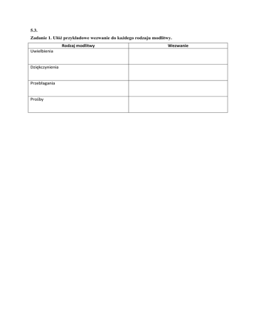 5.3. Zadanie 1. Ułóż przykładowe wezwanie do każdego rodzaju modlitwy. Rodzaj modlitwy Uwielbienia Dziękczynienia Przebłagania Prośby Wezwanie