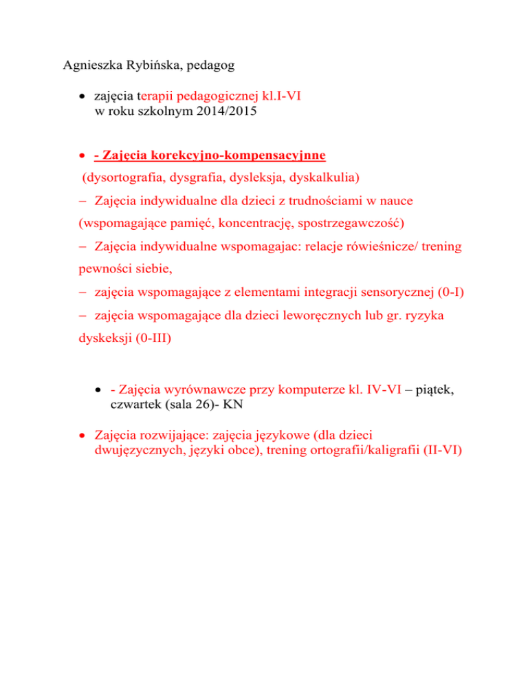 Agnieszka Rybińska, pedagog zajęcia terapii pedagogicznej kl.I-VI w roku szkolnym 2014/2015 - Zajęcia korekcyjno-kompensacyjnne (dysortografia, dysgrafia, dysleksja, dyskalkulia) Zajęcia indywidualne dla dzieci z trudnościami w nauce (wspomagające pamięć, koncentrację, spostrzegawczość) Zajęcia indywidualne wspomagajac: relacje rówieśnicze/ trening pewności siebie, zajęcia wspomagające z elementami integracji sensorycznej (0-I) zajęcia wspomagające dla dzieci leworęcznych lub gr. ryzyka dyskeksji (0-III) - Zajęcia wyrównawcze przy komputerze kl. IV-VI – piątek, czwartek (sala 26)- KN Zajęcia rozwijające: zajęcia językowe (dla dzieci dwujęzycznych, języki obce), trening ortografii/kaligrafii (II-VI)