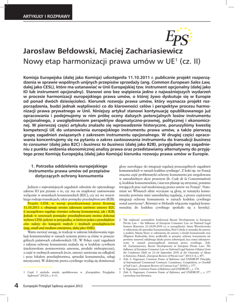 ARTYKUŁY I ROZPRAWY Jarosław Bełdowski, Maciej Zachariasiewicz Nowy etap harmonizacji prawa umów w UE1 (cz. II) Komisja Europejska (dalej jako Komisja) udostępniła 11.10.2011 r. publicznie projekt rozporządzenia w sprawie wspólnych unijnych przepisów sprzedaży (ang. Common European Sales Law, dalej jako CESL), które ma ustanawiać w Unii Europejskiej tzw. instrument opcjonalny (dalej jako IO lub instrument opcjonalny). Stanowi ono bez wątpienia jedno z najważniejszych wydarzeń w procesie harmonizacji europejskiego prawa umów, o której żywo dyskutuje się w Europie od ponad dwóch dziesięcioleci. Kierunek rozwoju prawa umów, który wyznacza projekt rozporządzenia, budzi jednak wątpliwości co do klarowności celów i perspektyw procesu harmonizacji prawa prywatnego w Unii. Niniejszy artykuł stanowi kontynuację opublikowanego już opracowania i podejmujemy w nim próbę oceny dalszych potencjalnych losów instrumentu opcjonalnego, z uwzględnieniem perspektyw dogmatyczno-prawnej, politycznej i ekonomicznej. W pierwszej części artykułu znalazło się wprowadzenie historyczne, poruszyliśmy kwestię kompetencji UE do ustanowienia europejskiego instrumentu prawa umów, a także pierwszą grupę zagadnień związanych z zakresem instrumentu opcjonalnego. W drugiej części opracowania koncentrujemy się na pytaniu o zakres zastosowania instrumentu do transakcji business to consumer (dalej jako B2C) i business to business (dalej jako B2B), przyglądamy się zagadnieniu z punktu widzenia ekonomicznej analizy prawa oraz przedstawiamy alternatywny do przyjętego przez Komisję Europejską (dalej jako Komisja) kierunku rozwoju prawa umów w Europie. 1. Potrzeba oddzielenia europejskiego instrumentu prawa umów od przepisów dotyczących ochrony konsumenta Jednym z najważniejszych zagadnień odnośnie do optymalnego zakresu IO jest pytanie o to, czy ma on znajdować zastosowanie wyłącznie w stosunkach konsumenckich (B2C), czy też we wszystkiego rodzaju transakcjach, także pomiędzy przedsiębiorcami (B2B). Projekt CESL w wersji przedstawionej przez Komisję 11.10.2011 r. obejmuje swoim zakresem zarówno umowy B2C (i szczegółowo reguluje również ochronę konsumenta), jak i B2B. Jednak w umowach pomiędzy przedsiębiorcami można dokonać wyboru CESL jedynie w przypadku, w którym jeden z przedsiębiorców należy do kategorii małych i średnich przedsiębiorców (ang. small and medium enterprises, dalej jako SME). Warto zwrócić uwagę, że tradycje w zakresie lokalizowania regulacji konsumenckiej w ramach systemu prawa są różne w poszczególnych państwach członkowskich UE. W Polsce część zagadnień z zakresu ochrony konsumenta znalazła się w kodeksie cywilnym (niedozwolone postanowienia umowne, produkt niebezpieczny), a część w osobnych ustawach (m.in. umowy zawierane na odległość i poza lokalem przedsiębiorstwa, sprzedaż konsumencka, usługi turystyczne). W doktrynie prawa cywilnego wydają się dominować 1 Część I artykułu została opublikowana w „Europejskim Przeglądzie Sądowym” 2012/6, s. 4–11. 4 Europejski Przegląd Sądowy sierpień 2012 głosy nawołujące do integracji regulacji poszczególnych zagadnień konsumenckich w ramach kodeksu cywilnego2. Z kolei np. we Francji znaczna część problematyki ochrony konsumenta jest uregulowana w samodzielnym akcie prawnym (fr. Code de la Consommation) tj. kodeksie konsumenckim, i stan ten planuje się utrzymać, pomimo trwających prac nad modernizacją prawa umów we Francji3. Natomiast we Włoszech silnie wyrażane są głosy, że tematyka konsumencka powinna mieć samodzielną regulację, a proces częściowej integracji ochrony konsumenta w ramach kodeksu cywilnego został zawrócony4. Również w Holandii włączenie regulacji konsumenckiej do kodeksu cywilnego spotkało się z krytyką5. 2 Tak większość uczestników konferencji Recent Developments in European Private Law – the Influence of European Consumer Law on National Legal Systems (Katowice 23–24.09.2010 r.), w szczególności: Aneta Wiewiórowska w odniesieniu do sprzedaży konsumenckiej, Piotr Cybula w stosunku do umowy o podróż, Maciej Skory w odniesieniu do umowy o kredyt konsumencki oraz Zbigniew Radwański, który podkreślił, że przepisy ochrony konsumenta nie powinny stanowić odrębnego działu prawa zobowiązań, lecz zostać inkorporowane w ramach poszczególnych instytucji prawa cywilnego. Zob. M. Zachariasiewicz, Recent Developments in European Private Law: The Influence of European Consumer Law on National Legal Systems A Report from the Conference Held on 23–24 September 2010 at the University of Silesia in Katowice, Poland, „European Review of Private Law” 2011/3–4, s. 497. 3 Zob. S. Vogenauer, Common Frame of Reference and UNIDROIT Principles of International Commercial Contracts: Coexistence, Competition, or Overkill of Soft Law?, „European Review of Contract Law” 2010/2, s. 177. 4 S. Vogenauer, Common Frame of Reference and UNIDROIT..., s. 178. 5 Zob. S. Vogenauer, Common Frame of Reference and UNIDROIT..., s. 177 i powołana tam literatura. ARTYKUŁY I ROZPRAWY Nie istnieje zatem jednolity sposób rozstrzygania omawianej kwestii w państwach członkowskich, z czego można pośrednio także wnosić, że w różnych krajach sprawdzają się różne rozwiązania6. Powracając do oceny zakresu instrumentu opcjonalnego, z jednej strony, należy podzielić tradycyjny punkt widzenia, zgodnie z którym podstawowe zasady i normy prawa cywilnego mają charakter uniwersalny i znajdują bez różnicy zastosowanie do wszystkiego rodzaju stosunków (zarówno B2C, B2B, jak i w innych przypadkach niemieszczących się w tych dwóch grupach, np. osoba fizyczna zawiera umowę z inną osobą fizyczną – określane czasem jako transakcje consumer to consumer, dalej jako C2C). Zaś przepisy dotyczące ochrony konsumenta to szczegółowe normy regulujące określone problemy i przewidujące dodatkow