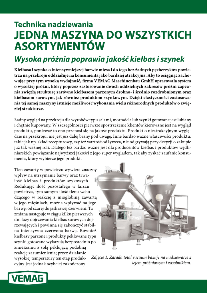 Technika nadziewania JEDNA MASZYNA DO WSZYSTKICH ASORTYMENTÓW Wysoka próżnia poprawia jakość kiełbas i szynek Kiełbasa i szynka o intensywniejszej barwie mięsa i do tego bez żadnych pęcherzyków powietrza na przekroju oddziałuje na konsumenta jako bardziej atrakcyjna. Aby to osiągnąć zachowując przy tym wysoką wydajność, firma VEMAG Maschinenbau GmbH opracowała system o wysokiej próżni, który poprzez zastosowanie dwóch oddzielnych zakresów próżni zapewnia zwięzłą strukturę zarówno kiełbasom parzonym drobno- i średnio rozdrobnionym oraz kiełbasom surowym, jak również produktom szynkowym. Dzięki elastyczności zastosowania tej samej maszyny istnieje możliwość wykonania wielu różnorodnych produktów o zwięzłej strukturze. Ładny wygląd na przekroju dla wyrobów typu salami, mortadela lub szynki gotowane jest lubiany i chętnie kupowany. W szczególności pierwsze spostrzeżenie klientów kierowane jest na wygląd produktu, ponieważ to ono przenosi się na jakość produktu. Produkt o nieatrakcyjnym wyglądzie na przekroju, nie jest już dalej brany pod uwagę. Inne bardzo ważne właściwości produktu, takie jak np. skład recepturowy, czy też wartość odżywcza, nie odgrywają przy decyzji o zakupie już tak ważnej roli. Dlatego też bardzo ważne jest dla producentów kiełbas i produktów wędliniarskich powiązanie najwyższej jakości z jego super wyglądem, tak aby zyskać zaufanie konsumenta, który wybierze jego produkt. Tlen zawarty w powietrzu wywiera znaczny wpływ na utrzymanie barwy oraz trwałość kiełbas i produktów szykowych. Redukując ilość pozostałego w farszu powietrza, tym samym ilość tlenu wchodzącego w reakcję z mioglobiną zawartą w jego mięśniach, można wpływać na jego barwę: od szarej do jaskrawej czerwieni. Ta zmiana następuje w ciągu kilku pierwszych dni fazy dojrzewania kiełbas surowych dojrzewających i powinna się zakończyć stabilną intensywną czerwoną barwą. Również kiełbasy parzone i produkty peklowane typu szynki gotowane wykazują bezpośrednio po zmieszaniu z solą peklującą podobną reakcję zarumienienia; przez działanie wysokiej temperatury ten etap produk- Zdjęcie 1: Zasada total vacuum bazuje na nadziewarce z lejem próżniowym i zasobnikiem. cyjny jest jednak szybciej zakończony. Im wyższy udział barwy szarej jest na etapie peklowania, tym bardziej matowa i mniej czerwona będzie barwa produktów gotowych na przekroju. Ponieważ zawartość powietrza wpływa na zwiększanie się barwy szarej, dlatego też należy go maksymalnie eliminować, aby nie zakłócać powstawania barwy czerwonej, pozwalając uzyskać odpowiedni wygląd produktu. Wysoka próżnia zmniejsza niekorzystny wpływ powietrza Aby otrzymać ścisłe i intensywnie odpowietrzone farsze kiełbasiane i produkty typu szynki peklowane i gotowane, firma VEMAG wprowadziła nową koncepcję maszyn z dwoma niezależnymi zakresami próżni, oddzielnie sterowanymi, dającymi się przez to optymalnie dopasować do rodzaju farszu. Oprócz istniejącego dotychczas w nadziewarkach VEMAG systemu próżniowego ślimakowej pompy farszu, w nadziewarkach TOTAL VACUUM zastosowano lej próżniowy zamiast otwartego. Lej próżniowy połączony jest przewodem o dużej średnicy ze zbiornikiem zasypowym (zdj. 1). Dzięki lejowi próżniowemu farsz pozostaje znacznie dłużej pod działaniem próżni niż w standardowej maszynie z otwartym lejem. Ten dodatkowy czas intensyfikuje odpowietrzające działanie drugiego systemu próżniowego, zaciągając podciśnieniem produkt do leja i dalej z pomocą drugiego systemu przemieszczając go do wylotu . W taki sam sposób doprowadzane i odpowietrzane są produkty szynkowe na bazie mięśni o dużych kawałkach, eliminując w nich do minimum zawartość powietrza. Coraz bardziej zwarta konsystencja produktów Im większa jest próżnia i dłuższy czas jej działania, tym bardziej zwarta jest konsystencja gotowego produktu. W zależności od prędkości nadziewania podciśnienie działa na przemieszczany w czasie nadziewania produkt zaledwie w czasie kilku sekund; dzięki dużemu lejowi próżniowemu czas działania próżni przedłuża się do kilku minut. Dlatego też konsystencja produktów staje się bardziej zwarta. Poprzez zmniejszenie objętości farszu wzrasta też zwartość. Z tego względu przy porównywalnych szarżach zużywa się znacząco mniej folii lub osłonek, co szczególnie przy produkcji kosztownych wyrobów może być decydującym czynnikiem ekonomicznym. Praca przy ciągłym podawaniu produktu zwiększa wydajność Połączony z lejem próżniowym zasobnik znacznie zwiększa pojemność bufora na farsz. Czujnik napełnienia leja próżniowego w sposób ciągły kontroluje wysokość farszu lub mięsa w leju i automatycznie daje sygnał do podawania następnej porcji z połączonego rurą zbiornika zapasowego, kiedy poziom napełnienia spadnie poniżej określonej wysokości. Zdjęcie 2: W porównaniu do produktu standardowego (lewe zdjęcie) serwolatka wyprodukowana w systemie total vacuum ma intensywniejszy kolor. Jeżeli operator nie chce otwierać pokrywy leja w trybie automatycznym, może to uczynić za pomocą przycisku i nie musi wykonywać żadnej dodatkowej pracy. Opatentowany napęd Duo Drive, w skład którego wchodzi niezależny napęd krzywki podającej w leju i ślimakowej pompy farszu, będący u Vemaga standardem we wszystkich nadziewarkach serii E, umożliwia optymalne dopasowanie i przekazanie niezbędnej ilości farszu z leja do ślimaków, aby zagwarantować najlepszą jakość produktu przy wysokiej wydajności pracy pompy farszu. Napęd ten jest zaletą w stosunku do konkurencyjnych rozwiązań tego typu maszyn, w których aby taki efekt osiągnąć, niezbędne jest zastosowanie w leju dodatkowego ślimaka doprowadzającego. Ślimak ten musi być każdorazowo wyjmowany do mycia, co zwiększa nakład pracy przy montażu i demontażu. Nies