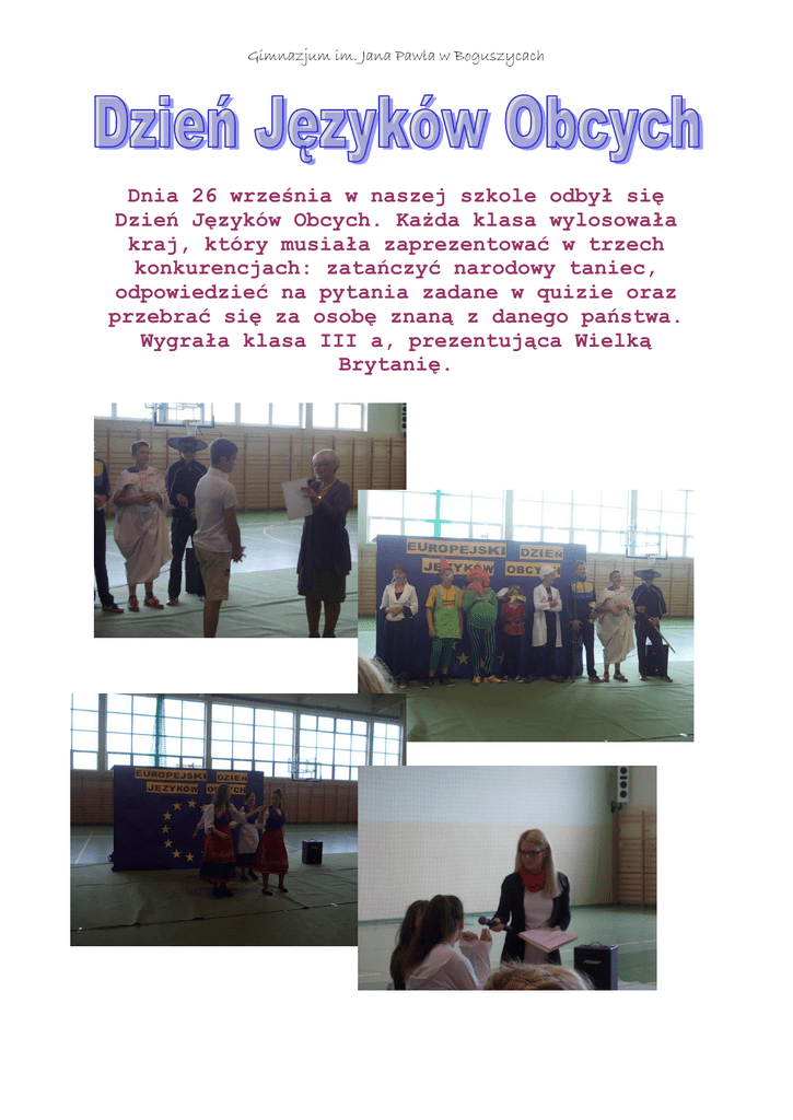 Gimnazjum im. Jana Pawła w Boguszycach Dnia 26 września w naszej szkole odbył się Dzień Języków Obcych. Każda klasa wylosowała kraj, który musiała zaprezentować w trzech konkurencjach: zatańczyć narodowy taniec, odpowiedzieć na pytania zadane w quizie oraz przebrać się za osobę znaną z danego państwa. Wygrała klasa III a, prezentująca Wielką Brytanię. Gimnazjum im. Jana Pawła w Boguszycach Człowiek z pasją… Pan Adrian Derda Dwunastego września naszą szkołę odwiedził pan Adrian Derda, miłośnik motoryzacji. Opowiedział trzecioklasistom o swoim hobby, pokazał zbudowany przez siebie motocykl oraz prezentację ze zdjęciami poszczególnych etapów powstawania pojazdu. Zapraszamy do przeczytania wywiadu! Uczniowie: Jak rozpoczęła się Pana pasja? Pan Adrian Derda: Moja pasja rozpoczęła się w dniu, gdy mój tata sprowadził dla mnie motor z zagranicy. U: Jakie było Pana największe marzenie? A.D: Zawsze marzyłem o samodzielnej budowie motocykla i samochodu. U: Ile czasu zajęło panu zrobienie motoru? A.D: Motor robiłem cały rok. Zawsze, gdy miałem wolną chwilę szedłem do garażu i tam działałem. U: Co pan zrobił, aby motor szybciej jeździł? A.D: Zmieniłem ramy na aluminiowe, a w kołach zamontowałem szprychy. U: Czemu zawdzięcza pan swój sukces? A.D: Bez fizyki, matematyki, języka angielskiego i wiedzy z innych przedmiotów nic bym nie zrobił... Gimnazjum im. Jana Pawła w Boguszycach