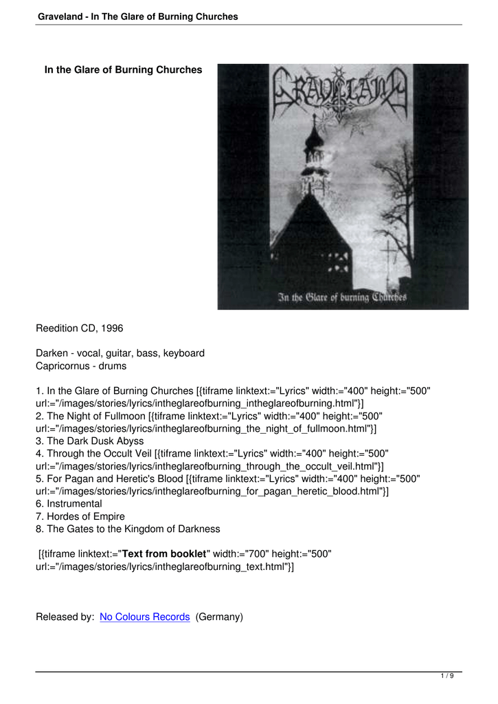 1. In the Glare of Burning Churches [{tiframe linktext:="Lyrics" width:="400" height:="500"