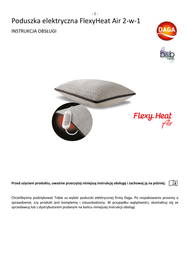 -1- Poduszka elektryczna FlexyHeat Air 2-w-1 INSTRUKCJA OBSŁUGI Przed użyciem produktu, uważnie przeczytaj niniejszą instrukcję obsługę i zachowaj ją na później. Chcielibyśmy podziękować Tobie za wybór poduszki elektrycznej firmy Daga. Po rozpakowaniu prosimy o sprawdzenie, czy produkt jest kompletny i nieuszkodzony. W przypadku wątpliwości, skontaktuj się ze sprzedawcą lub z dystrybutorem podanym na końcu niniejszej instrukcji obsługi. -2- Ważne uwagi Uruchamianie: Przed podłączeniem urządzenia do prądu, sprawdź czy napięcie w sieci zasilającej jest takie samo, jak na oznaczeniu widocznym przy. Jeśli urządzenie posiada odłączany sterownik, używaj tylko takiego sterownika, który został dostarczony wraz z urządzeniem. Nie zastępuj go sterownikiem od innych urządzeń. Ważne jest, aby kabel połączeniowy nie był skręcony i nie leżał na urządzeniu podczas działania. Nie ciągnij za kabel, aby go odłączyć i nie wykorzystuj go jako uchwyt. Warunki prawidłowej eksploatacji urządzenia: Nie zaginaj na siłę elementów grzewczych, aby uniknąć tworzenia się trwałych załamań. Nie wkładaj do elementu grzewczego pinesek, igieł i innych ostrych przedmiotów. Nie zakrywaj urządzenia innymi przedmiotami podczas działania i nie umieszczaj go nad innymi urządzeniami grzewczymi. Nie używaj urządzenia, jeśli zostało zamoczone i jest wilgotne. Poczekaj, aż wyschnie. W celu wykonania czyszczenia urządzenia, postępuj zgodnie z rozdziałem „Czyszczenie i konserwacja”. Podczas działania urządzenia, nie przykrywaj go innymi urządzeniami grzewczymi. Ostrzeżenia: W przypadku osób niepełnosprawnych, z nadwrażliwością na ciepło, zarówno u dzieci jak i dorosłych, używaj urządzenia pod odpowiednim bezpośrednim nadzorem innej osoby. Nie powinno się używać tego urządzenia u dzieci poniżej trzeciego roku życia, gdyż nie posiadają one zdolności reagowania na przegrzanie. U starszych dzieci, urządzenie może być stosowane, ale pod warunkiem, że urządzenie zostało wcześniej wstępnie ustawione przez rodzica lub opiekuna lub dziecko zostało przynajmniej dobrze poinstruowane, jak używać sterownika w przypadku niebezpieczeństwa. Urządzenie nie powinno być stosowane u osób o ograniczonej wrażliwości na ciepło lub u osób, które nie są zdolne zareagować na przegrzanie. Nie używaj urządzenia do ogrzewania zwierząt. Pomimo tego, że po pewnej chwili od momentu włączenia, temperatura się zmniejszy oraz zadziała po jakimś czasie automatyczne wyłączenie, to przy długim czasie używania, ustaw minimalny poziom temperatury (poziom 1). Urządzenie nie jest przeznaczone do zastosowań medycznych w warunkach szpitalnych. Poduszka może być napełniana wyłącznie powietrzem. W żadnym wypadku nie wolno stosować tu takich gazów, jak hel, czy azot oraz gazów w postaci płynnej. Poduszka może być nadmuchiwana powietrzem z płuc lub za pomocą ręcznej pompki. Nie zalecamy stosowania pompek automatycznych (elektrycznych) z uwagi na ryzyko pęknięcia poduszki pod wpływem zbyt dużego ciśnienia. Urządzenie wykonane jest z materiałów, które po długim czasie eksploatacji mogą nosić ślady zużycia. Często sprawdzaj urządzenie, jego sterownik, kabel i elementy grzewcze, czy nie posiadają oznak zużycia lub uszkodzeń. Jeśli zostaną one zauważone, przestań używać urządzenia i skontaktuj się z autoryzowanym serwisem. W przypadku nieprawidłowej eksploatacji urządzenia, nie będzie ono podlegało gwarancji. Producent nie bierze odpowiedzialności za ewentualne szkody, które mogą przytrafić się użytkownikom, zwierzętom lub przedmiotom w przypadku nie zastosowania się do powyższych ostrzeżeń. -3- Instrukcja stosowania Opisane wcześniej środki ostrożności muszą być brane pod uwagę we wszystkich poniższych krokach. To urządzenie może być używane zarówno jako konwencjonalna mata rozgrzewająca (na płasko) oraz jako poduszka (po nadmuchaniu). Grubość poduszki zależy od stopnia nadmuchania zgodnie z własnymi preferencjami, przy czym pamiętaj, aby poduszka nie była nadmuchana zbyt mocno (patrz wcześniejsze ostrzeżenia). W celu nadmuchania poduszki, ściśnij lekko palcami podstawę zaworu powietrza, aż poczujesz wdmuchiwane do środka powietrze. W podobny sposób możesz opróżnić poduszkę z nadmiaru pozostającego w niej powietrza. Uciskaj ją wtedy na całej powierzchni, aż całe powietrze wydostanie się na zewnątrz. 1. Podłącz poduszkę do sieci zasilającej. 2. Aby włączyć grzanie, przesuń na sterowniku przełącznik na pozycję 1, 2 lub 3 (jak na rysunku). 3. Maksymalny czas działania urządzenia wynosi 90 minut, po czym zostanie aktywowane automatyczne wyłączenie. Urządzenie w tej pozycji nie będzie już grzać. 4. Jeśli chcesz wcześniej zakończyć grzanie, ustaw przełącznik w pozycję „0” (zanim urządzenie zostanie odłączone od zasilania). Przechowywanie poduszki Zanim odłożysz poduszkę do przechowania, wypuść z niej całkowicie powietrze, odłącz wszystkie przewody i odczekaj aż poduszka schłodzi się. Przechowuj urządzenie w jego oryginalnym opakowaniu i umieść w suchym miejscu, bez pofałdować i zagięć. Nie umieszczaj na urządzeniu żadnych ciężkich przedmiotów. Czyszczenie i konserwacja Poduszka może być prana ręcznie lub w pralce z użyciem łagodnych środków piorących (np. mydło) w temperaturze nie przekraczającej 30 °C. Przy praniu w pralce, wybierz program prania dla tkanin delikatnych. Nie wolno wirować. Nie stosuj środków wybielających. Nie wolno prać chemicznie. Nie wolno prasować. Gwarancja Produkt objęty jest 2-letnią gwarancją producenta licząc od daty zakupu. Gwarancja nie obejmuje uszkodzeń spowodowanych nieprawidłowym użytkowaniem urządzenia nie opisanym w dokumentacji, przypadkowymi awariami (upuszczenie, spalenie, zamoczenie itp.), samodzielnymi modyfikacjami, naprawami, złym obc