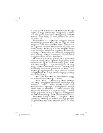 w Ŝaden sposób manipulować ich działaniami. Na ogół jedyne, co mogę zrobić dzięki swojej mocy, to zamieszać im w głowie, zamazać odrobinę granicę pomiędzy dobrem a złem. KaŜdy, kto mówi, Ŝe szatan mu coś kazał, wciska kit. Przechadzam się korytarzem, wciągając zapachy nastoletniego grzechu, tak gęste, Ŝe czuję ich smak. Wszystkie sześć moich zmysłów wrze z oczekiwania. Bo ta podróŜ jest inna. Przybyłem tu po jedną konkretną duszę i kiedy idę w stronę budynku numer sześć, przeszywa mnie trzask rozpalonej do czerwoności energii — dobry znak. Nie spieszę się, sunąc powoli przez chmarę i badając perspektywy, aŜ docieram do klasy jako ostatni, równo z dzwonkiem. W sali 616 jest równie ponuro jak w pozostałych częściach szkoły, ale poczyniono przynajmniej próby udekorowania jej. Na ścianach widnieją grafiki na temat sztuk Szekspira — wyłącznie tragedii, tak swoją drogą. Ławki są zestawione po dwie i niemal pełne. Podchodzę środkowym przejściem do biurka pana Snydera, podaję swój rozkład zajęć. Odwraca ku mnie szczupłą twarz. Na samym czubku długiego, prostego nosa tkwią okulary. — Luc Cain. Potrzebne mi potwierdzenie przyjęcia na zajęcia czy coś takiego — mówię. — Cain... Cain... — Przeczesuje dłonią rzednące siwe włosy i przegląda listę uczniów, aŜ znajduje moje nazwisko. — Jesteś. — Podaje mi Ŝółty świstek, zeszyt do wypracowań i egzemplarz „Gron gniewu”, po czym znowu zerka do dziennika. — Dobra, siądziesz między panem Butlerem a panną Cavanaugh. — Potem wstaje, poprawia okulary i wygładza niewygładzalne fałdy swoich białej koszuli oraz mundurka khaki. — No dobrze, proszę państwa... — oznajmia. — Przesiadamy się. Wszyscy, od panny Cavanaugh poczynając, przesiadają się o jedno miejsce w prawo. Do końca 12 Demony.indd 12 11-08-30 13:34