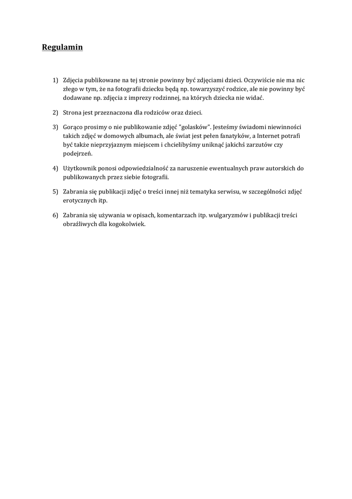 Regulamin 1) Zdjęcia publikowane na tej stronie powinny być zdjęciami dzieci. Oczywiście nie ma nic złego w tym, że na fotografii dziecku będą np. towarzyszyć rodzice, ale nie powinny być dodawane np. zdjęcia z imprezy rodzinnej, na których dziecka nie widać. 2) Strona jest przeznaczona dla rodziców oraz dzieci. 3) Gorąco prosimy o nie publikowanie zdjęć "golasków". Jesteśmy świadomi niewinności takich zdjęć w domowych albumach, ale świat jest pełen fanatyków, a Internet potrafi być także nieprzyjaznym miejscem i chcielibyśmy uniknąć jakichś zarzutów czy podejrzeń. 4) Użytkownik ponosi odpowiedzialność za naruszenie ewentualnych praw autorskich do publikowanych przez siebie fotografii. 5) Zabrania się publikacji zdjęć o treści innej niż tematyka serwisu, w szczególności zdjęć erotycznych itp. 6) Zabrania się używania w opisach, komentarzach itp. wulgaryzmów i publikacji treści obraźliwych dla kogokolwiek.
