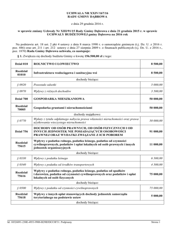 UCHWAŁA NR XXIV/167/16 RADY GMINY DĄBROWA z dnia 29 grudnia 2016 r. w sprawie zmiany Uchwały Nr XIII/91/15 Rady Gminy Dąbrowa z dnia 21 grudnia 2015 r. w sprawie UCHWAŁY BUDŻETOWEJ gminy Dąbrowa na 2016 rok Na podstawie art. 18 ust. 2 pkt 4 ustawy z dnia 8 marca 1990 r. o samorządzie gminnym (t.j. Dz. U. z 2016 r. poz. 446) oraz art. 211 i art. 212 ustawy z dnia 27 sierpnia 2009 r. o finansach publicznych (t.j. Dz. U. z 2016 r., poz. 1870) Rada Gminy Dąbrowa uchwala, co nastepuje: § 1. Zwiększa się dochody budżetu Gminy o kwotę 156.500,00 zł z tego: Dział 010 ROLNICTWO I ŁOWIECTWO 8 500,00 Rozdział 01010 Infrastruktura wodociągowa i sanitacyjna wsi 8 500,00 dochody bieżące: § 0920 Pozostałe odsetki 5 000,00 § 0970 Wpływy z różnych dochodów 3 500,00 Dział 700 GOSPODARKA MIESZKANIOWA 50 000,00 Rozdział 70005 Gospodarka gruntami i nieruchomościami 50 000,00 dochody majątkowe: Wpłaty z tytułu odpłatnego nabycia prawa własności nieruchomości oraz prawa użytkowania wieczystego nieruchomości 50 000,00 Dział 756 DOCHODY OD OSÓB PRAWNYCH, OD OSÓB FIZYCZNYCH I OD INNYCH JEDNOSTEK NIE POSIADAJĄCYCH OSOBOWOŚCI PRAWNEJ ORAZ WYDATKI ZWIĄZANE Z ICH POBOREM 91 000,00 Rozdział 75615 Wpływy z podatku rolnego, podatku leśnego, podatku od czynności cywilnoprawnych, podatków i opłat lokalnych od osób prawnych i innych jednostek organizacyjnych 11 000,00 § 0770 dochody bieżące: § 0330 Wpływy z podatku leśnego 6 500,00 § 0340 Wpływy z podatku od środków transportowych 4 500,00 Rozdział 75616 Wpływy z podatku rolnego, podatku leśnego, podatku od spadków i darowizn, podatku od czynności cywilnoprawnych oraz podatków i opłat lokalnych od osób fizycznych 75 000,00 dochody bieżące: § 0500 Rozdział 75618 Wpływy z podatku od czynności cywilnoprawnych Wpływy z innych opłat stanowiących dochody jednostek samorządu terytorialnego na podstawie ustaw 75 000,00 5 000,00 dochody bieżące: Id: 10526891-230E-4953-9908-B29B5DCC0F31. Podpisany Strona 1 § 0410 Wpływy z opłaty skarbowej 5 000,00 Dział 852 POMOC SPOŁECZNA 7 000,00 Rozdział 85216 Zasiłki stałe 7 000,00 dochody bieżące: § 0970 Wpływy z różnych dochodów 7 000,00 § 2. Zmniejsza się dochody budżetu Gminy o kwotę 120.000,00 zł z tego: Dział 756 DOCHODY OD OSÓB PRAWNYCH, OD OSÓB FIZYCZNYCH I OD INNYCH JEDNOSTEK NIE POSIADAJĄCYCH OSOBOWOŚCI PRAWNEJ ORAZ WYDATKI ZWIĄZANE Z ICH POBOREM Rozdział 75615 Wpływy z podatku rolnego, podatku leśnego, podatku od czynności cywilnoprawnych, podatków i opłat lokalnych od osób prawnych i innych jednostek organizacyjnych 120 000,00 50 000,00 dochody bieżące: § 0310 Rozdział 75616 Wpływy z podatku od nieruchomości 50 000,00 Wpływy z podatku rolnego, podatku leśnego, podatku od spadków i darowizn, podatku od czynności cywilnoprawnych oraz podatków i opłat lokalnych od osób fizycznych 70 000,00 dochody bieżące: § 0340 Wpływy z podatku od środków transportowych § 0360 Wpływy z podatku od spadków i darowizn 5 000,00 65 000,00 § 3. Zmniejsza się wydatki budżetu Gminy o kwotę 63.063,10 zł z tego: Dział 754 BEZPIECZEŃSTWO PUBLICZNE I OCHRONA PRZECIWPOŻAROWA 30 000,00 Rozdział 75412 Ochotnicze straże pożarne 30 000,00 wydatki bieżące, w tym: zadania związane z realizacją zadań statutowych 30 000,00 Dział 801 OŚWIATA I WYCHOWANIE 21 000,00 Rozdział 80101 Szkoły podstawowe 10 000,00 wydatki bieżące, w tym: zadania związane z realizacją zadań statutowych Rozdział 80110 Gimnazja 5 000,00 wydatki bieżące, w tym: zadania związane z realizacją zadań statutowych Rozdział 80113 10 000,00 Dowożenie uczniów do szkół 5 000,00 6 000,00 wydatki bieżące, w tym: Id: 10526891-230E-4953-9908-B29B5DCC0F31. Podpisany Strona 2 zadania związane z realizacją zadań statutowych 6 000,00 Dział 900 GOSPODARKA KOMUNALNA I OCHRONA ŚRODOWISKA 12 063,10 Rozdział 90004 Utrzymanie zieleni w miastach i gminach 12 063,10 wydatki bieżące, w tym: zadania związane z realizacją zadań statutowych 12 063,10 § 4. Zwiększa się wydatki budżetu Gminy o kwotę 99.563,10 zł z tego: Dział 010 ROLNICTWO I ŁOWIECTWO 1 000,00 Rozdział 01030 Izby rolnicze 1 000,00 wydatki bieżące, w tym: zadania związane z realizacją zadań statutowych 1 000,00 Dział 600 TRANSPORT I ŁĄCZNOŚĆ 4 500,00 Rozdział 60016 Drogi publiczne gminne 4 500,00 wydatki bieżące, w tym: zadania związane z realizacją zadań statutowych 4 500,00 Dział 750 ADMINISTRACJA PUBLICZNA 71 500,00 Rozdział 75023 Urzędy gmin 56 000,00 wydatki bieżące, w tym: zadania związane z realizacją zadań statutowych świadczenia na rzecz osób fizycznych Rozdział 75075 Promocja jednostek samorządu terytorialnego wydatki bieżące, w tym: zadania związane z realizacją zadań statutowych Rozdział 75095 Pozostała działalność wydatki bieżące, w tym: zadania związane z realizacją zadań statutowych 50 000,00 6 000,00 5 500,00 5 500,00 10 000,00 10 000,00 Dział 852 POMOC SPOŁECZNA 7 000,00 Rozdział 85202 Domy pomocy społecznej 7 000,00 wydatki bieżące, w tym: zadania związane z realizacją zadań statutowych Dział 900 GOSPODARKA KOMUNALNA I OCHRONA ŚRODOWISKA Id: 10526891-230E-4953-9908-B29B5DCC0F31. Podpisany 7 000,00 12 063,10 Strona 3 Rozdział 90004 Utrzymanie zieleni w miastach i gminach 12 063,10 wydatki majątkowe, w tym: inwestycje i zakupy inwestycyjne 921 Rozdział 92109 12 063,10 KULTURA I OCHRONA DZIEDZICTWA NARODOWEGO 3 500,00 Pozostała działalność 3 500,00 wydatki bieżące, w tym: zadania związane z realizacją zadań statutowych 3 500,00 § 5. Załącznik Nr 6 do Uchwały Nr XIII/91/15 Rady Gminy Dąbrowa z dnia 21 grudnia 2015 r. otrzymuje brzmienie zgodnie z załącznikiem Nr 1. § 6. Po wprowadzeniu zmian budżet gminy wynosi: Dochody 30 463 859,45 Przychody 1 066 908,22 RAZEM 31 530 767,67 Wydatki 30 450 256,62 Rozchody 1 080 511,05 RAZEM 31 530 767,67 § 7. Wykonanie uchwały powierza się Wójtowi G