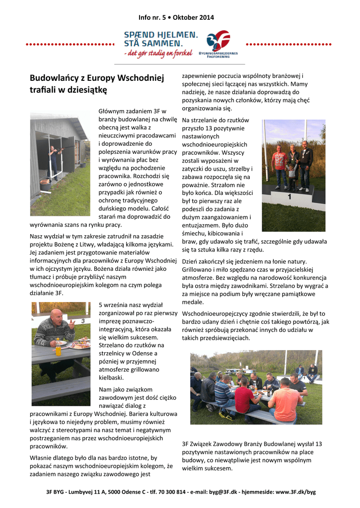 Info nr. 5 • Oktober 2014 ••••••••••••••••••••••••••••••••••••••••••••••••••••••••••••••••••••••••••••••••••••• Budowlańcy z Europy Wschodniej trafiali w dziesiątkę Głównym zadaniem 3F w branży budowlanej na chwilę obecną jest walka z nieuczciwymi pracodawcami i doprowadzenie do polepszenia warunków pracy i wyrównania płac bez względu na pochodzenie pracownika. Rozchodzi się zarówno o jednostkowe przypadki jak również o ochronę tradycyjnego duńskiego modelu. Całość starań ma doprowadzić do wyrównania szans na rynku pracy. Nasz wydział w tym zakresie zatrudnił na zasadzie projektu Bożenę z Litwy, władającą kilkoma językami. Jej zadaniem jest przygotowanie materiałów informacyjnych dla pracowników z Europy Wschodniej w ich ojczystym języku. Bożena działa również jako tłumacz i próbuje przybliżyć naszym wschodnioeuropiejskim kolegom na czym polega działanie 3F. 5 września nasz wydział zorganizował po raz pierwszy imprezę poznawczointegracyjną, która okazała się wielkim sukcesem. Strzelano do rzutków na strzelnicy w Odense a pózniej w przyjemnej atmosferze grillowano kielbaski. zapewnienie poczucia wspólnoty branżowej i społecznej sieci łączącej nas wszystkich. Mamy nadzieję, że nasze działania doprowadzą do pozyskania nowych członków, którzy mają chęć organizowania się. Na strzelanie do rzutków przyszło 13 pozytywnie nastawionych wschodnioeuropiejskich pracowników. Wszyscy zostali wyposażeni w zatyczki do uszu, strzelby i zabawa rozpoczęła się na poważnie. Strzałom nie było końca. Dla większości był to pierwszy raz ale podeszli do zadania z dużym zaangażowaniem i entuzjazmem. Było dużo śmiechu, kibicowania i braw, gdy udawało się trafić, szczególnie gdy udawała się ta sztuka kilka razy z rzędu. Dzień zakończył się jedzeniem na łonie natury. Grillowano i miło spędzano czas w przyjacielskiej atmosferze. Bez względu na narodowość konkurencja była ostra między zawodnikami. Strzelano by wygrać a za miejsce na podium były wręczane pamiątkowe medale. Wschodnioeuropejczycy zgodnie stwierdzili, że był to bardzo udany dzień i chętnie coś takiego powtórzą, jak również spróbują przekonać innych do udziału w takich przedsiewzięciach. Nam jako związkom zawodowym jest dość ciężko nawiązać dialog z pracownikami z Europy Wschodniej. Bariera kulturowa i językowa to niejedyny problem, musimy również walczyć z stereotypami na nasz temat i negatywnym postrzeganiem nas przez wschodnioeuropiejskich 3F Związek Zawodowy Branży Budowlanej wysłał 13 pracowników. pozytywnie nastawionych pracowników na place Własnie dlatego było dla nas bardzo istotne, by budowy, co niewątpliwie jest nowym wspólnym pokazać naszym wschodnioeuropiejskim kolegom, że wielkim sukcesem. zadaniem naszego związku zawodowego jest 3F BYG - Lumbyvej 11 A, 5000 Odense C - tlf. 70 300 814 - e-mail: [email protected] - hjemmeside: www.3F.dk/byg