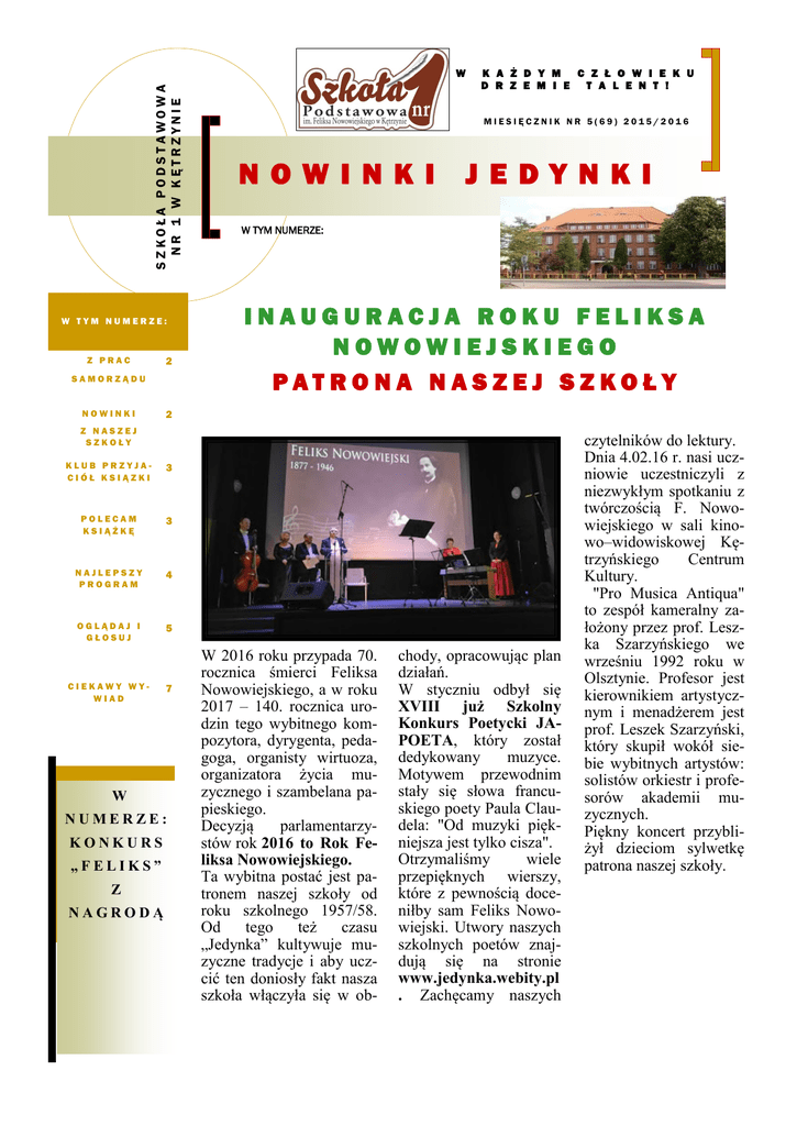 SZKOŁA PODSTAWOWA NR 1 W KĘTRZYNIE W W TYM NUMERZE: Z PRAC 2 SAMORZĄDU NOWINKI K A Ż D Y M C Z Ł O W I E K U D R Z E M I E T A L E N T ! MIESIĘCZNIK NR 5(69) 2015/2016 N OW I NK I J E DY N K I W TYM NUMERZE: INAUGURACJA ROKU FELIKSA NOWOWIEJSKIEGO PATRONA NASZEJ SZKOŁY 2 Z NASZEJ SZKOŁY KLUB PRZYJACIÓŁ KSIĄZKI 3 POLECAM KSIĄŻKĘ 3 NAJLEPSZY PROGRAM 4 OGLĄDAJ I GŁOSUJ 5 CIEKAWY WYWIAD 7 W NUMERZE: KONKURS „FELIKS” Z NAGRODĄ W 2016 roku przypada 70. rocznica śmierci Feliksa Nowowiejskiego, a w roku 2017 – 140. rocznica urodzin tego wybitnego kompozytora, dyrygenta, pedagoga, organisty wirtuoza, organizatora życia muzycznego i szambelana papieskiego. Decyzją parlamentarzystów rok 2016 to Rok Feliksa Nowowiejskiego. Ta wybitna postać jest patronem naszej szkoły od roku szkolnego 1957/58. Od tego też czasu „Jedynka” kultywuje muzyczne tradycje i aby uczcić ten doniosły fakt nasza szkoła włączyła się w ob- chody, opracowując plan działań. W styczniu odbył się XVIII już Szkolny Konkurs Poetycki JAPOETA, który został dedykowany muzyce. Motywem przewodnim stały się słowa francuskiego poety Paula Claudela: "Od muzyki piękniejsza jest tylko cisza". Otrzymaliśmy wiele przepięknych wierszy, które z pewnością doceniłby sam Feliks Nowowiejski. Utwory naszych szkolnych poetów znajdują się na stronie www.jedynka.webity.pl . Zachęcamy naszych czytelników do lektury. Dnia 4.02.16 r. nasi uczniowie uczestniczyli z niezwykłym spotkaniu z twórczością F. Nowowiejskiego w sali kinowo–widowiskowej Kętrzyńskiego Centrum Kultury. "Pro Musica Antiqua" to zespół kameralny założony przez prof. Leszka Szarzyńskiego we wrześniu 1992 roku w Olsztynie. Profesor jest kierownikiem artystycznym i menadżerem jest prof. Leszek Szarzyński, który skupił wokół siebie wybitnych artystów: solistów orkiestr i profesorów akademii muzycznych. Piękny koncert przybliżył dzieciom sylwetkę patrona naszej szkoły. NOWINKI JEDYNKI Str. 2 SAMORZĄD I WALENT YNKI Walentynki to międzynarodowe święto zakochanych przypadające 14 lutego. Nazwa pochodzi od św. Walentego, patrona zakochanych. W tym dniu Amory wyjmują swe łuki i strzelają miłosnymi strzałami, a wielbiciele wymieniają się prezentami. W naszej szkole działa „poczta walentynkowa”, która ma za zadanie roznosić walentynki zrobione przez uczniów. 14 lutego królują kolory miłości: czerwień i róż, oraz serca, które są symbolami walentynek. Myślę, że to sympatyczny czas, który łączy ludzi. Czasami wystarczy jeden uśmiech, by sprawić komuś przyjemność. Bądźmy tego dnia mili i przyjaźni dla wszystkich. Alicja Służała 4a Każdy dzień w roku powinien być doskonałą okazją do tego, by móc powiedzieć ukochanej osobie, jak bardzo nam na niej zależy. Dlatego życzymy Wam, aby każdy dzień był jak walentynki… WALENTYKNKI TO NASZE ULUBIONE ŚWIĘTO! NOWINKI Z NASZEJ SZKOŁY BAL I ZUCHY! Dnia 20.01.16 r. na naszej zbiórce odbył się pierwszy bal karnawałowy. Było kolorowo, gwarno i wesoło. Zuchy w pięknych karnawałowych strojach bawiły się przy skocznej muzyce. Tydzień wcześniej dzieci przygotowały specjalnie na ten dzień przepiękne maski, które własnoręcznie ozdobiły brokatem, kolorowymi piórkami oraz cekinowymi gwiazdkami. Świetnej zabawie towarzyszył śmiech. Justyna Krajewska KONKURSOWE ZMAGANIA Dnia 16.01.16 r. w KCK odbył się X Festiwal Kolęd i Pastorałek. Udział w nim wzięło siedmioro uczniów naszej szkoły. dy tylko usłyszałem muzykę i zacząłem śpiewać, z każdą minutą trema uciekała. Cieszę się, że mogłem wziąć udział w tym festiwalu i jednocześnie zachęcam wszystkich do występów za rok. Maciej Pędzich 3a Atmosfera była miła, a wszyscy soliści starali się wypaść jak najlepiej. Miałem niemałą tremę, ponieważ był to mój pierwszy występ solo. Do tej pory występowałem zawsze z koleżankami i kolegami, a tym razem musiałem poradzić sobie sam. Na szczęście, kie- MIESIĘCZNIK NR 5(69) 2015/2016 Str. 3 KLUB PRZYJACIÓŁ KSIĄŻKI KAMIL DYMIDZIUK 3b W tym numerze gazetki zachęcam Was do przeczytania książek Grzegorza Kasdepki, które wypożyczyłem w naszej bibliotece. „Bon czy ton. Savoir– vivre dla dzieci”. Książka zawiera ponad sto krótkich opowiadań, a bohaterami są przesympatyczne bliźnięta: dziewczynka Buba i chłopiec Kuba. Kuba i Buba otrzymują od babci Joasi książkę w której znajdują się zasady dobrego zachowania. W książce niesforne, ale urokliwe bliźnięta znajdują odpowiedzi, jak należy się zachowywać w różnych sytuacjach. Moim zdaniem jest ona zabawna, śmieszna, ale także pouczająca. Czytając i ja, i moja mama śmialiśmy się do łez. Chociaż autor skierował ją do najmłodszych dzieci, to także młodzież i dorośli mogą się z niej wiele nauczyć. Interesującą, wartą przeczytania książką Grzegorza Kasdepki jest także „Rok z Kubą i Bubą” Autor zebrał w niej w jedną całośc trzy opowieści wydane wcześniej. Historie krótkie, ale śmieszne rozbawią Was i doprowadzą do śmiechu, łez i bólu brzucha. W książce tej oprócz opowiadań autor opisał wiele pomysłów i pokazał jak można ciekawie spędzić wolny czas, np. robiąc sałatki, jak wykonując kartkę walentynkową, palcynki, lub maskę sylwestrową itp. Można się wiele nauczyć, korzystając z porad pisarza. W książce znajdują się też trudne słowa, a autor tłumaczy ich znaczenie lub podaje synonimy. Polecam tę książkę z całego serca, bo jest śmieszna, zabawna i wiele Was nauczy. Ilustracje wykonane przez Ewę Poklewską–Kozieło są proste, wyraziste i kolorowe, co wzbudza uwagę czytelnika, dlatego książkę czyta się szybko, łatwo i przyjemnie. Przeznaczona jest dla dziewczynek i dla chłopców. **** Wiktor Dwulat z klasy 4c zachęca do przeczytania serii książek "Dziennik Cwaniaczka" Jeffa Kinnneya. To ciekawe historie o życiu 13-