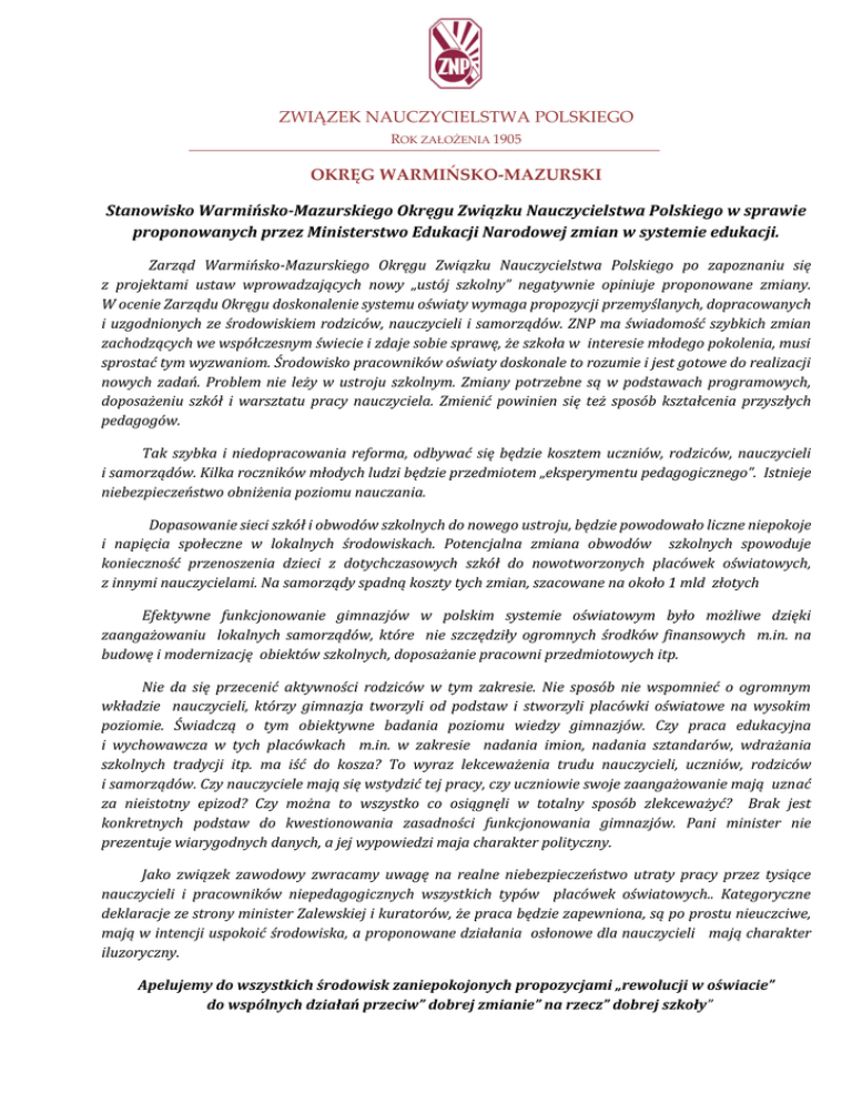 ZWIĄZEK NAUCZYCIELSTWA POLSKIEGO ROK ZAŁOŻENIA 1905 OKRĘG WARMIŃSKO-MAZURSKI Stanowisko Warmińsko-Mazurskiego Okręgu Związku Nauczycielstwa Polskiego w sprawie proponowanych przez Ministerstwo Edukacji Narodowej zmian w systemie edukacji. Zarząd Warmińsko-Mazurskiego Okręgu Związku Nauczycielstwa Polskiego po zapoznaniu się z projektami ustaw wprowadzających nowy „ustój szkolny” negatywnie opiniuje proponowane zmiany. W ocenie Zarządu Okręgu doskonalenie systemu oświaty wymaga propozycji przemyślanych, dopracowanych i uzgodnionych ze środowiskiem rodziców, nauczycieli i samorządów. ZNP ma świadomość szybkich zmian zachodzących we współczesnym świecie i zdaje sobie sprawę, że szkoła w interesie młodego pokolenia, musi sprostać tym wyzwaniom. Środowisko pracowników oświaty doskonale to rozumie i jest gotowe do realizacji nowych zadań. Problem nie leży w ustroju szkolnym. Zmiany potrzebne są w podstawach programowych, doposażeniu szkół i warsztatu pracy nauczyciela. Zmienić powinien się też sposób kształcenia przyszłych pedagogów. Tak szybka i niedopracowania reforma, odbywać się będzie kosztem uczniów, rodziców, nauczycieli i samorządów. Kilka roczników młodych ludzi będzie przedmiotem „eksperymentu pedagogicznego”. Istnieje niebezpieczeństwo obniżenia poziomu nauczania. Dopasowanie sieci szkół i obwodów szkolnych do nowego ustroju, będzie powodowało liczne niepokoje i napięcia społeczne w lokalnych środowiskach. Potencjalna zmiana obwodów szkolnych spowoduje konieczność przenoszenia dzieci z dotychczasowych szkół do nowotworzonych placówek oświatowych, z innymi nauczycielami. Na samorządy spadną koszty tych zmian, szacowane na około 1 mld złotych Efektywne funkcjonowanie gimnazjów w polskim systemie oświatowym było możliwe dzięki zaangażowaniu lokalnych samorządów, które nie szczędziły ogromnych środków finansowych m.in. na budowę i modernizację obiektów szkolnych, doposażanie pracowni przedmiotowych itp. Nie da się przecenić aktywności rodziców w tym zakresie. Nie sposób nie wspomnieć o ogromnym wkładzie nauczycieli, którzy gimnazja tworzyli od podstaw i stworzyli placówki oświatowe na wysokim poziomie. Świadczą o tym obiektywne badania poziomu wiedzy gimnazjów. Czy praca edukacyjna i wychowawcza w tych placówkach m.in. w zakresie nadania imion, nadania sztandarów, wdrażania szkolnych tradycji itp. ma iść do kosza? To wyraz lekceważenia trudu nauczycieli, uczniów, rodziców i samorządów. Czy nauczyciele mają się wstydzić tej pracy, czy uczniowie swoje zaangażowanie mają uznać za nieistotny epizod? Czy można to wszystko co osiągnęli w totalny sposób zlekceważyć? Brak jest konkretnych podstaw do kwestionowania zasadności funkcjonowania gimnazjów. Pani minister nie prezentuje wiarygodnych danych, a jej wypowiedzi maja charakter polityczny. Jako związek zawodowy zwracamy uwagę na realne niebezpieczeństwo utraty pracy przez tysiące nauczycieli i pracowników niepedagogicznych wszystkich typów placówek oświatowych.. Kategoryczne deklaracje ze strony minister Zalewskiej i kuratorów, że praca będzie zapewniona, są po prostu nieuczciwe, mają w intencji uspokoić środowiska, a proponowane działania osłonowe dla nauczycieli mają charakter iluzoryczny. Apelujemy do wszystkich środowisk zaniepokojonych propozycjami „rewolucji w oświacie” do wspólnych działań przeciw” dobrej zmianie” na rzecz” dobrej szkoły”