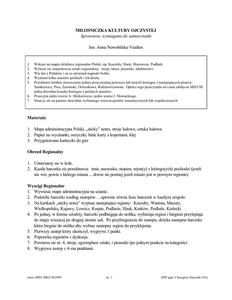 MILOSNICZKA KULTURY OJCZYSTEJ Sprawnosc wymagana do samarytanki hm. Anna Nowobilska-Vasilios 1. 2. 3. 4. 5. 6. 7. Wskaze na mapie dzielnice regionalne Polski, np. Kaszuby, Slask, Mazowsze, Podhale Wykaze sie znajomoscia sztuki regionalnej: stroje, tance, piosenki, zdobnictwo. Wie kto z Polaków i za co otrzymal nagrode Nobla. Wymieni kilku autorów polskich i ich dziela. Przedstawi krótkie streszczenie jednej przeczytanej powiesci lub noweli ktoregos z nastepujacych pisarzy: Sienkiewicz, Prus, Zeromski, Orzeszkowa, Rodziewiczówna. Oprócz tego przeczytala od czasu zdobycia MZO III jedna dowolna ksiazke któregos z polskich autorów. Przeczyta jeden wiersz A. Mickiewicza i jeden wiersz J. Slowackiego. Nauczy sie na pamiec dowolnie wybranego wiersza poetów romantycznych lub wspólczesnych. Materialy 1. Mapa administracyjna Polski, „sticky” notes, stroje ludowe, sztuka ludowa 2. Papier na wycinanki, nozyczki, biale karty z kopertami, klej 3. Przygotowane karteczki do gier Obrzed Regionalny 1. Ustawiamy sie w kole. 2. Kazda harcerka sie przedstawia: imie, nazwisko, stopien, rejon(y) z którego(ych) pochodzi (jezeli nie wie, powie z którego miasta ... dowie sie pozniej jezeli miasto jest w pewnym regionie) Wyscigi Regionalne 1. Wywiesic mape administracyjna na scianie. 2. Podzielic harcerki wedlug zastepów ... upewnic równa ilosc harcerek w kazdym zespole. 3. Na kartkach „sticky notes” wypisac nastepujace regiony: Kaszuby, Warmia, Mazury, Wielkopolska, Kujawy, Lowicz, Kurpie, Podlasie, Slask, Kraków, Podhale, Kielecki 4. Po jednej, w formie sztafety, harcerki podbiegaja do stolika, wybieraja region i biegiem przylepiaja do mapy wiszacej po drugiej stronie sali. Po przybiegnieciu do zastepu, dotyka nastepna harcerke która biegnie do stolika aby wybrac nastepny region do przyklejenia. 5. Pierwszy zastep który ukonczyl, wygrywa 1 punkt. 6. Poprawka regionów i dyskusja. 7. Powtarza sie nr. 4, stroje, egzemplaze sztuki, i piosenki (po jednym punkcie na kategorie) 8. Wygrywa zastep z 4-ma punktami. amnv:HIS5 MKO 062099 str. 1 ZHP-pgk; Choragiew Harcerek USA Region Kaszuby Warmia Mazury Wielkopolska Kujawy Lowicz Kurpie Podlasie Slask Kraków Strój Kaszubski Warminski Mazurski Wielkopolski Kujawski Lowicki Kurpiowski Podlaski Slaski Krakowski Podhale Kielecki Góralski Kielecki Sztuka Piosenka Czemu ty Dziewczyno Na Kujawach Zyczenie Wycinanka Szopka Krakowska Lajkonik Spinka Podhalanska Gliniane Figurki Wiazanka Cieszynska Plynie Wisla Hej Zarosly Polskie Nagrody Nobla 1. Podzielic harcerki na zespoly po 6 osób (najlepiej zastepami). 2. W kazdym zespole, harcerka otrzymuje kartke na której jest wypisany lauriat nagrody Nobla: Maria Sklodowska-Curie, Henryk Sienkiewicz, Wladyslaw Rejmont, Czeslaw Milosz, Lech Walesa, Wislawa Szymborska. Kazda sie staje ta osoba. 3. Podbiegaja do pierwszej stacji, wybieraja sposród nagród swoja nagrode: Chemia, Fizyka, Literatura, Literatura, Literatura, Literatura, Pokój. (moga nad tym pracowac razem) 4. Podbiegaja do drugiej stacji, wybieraja rok swojej nagrody: 1903, 1905, 1911, 1924, 1980, 1983, 1996 5. Podbiegaja do trzeciej stacji, wybieraja za co wygraly nagrode. 6. Podbiegaja do czwartej stacji, wybieraja przyklad tego, za co wygraly nagrode. 7. Po ukonczeniu, kazdy zastep sie uklada chronoligicznie, po koleji, przedstawiaja sie, swoja nagrode, rok zdobycia i za co. Zastepy sie nawzajem poprawiaja. Nagroda Fizyka Rok 1903 Henryk Sienkiewicz Chemia Literatura 1911 1905 Wladyslaw Rejmont Czeslaw Milosz Literatura Literatura 1924 1980 Maria SklodowskaCurie amnv:HIS5 MKO 062099 Za Co Wspólwynalazek promieniowania Wynalazek elementów Quo Vadis Chlopi Pisanie na temat losu czlowieka w swiecie pelnego srogich konfliktów str. 2 Inne Informacje Pierre Curie, Henri Becquerel Radium i Polonium Powiesc oparta na sledzeniu pierwszych chrescian w czasach rzymskich Wiersz, ponizej ZHP-pgk; Choragiew Harcerek USA Lech Walesa Nagroda Pokój Wislawa Szymborska Literatura Rok 1983 1996 Za Co dzialalnosc dla praw ludzkich Wiersze wylaniajace realnosc czlowiecza Inne Informacje Zalozyciel Solidarnosci Wiersz, ponizej Dwór Czeslaw Milosz (1993) Nie ma domu, jest park, choc stare drzewa wycieto I geszcz porasta slady dawnych sciezek. Rozebrano swiren, bialy, zamczysty, Ze sklepami czyli piwnicami w których staly pólki na jablka zimowe. Takie jak dawniej koleiny drogi w dól; Pamietalem gdzie skrecic ale nie poznalem rzeki; Jej kolor jak rdzawj somochodowej oliwy, Ani szuwarów, ani lilii wodnych. Przeminela lipowa aleja, niegdys droga pszczolom I sady, draina os i szerszeni opitych slodycza Zmurszaly i zapadly wie w oset i pokrzywy. To miejsce i ja, choc daleko stad, Równoczesnie, rok po koku, tracilismy liscie, Zasypywaly nas sniegi, ubywalo nas. I znów razem jestesmy, we wspólnej starosci. Interesuje mnie dymek, z rury zamiast komina, Nad baraczkiem skleconym niezgranie z desek i cegly W zieleni chwastów i krzaków * poznaje sambucus nigra, Chwala zyciu, za to ze trawa, ubogo, byle jak. Jedli te swoje kluski i kartofle I mieli przynajmniej czym palic w nasze dlugie zimy. sambucus nigra * dziki czarny bez Trzy slowa najdziwniejsze Wislawa Szymborska Kiedy wymawiam slowo Przyszlosc pierwsza sylaba odchodzi juz do przeszlosci Kiedy wymawiam slowo Cisza niszcze ja. Kiedy wymawiam slowo Nic stawrzam cos, co nie miesci sie w zadnym niebycie. amnv:HIS5 MKO 062099 str. 3 ZHP-pgk; Choragiew Harcerek USA Lancuch Literatury Polskiej 1. Siedzimy w kole, kazda pomysli o powiesci polskiej która pzeczytala lub w szkole przerobila. 2. Pierwsza harcerka sie przedstawia, mówi tytul przeczytanej ksiazki i temat w jednym zdaniu. 3. Nastepna harcerka powtarza to co pierwsza harcerka powiedziala, i dodaje imie autora. Wtenczas sie przedstawia i dodaje swoja ksiazke i streszczenie jedno-zdaniowe. 4. Tak sie ciagnie do samego konca. 5. Mozna sie powtarzac, mozna pomagac kolezankom. Przyklady: Adam Mickiewicz: Pan Tadeusz, Konrad Wallenrod, Dziady Juliusz Slowacki: Kor
